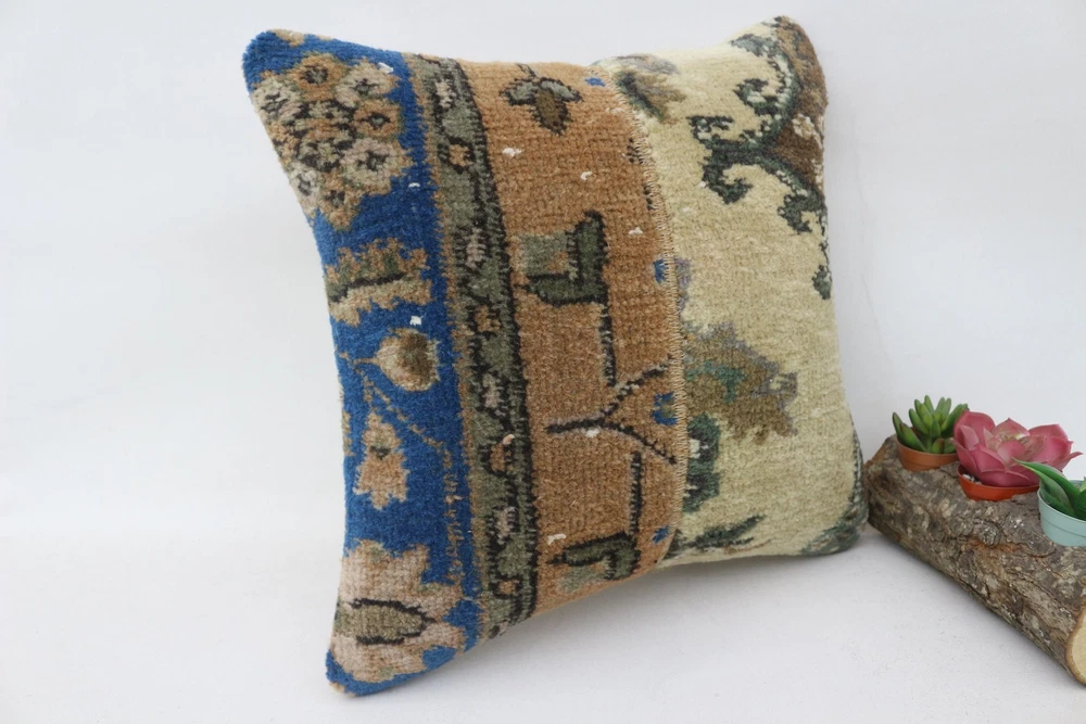Kilim Pillow Details: All of my beautiful pillow covers or cushion cases are designed and made by me. I am making my throw pillow covers from handmade vintage rugs, Turkish rugs. Therefore, each of my vintage kilim pillowcase is one of kind. These cushions covers are piece of an art. The size of this pillow is 14 x 14 inches or 35 x 35 cm. The front side of this decorative pillow cover, cushion cover is wool on wool vintage kilim rug. The backside of this throw is high quality cotton fabric with a high quality zipper. This listing has 2 option for this handmade pillow. You can choose with insert or without insert. The listing photos is with insert in the pillowcase which is just for demonstration purpose. All of my vintage Turkish rugs have been professionally washed before I cut them as pillow case or cushion case so these kilim covers are 100 posent clean and ready to use. Due to the age and handmade nature of these vintage rugs, there might be imperfections and flaws that are not considered defects. This is a piece of a handmade vintage rug with minor signs of wear consistent with age and use that give it an antique look. You can see the condition of the rug pillow clearly in the detailed photos. I am going to ship your order of decorative pillow as soon as possible. I usually ship in the next day with DHL Express or FedEx which will deliver the kilim pillow, cushion cover just in 3-5 business days. It is my responsible until you receive pillow cover or pillow cover with insert at your door. If the pillow cover or insert get lost or damage during the shipping, I will ship the new kilim pillow cover or pillow insert for free as soon as possible. I take photos of my throw pillows indoor with professional camera which shows the real colors. The photos of these Turkish pillow covers are not altered. Keep in mind the colors of the rug vary slightly in different lights. Please contact to me for additional photos. I take the photos of my vintage rugs outside with daylight to show you the real and natural colors. My photos are not altered. Keep in mind the colors of the rug vary slightly in different lights. Please contact to me for additional photos. SATISFACTION GUARANTEED for your order in my shop. Your SATISFACTION is the most important to me. Please write me if you have any question or if you don't like anything from my pillow covers, cushion covers. If any reason, you are not happy from your Turkish pillow cover, I accept return without any hassle. Please read my shop policies for details. This cushion case or pillow cover can be used as decorative throw pillow, gift pillow, Christmas pillow case, bedding pillow, lumbar pillow, sofa pillow, bohemian pillow, boho pillow. You can find in any kind of Turkish kilim pillow cover in different design such as striped pillow, embroidered pillow, and geometric pillow.