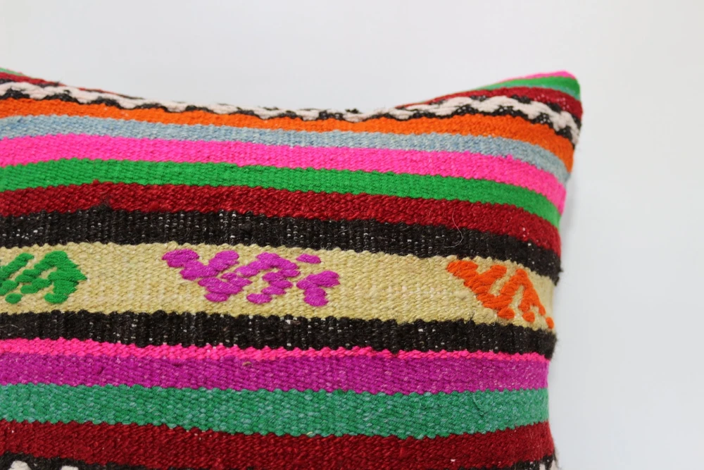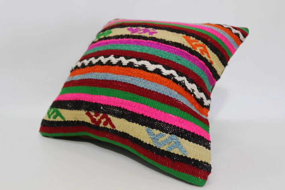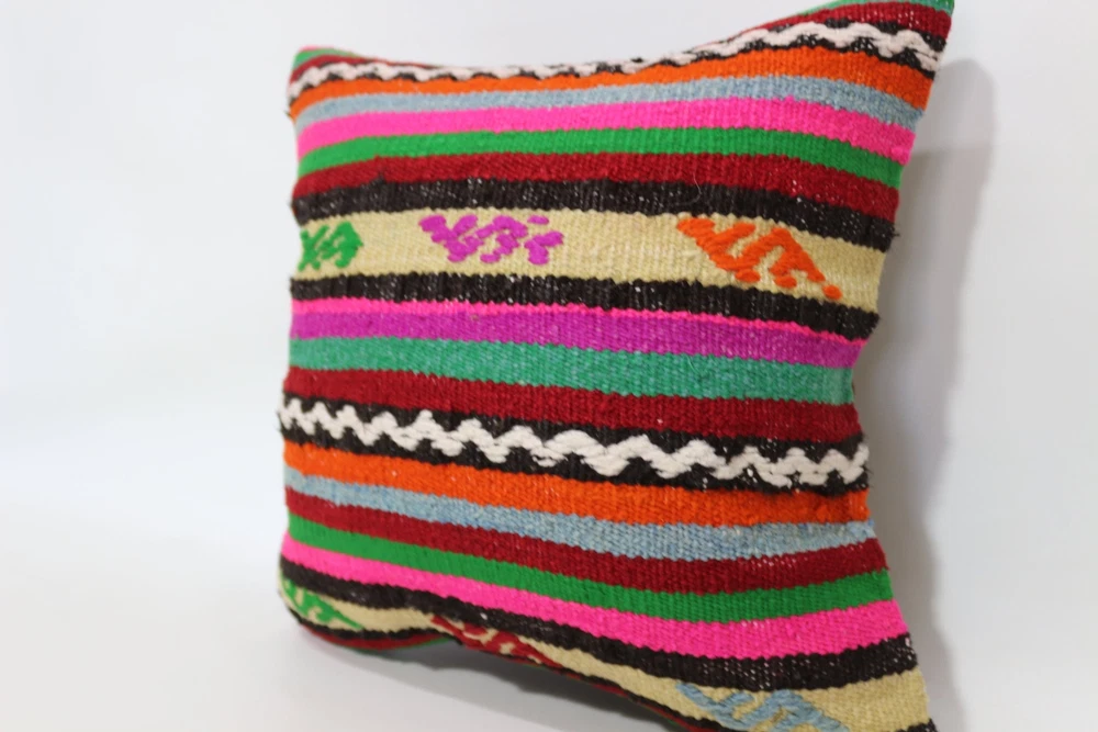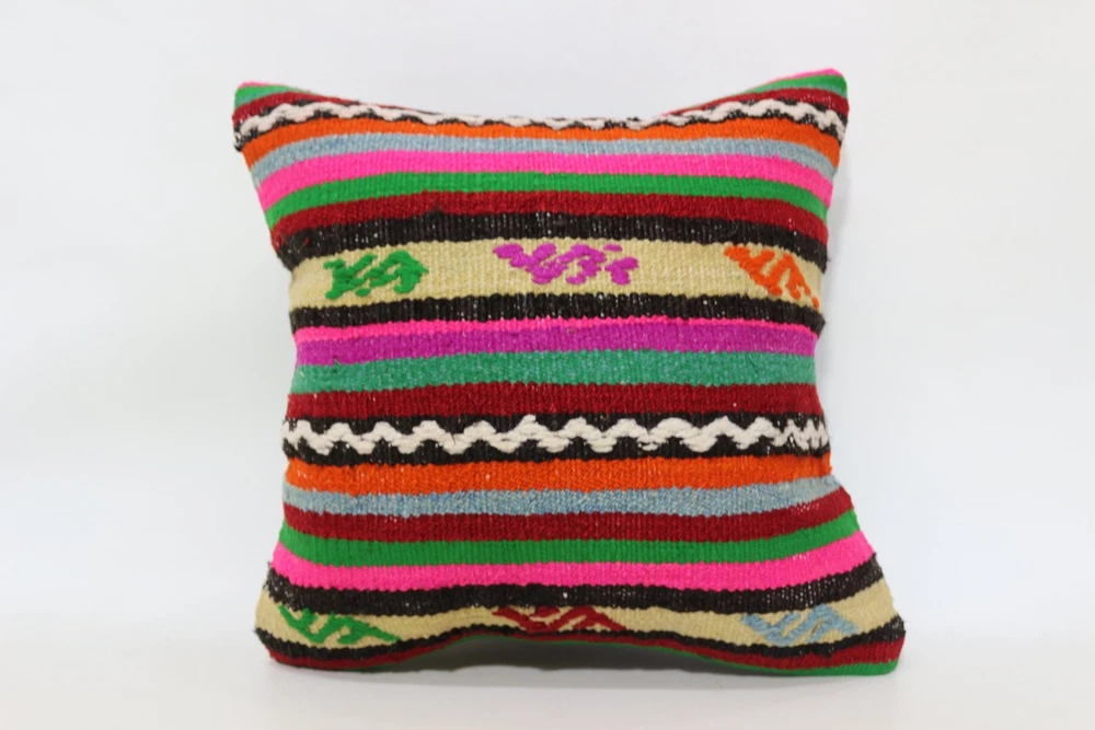 Kilim Pillow Details: All of my beautiful pillow covers or cushion cases are designed and made by me. I am making my throw pillow covers from handmade vintage rugs, Turkish rugs. Therefore, each of my vintage kilim pillowcase is one of kind. These cushions covers are piece of an art. The size of this pillow is 16 x 16 inches or 40 x 40 cm. The front side of this decorative pillow cover, cushion cover is wool on wool vintage kilim rug. The backside of this throw is high quality cotton fabric with a high quality zipper. This listing has 2 option for this handmade pillow. You can choose with insert or without insert. The listing photos is with insert in the pillowcase which is just for demonstration purpose. All of my vintage Turkish rugs have been professionally washed before I cut them as pillow case or cushion case so these kilim covers are 100 posent clean and ready to use. Due to the age and handmade nature of these vintage rugs, there might be imperfections and flaws that are not considered defects. This is a piece of a handmade vintage rug with minor signs of wear consistent with age and use that give it an antique look. You can see the condition of the rug pillow clearly in the detailed photos. I am going to ship your order of decorative pillow as soon as possible. I usually ship in the next day with DHL Express or FedEx which will deliver the kilim pillow, cushion cover just in 3-5 business days. It is my responsible until you receive pillow cover or pillow cover with insert at your door. If the pillow cover or insert get lost or damage during the shipping, I will ship the new kilim pillow cover or pillow insert for free as soon as possible. I take photos of my throw pillows indoor with professional camera which shows the real colors. The photos of these Turkish pillow covers are not altered. Keep in mind the colors of the rug vary slightly in different lights. Please contact to me for additional photos. I take the photos of my vintage rugs outside with daylight to show you the real and natural colors. My photos are not altered. Keep in mind the colors of the rug vary slightly in different lights. Please contact to me for additional photos. SATISFACTION GUARANTEED for your order in my shop. Your SATISFACTION is the most important to me. Please write me if you have any question or if you don't like anything from my pillow covers, cushion covers. If any reason, you are not happy from your Turkish pillow cover, I accept return without any hassle. Please read my shop policies for details. This cushion case or pillow cover can be used as decorative throw pillow, gift pillow, Christmas pillow case, bedding pillow, lumbar pillow, sofa pillow, bohemian pillow, boho pillow. You can find in any kind of Turkish kilim pillow cover in different design such as striped pillow, embroidered pillow, and geometric pillow.