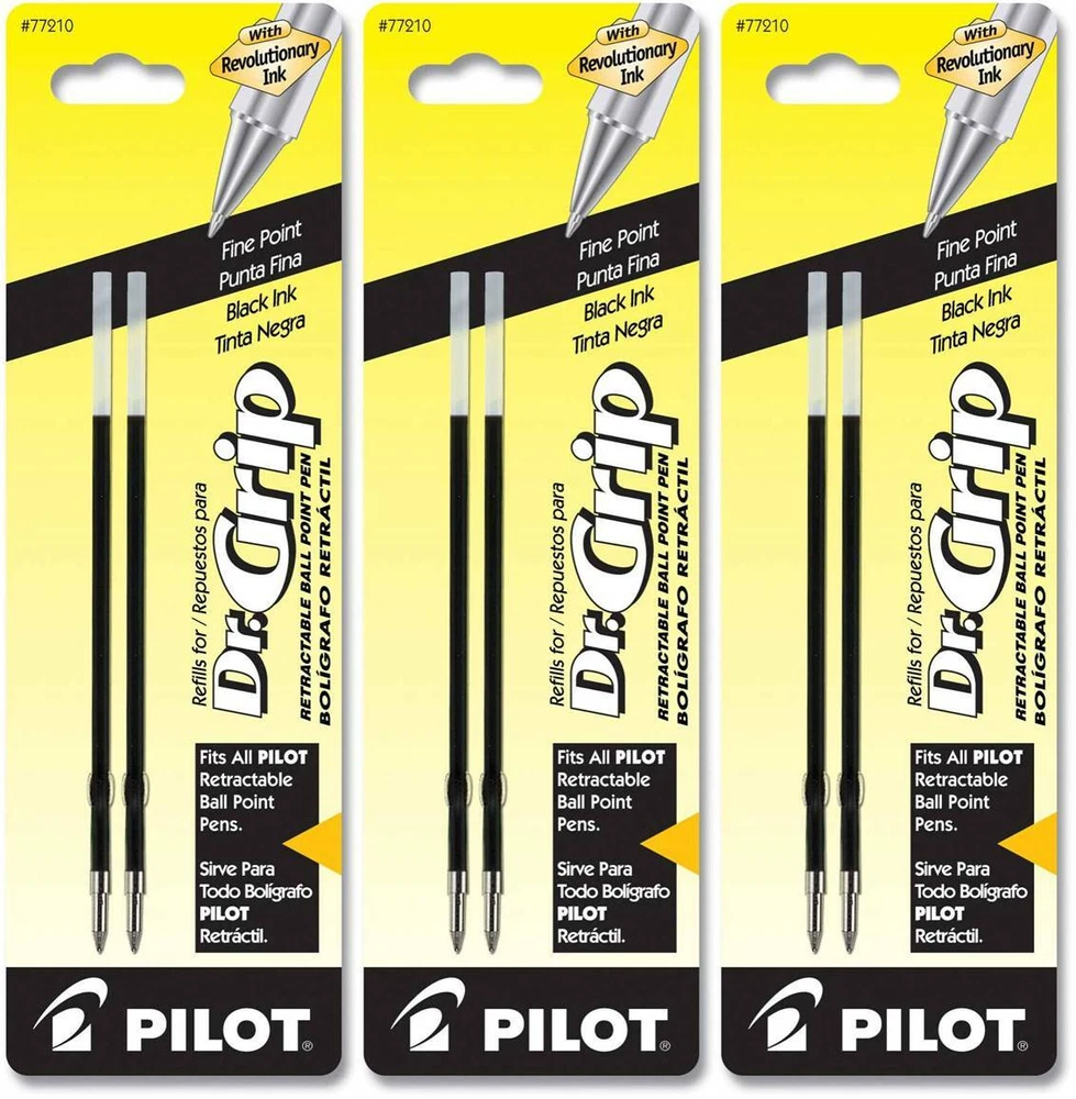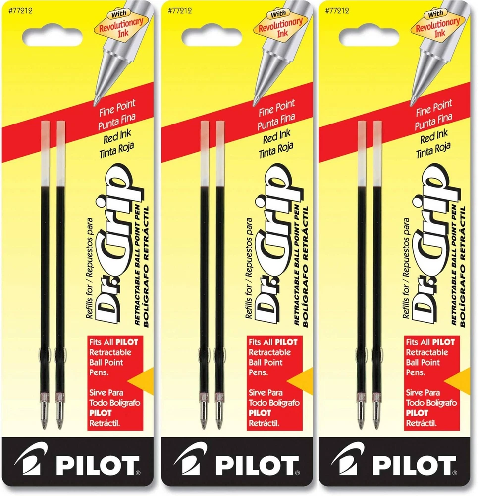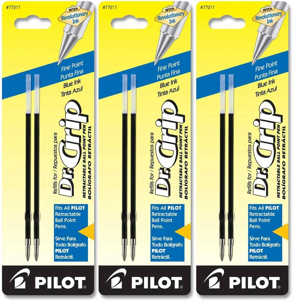 Pilot's high quality refills and accessories extend the life of Pilot products, creating ultimate value; an economic and environmentally-friendly option. Point Type: Fine Point 0.7mm Offers easy, stylish, high-quality and smooth writing Available in 3 colors: Black, Blue and Red Each pack includes 2 refills. Sold as set of 3 Packs. Refill fits the following pens: Dr. Grip ball point, EasyTouch Retractable, Better Retractable, and RexGrip. NOTE: Refill does NOT fit Dr. Grip Center of Gravity , PureWhite or FullBlack pens. About Dr. Grip Refillable & Retractable Ballpoint Pens Dr. Grip is passionate about extreme comfort. He has a PhD in ergonomic weightless relaxation and has studied the feng shui of napping with the masters. His goal is to spread hand happiness one deliciously soft cushioned grip at a time. With an expertly balanced barrel and ergonomic cushioned grip, you’re well on your way to true hand happiness. Retractable & refillable Comfort grip alleviates writing stress Dr. Grip line includes Frosted, Center of Gravity, Multifunction, PureWhite, & FullBlack pens (These pens require different refills) Dr. Grip is available with "regular" ballpoint ink, advanced ink, gel ink, or mechanical pencil options