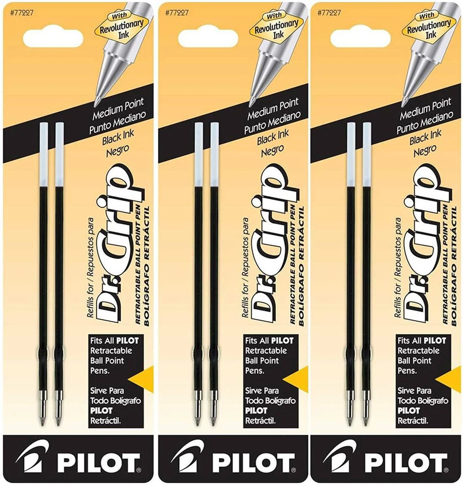 Pilot's high quality refills and accessories extend the life of Pilot products, creating ultimate value; an economic and environmentally-friendly option. Point Type: Medium Point 1.0mm Offers easy, stylish, high-quality and smooth writing Available in 3 colors: Black, Blue and Red Each pack includes 2 refills. Sold as set of 3 Packs. Refill fits the following pens: Dr. Grip ball point, EasyTouch Retractable, Better Retractable, and RexGrip. NOTE: Refill does NOT fit Dr. Grip Center of Gravity , PureWhite or FullBlack pens. About Dr. Grip Refillable & Retractable Ballpoint Pens Dr. Grip is passionate about extreme comfort. He has a PhD in ergonomic weightless relaxation and has studied the feng shui of napping with the masters. His goal is to spread hand happiness one deliciously soft cushioned grip at a time. With an expertly balanced barrel and ergonomic cushioned grip, you’re well on your way to true hand happiness. Retractable & refillable Comfort grip alleviates writing stress Dr. Grip line includes Frosted, Center of Gravity, Multifunction, PureWhite, & FullBlack pens (These pens require different refills) Dr. Grip is available with "regular" ballpoint ink, advanced ink, gel ink, or mechanical pencil options