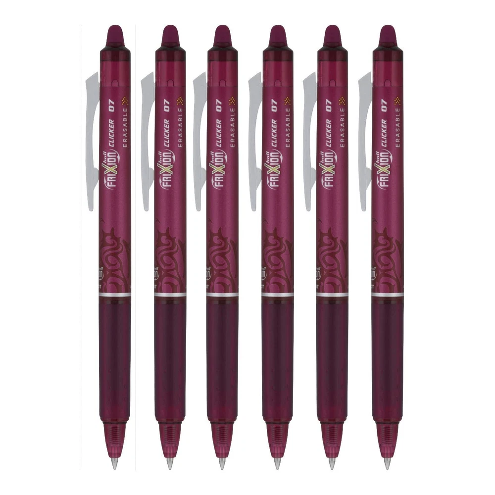 Work on writing projects using these fine-point pens. Featuring thermosensitive gel ink, these pens make it easy to edit essays, schedules and other papers without causing any damage to documents. These Pilot FriXion Ball Clicker erasable black gel pens have 0.7mm fine-point tips, making them ideal for working on charts, illustrations and other detailed tasks. Always correct your mistakes with the Pilot FriXion Gel Pen. The patented erasable ink formula writes clear and crisp lines while erasing completely, forgiving every error. These black gel pens feature a soft grip for comfortable writing, while the ample size, refill-capability and retract function make them an all-in-one quick writing solution. Erasable gel pens allow you to write, erase, and rewrite with no wear-and-tear Fine 0.7mm tip ensures crisp lines with every use Comfort grip for superior control Features a pocket clip for convenient carrying Refillable ink allows pens to be reused instead of replaced to save money Includes 6 burgundy pens with burgundy ink