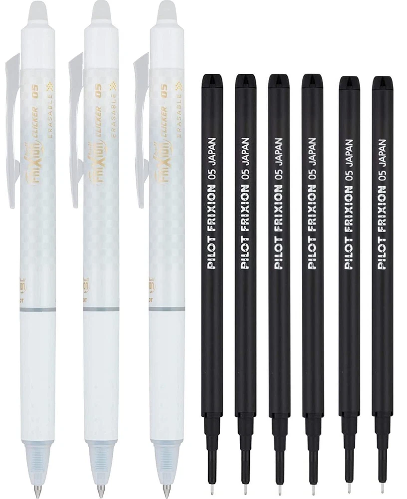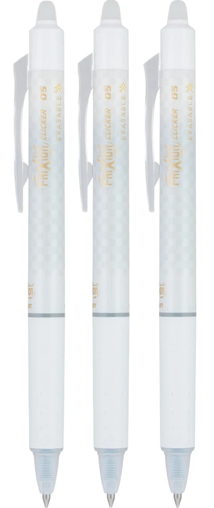 FriXion Erasable Pens by Pilot Write & Create Fearlessly Unlimited do-overs allow you to write, erase, and rewrite repeatedly without damaging your documents. The eraser tip won't wear down or leave crumbs behind. No one will know it wasn't perfect the first time! FriXion's smooth, mistake-free writing benefits teachers, students, parents, and professionals alike. FriXion Erasable Pens are available in a variety of colorful inks and point sizes that are great for making lists and staying organized. FriXion offers more than a pencil ever could! PILOT FRIXION CLICKER - This pen combines the ease of a retractable click pen with Pilot's heat erasable thermo-sensitive gel ink. No wear or tear so you can erase & rewrite until it's right without ruining the page. ERASABLE, RETRACTABLE, REFILLABLE - The FriXion gel ink pen writes smooth & erases clean. Built For Everyday Overachievers: You can rely on G2, proven to be the longest-lasting gel ink pen, with an extra comfortable grip & smooth gliding ink. The roller ball flows consistently for taking notes, writing a novel longhand, or pen & ink drawing Fashion & Function: Long-lasting Pilot G2 Fashion Collection Gel Pens flow smoothly and evenly - and work as hard as you do - making them perfect for home, school & office use. Plus, The new Collection features cool white barrel wraps with fashion-forward barrel designs TRUSTED QUALITY - We've been making pens for over 100 years. Whether you're taking notes, stocking up on school or office supplies, or writing in a bullet journal, Pilot has the perfect pen for you!