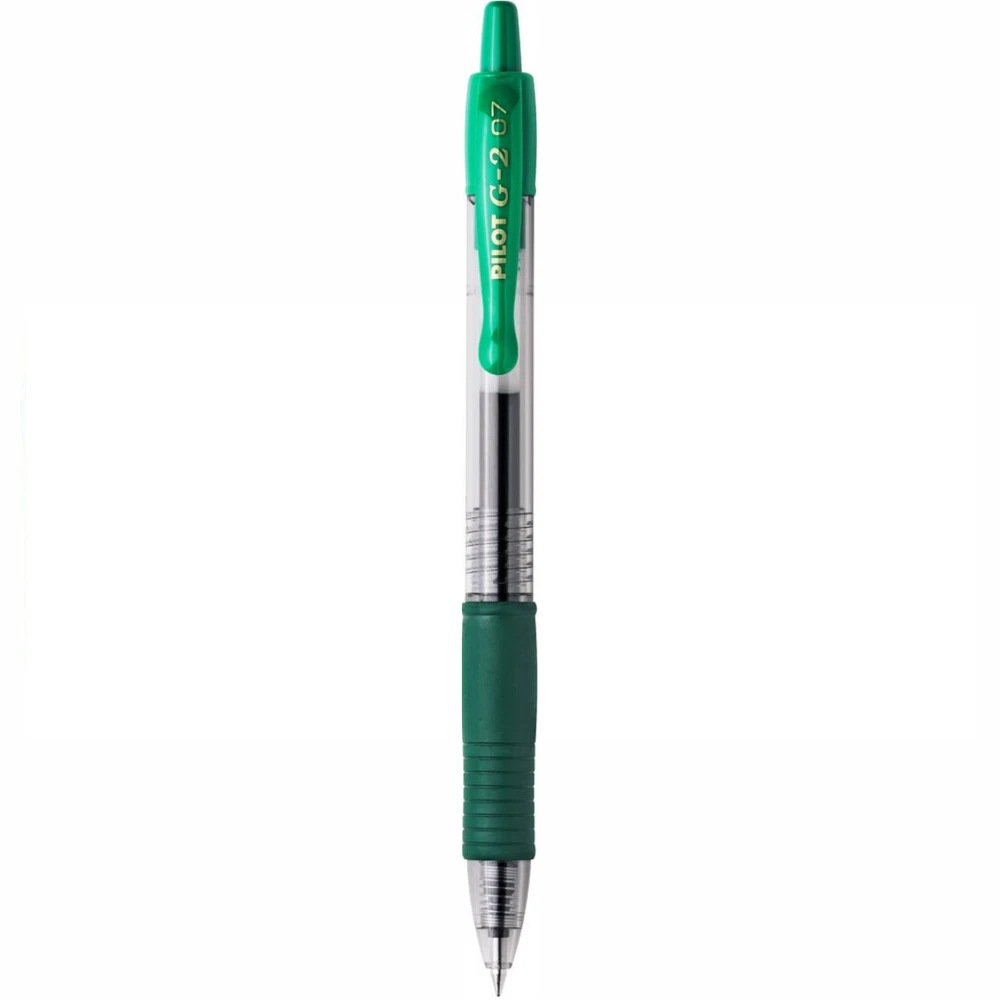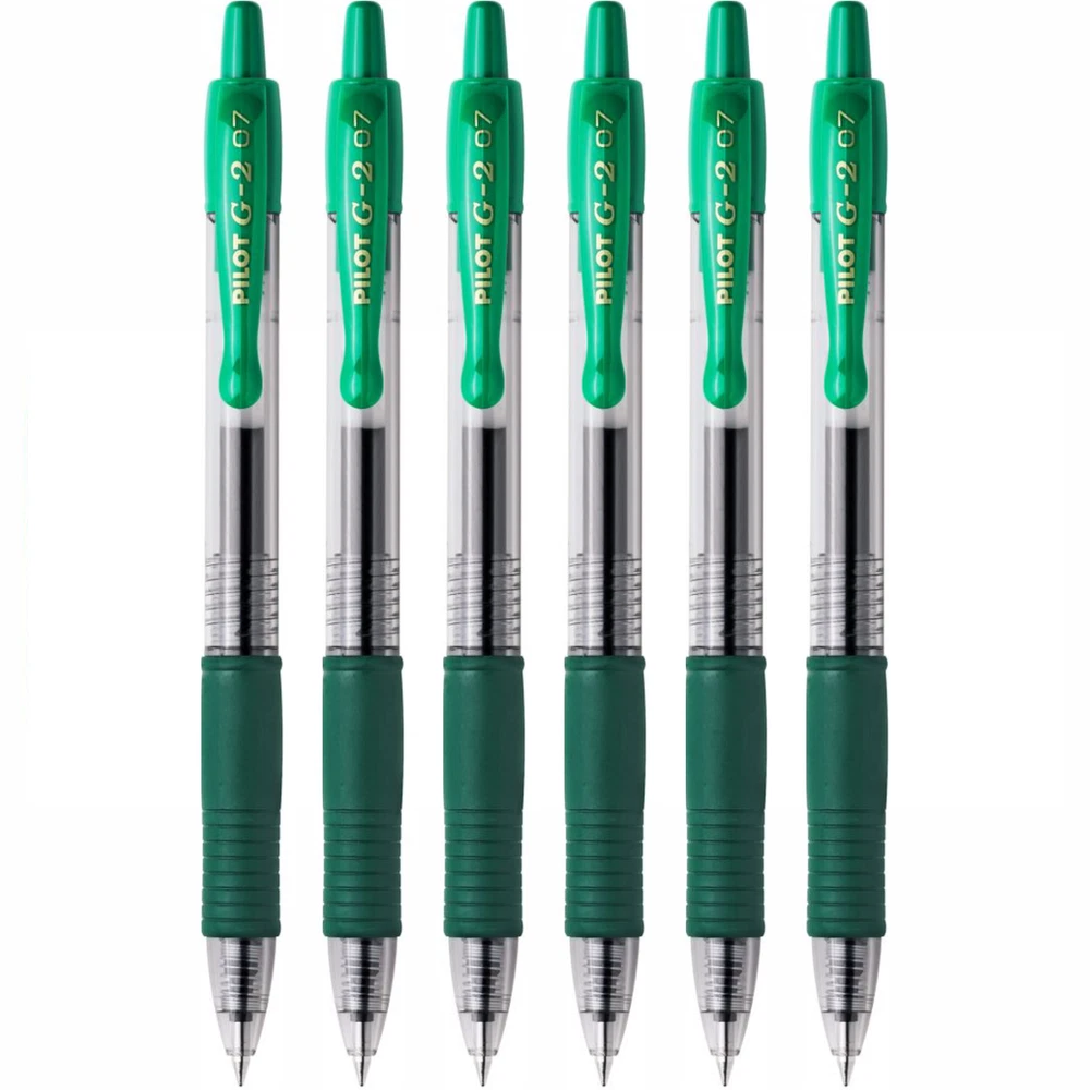 Pilot G2 07 Retractable Rollerball Gel Ink Pen 0.7mm GREEN INK SET Orders placed before 3pm Monday - Friday are dispatched the same working day. The iconic and best-selling retractable gel pen from Pilot. Favoured worldwide by professionals and the public alike, the smooth gel ink provides a blob-free and vivid writing experience from start to finish. With over thirty exciting colours to choose from, there's a G207 for every occasion, and with refills available, this is truly a pen that will stay with you for years. The cushioned ergonomic grip and smooth curves of the pocket clip give the pen a simple yet elegant finish that fits in the pocket, pencil case or hand with equal ease, letting you simply write. 0.7mm tip gives a 0.39mm medium line. **Please note - the pen/pens are delivered loose.** Why buy the Pilot G-207 Retractable Gel Rollerball Pen? Green ink Refillable using Pilot BLS-G2-7 refills 0.7mm tip gives a 0.39mm medium line Retractable tip: a pen ready in one click, no more cap lost! The ink colour is the same as the pen/barrel colour selected Refillable products are more economical and respectful of the environment Smooth gel ink provides a blob-free and vivid writing experience from start to finish An ergonomic pen with a rubber grip to ensure better control and better writing comfort! Effectiveness and writing comfort thanks to the unique fluidity and ultra-softness of the Pilot gel ink