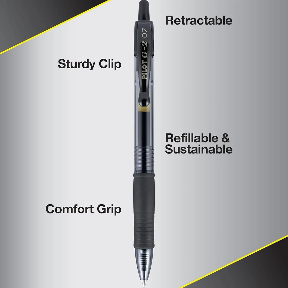 Smooth & Long-lasting: Enjoy a smooth writing experience thanks to the gel ink that glides effortlessly across paper; G2 has been proven to be the longest-lasting gel ink pen so you can write more without having to refill often (Data on File) Comfortable Grip: A contoured rubber grip provides ergonomic support, making long writing projects easier; Available in ultra-fine, extra-fine, fine and bold point sizes so you can find the perfect pen for your writing style Versatile: Perfect for everyday writing tasks such as taking notes and jotting down grocery lists; The G2 tip delivers crisp, clean lines ideal for writing, intricate designs, drawing, sketching or doodling Refillable & Quick Drying: Save money and reduce waste by reusing and refilling your retractable pen with Pilot G2 refills (sold separately); The vibrant, quick drying ink helps prevent smudges and smears Power to the Pen: Express yourself effortlessly with Pilot's line of innovative writing tools, including gel ink, erasable, rolling ball, ballpoint and fountain pens, & dry erase markers & more From taking notes to journaling or drawing, G2 Gel Roller pens keep the ink and your ideas flowing. These long-lasting pens come in many color options and 4 tip sizes, so it's easy to find one that caters to your writing needs and personal style. The quick-drying ink prevents smears and smudges, ensuring your work is neat and clear. Create masterpieces of writing or art with these thanks smooth-flowing gel pens that deliver vivid and clear lines. Perfect for your everyday writing needs, the 0.7 mm fine pen point size strikes a balance between fine and bold lines. Archival-safe and acid-free black ink is formulated to be long-lasting and fade-resistant, ensuring your documents last for a long time. The comfortable rubber grip offers ergonomic support, reducing hand fatigue and making lengthy writing projects a breeze. Pilot's G2 line blends smooth writing with long-lasting ink, precision and comfort for an exceptional writing experience.