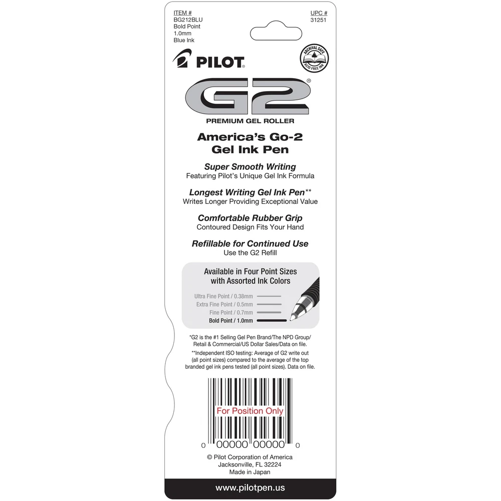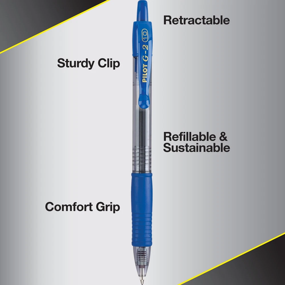 From taking notes to journaling or drawing, G2 Gel Roller pens keep the ink and your ideas flowing. These long-lasting pens come in many color options and 4 tip sizes, so it's easy to find one that caters to your writing needs and personal style. The quick-drying ink prevents smears and smudges, ensuring your work is neat and clear. Create masterpieces of writing or art with these smooth-flowing gel pens that deliver vivid and clear lines. The 1 mm pen point size offers a bolder line width, allowing for more expressive writing. The comfortable rubber grip offers ergonomic support, reducing hand fatigue and making lengthy writing projects a breeze. Archival-safe and acid-free black ink is formulated to be long-lasting and fade-resistant, ensuring your documents last for a long time. Pilot's G2 line blends smooth writing with long-lasting ink, precision and comfort for an exceptional writing experience. Smooth & Long-lasting: Enjoy a smooth writing experience thanks to the gel ink that glides effortlessly across paper; G2 has been proven to be the longest-lasting gel ink pen so you can write more without having to refill often (Data on File) Comfortable Grip: A contoured rubber grip provides ergonomic support, making long writing projects easier Versatile: Perfect for everyday writing tasks such as taking notes and jotting down grocery lists; The G2 tip delivers crisp, clean lines ideal for writing, intricate designs, drawing, sketching or doodling Refillable & Quick Drying: Save money and reduce waste by reusing and refilling your retractable pen with Pilot G2 refills (sold separately); The vibrant, quick drying ink helps prevent smudges and smears Power to the Pen: Express yourself effortlessly with Pilot's line of innovative writing tools, including gel ink, erasable, rolling ball, ballpoint and fountain pens, & dry erase markers & more