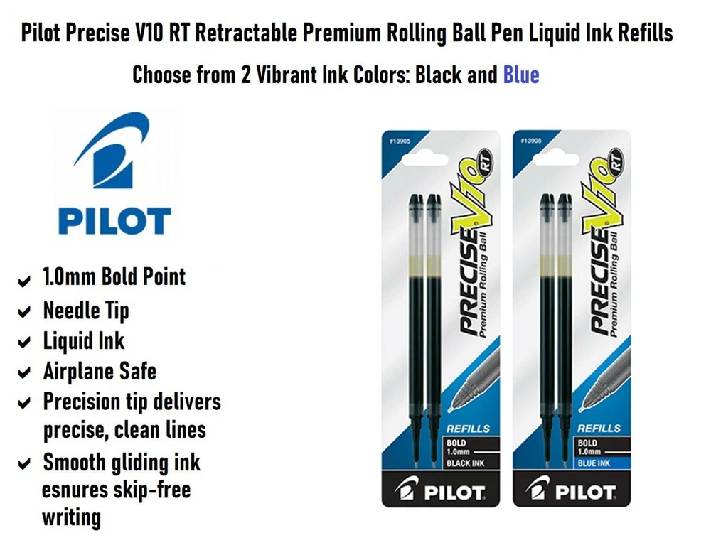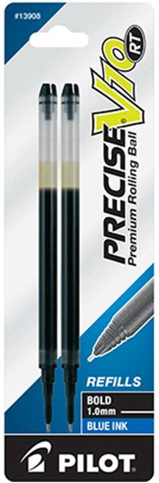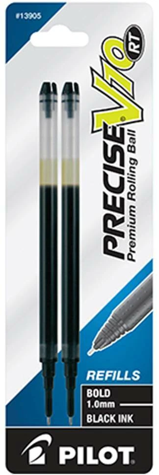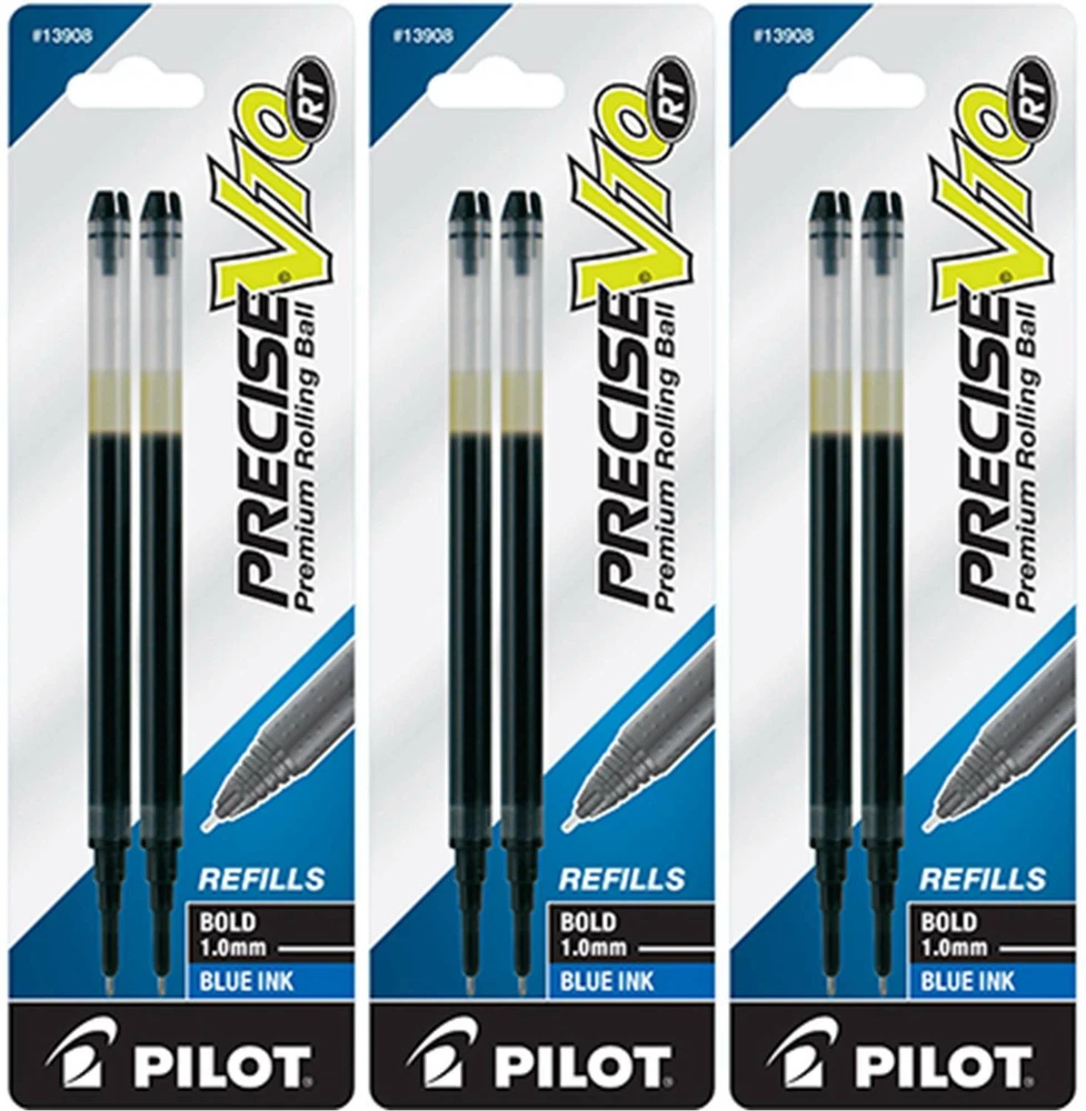 Pilot's high quality refills and accessories extend the life of Pilot products, creating ultimate value; an economic and environmentally-friendly option. Point Type: Bold 1.0mm Smooth and skip-free writing Delivers precise and clean lines 2 colors available for fine point Each pack includes 2 refills. Sold as set of 3 Packs. Refill fits the following pens: Precise V10 RT retractable . About Precise V5/V7/V10 RT Pens There is a fine line between good and great and that line is drawn with Pilot Precise. Precise rolling ball retractable pens are designed to deliver the same kind of premium, precision writing experience as the capped version. Precise combines Pilot's exceptionally smooth writing ink, premium metal accents, and comfortable grip for a go anywhere sophisticated writing experience. Precise is ideal for those who prefer retractable pens and demand superior writing performance. Precision tip delivers a precise, clean line every time Retractable convenience with sophisticated metal clip Patented Precision Point Technology for smooth, skip-free writing Rubber grip with traction pockets Airplane safe system Refillable