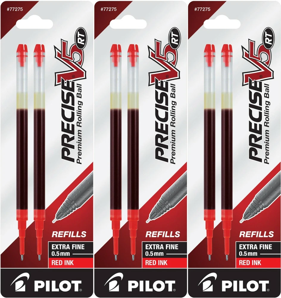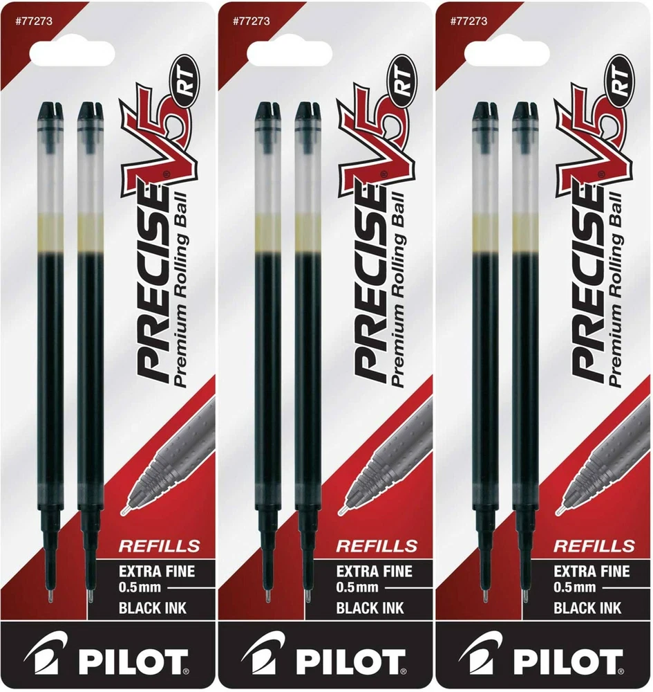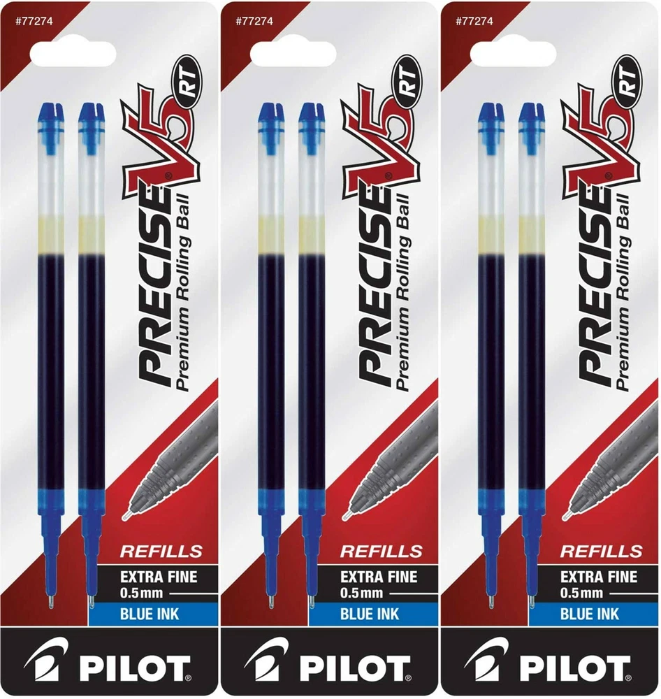 Pilot's high quality refills and accessories extend the life of Pilot products, creating ultimate value; an economic and environmentally-friendly option. Point Type: Extra Fine 0.5mm Smooth and skip-free writing Delivers precise and clean lines 3 colors available for extra fine point Each pack includes 2 refills. Sold as set of 3 Packs. Refill fits the following pens: Precise V5 RT retractable . About Precise V5/V7/V10 RT Pens There is a fine line between good and great and that line is drawn with Pilot Precise. Precise rolling ball retractable pens are designed to deliver the same kind of premium, precision writing experience as the capped version. Precise combines Pilot's exceptionally smooth writing ink, premium metal accents, and comfortable grip for a go anywhere sophisticated writing experience. Precise is ideal for those who prefer retractable pens and demand superior writing performance. Precision tip delivers a precise, clean line every time Retractable convenience with sophisticated metal clip Patented Precision Point Technology for smooth, skip-free writing Rubber grip with traction pockets Airplane safe system Refillable