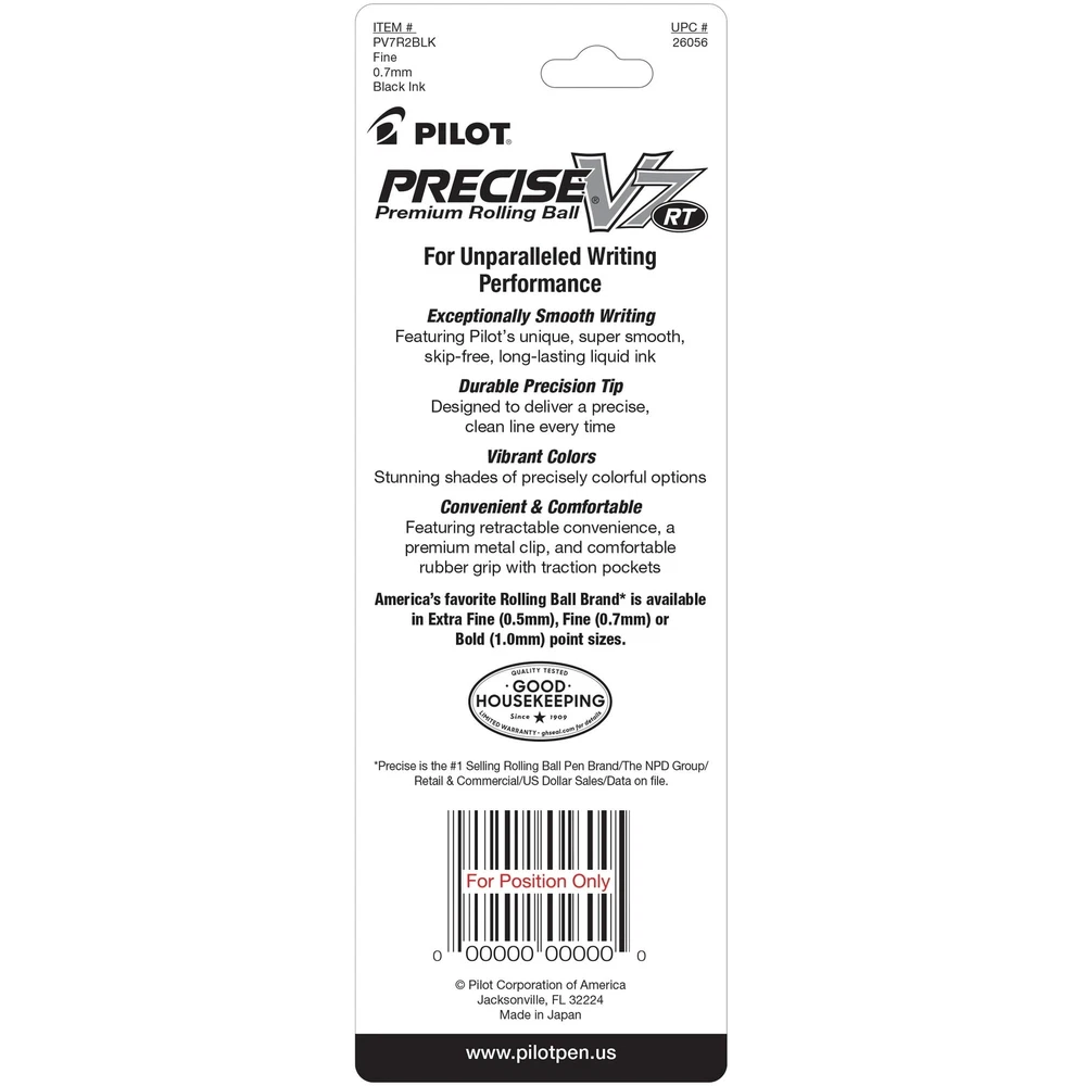 Product Description Pilot Precise V7 RT Pens, (26056) Fine Point, 0.7 mm, Rolling Ball, Black Ink, 2 Count, (Pack Of 1) There is a fine line between good and great and that line is drawn with Pilot Precise V7 RT. Precise V7 RT rolling ball pens combine Pilot's smooth writing ink, premium metal accents, and iconic look in order to deliver a premium, sophisticated writing experience. Precise V7 RT is for writers in need of a superior writing performance. V7 Premium Rolling Ball pen from Pilot - America's #1 Selling rolling ball pen brand. Precise V7 delivers unparalleled performance for ultra-smooth, fine point precision writing. Pilot's unique liquid ink formula is paired with patented Precision Point Technology to deliver consistent flowing strokes for a truly exceptional, skip-free writing experience. The fine point 0.7mm writing tip is a great choice for everything from keeping to-do lists perfectly organized to creating detailed drawings. Retractable option available in Black, Blue Red, and Purple ink colors. Point size: 0.7mm; Point Type: Fine; Ink Color(s): Black; Pen Type: Rolling Ball; 2 Count PILOT PRECISE V7 RT: This premium retractable rolling ball pen has a patented fine precision tip to deliver smooth, skip-free writing every time. Unparalleled performance for ultra-smooth writing. PRECISION POINT: You'll love the clean lines & smooth ink delivery of this retractable rolling ball pen. Available in black, blue, red, & purple ink. Features a sophisticated metal clip. DESIGNED TO DELIGHT: If you love Pilot Precise pens, you'll want to try the full line of Precise V5, V5 Deco Collection, & V7 rolling ball pens, available in capped & retractable options. TRUSTED QUALITY: We've been making pens for over 100 years. Whether you're taking notes, stocking up on school or office supplies, or writing in a bullet journal, Pilot has the perfect pen for you! POWER TO THE PEN: Pilot makes exceptional writing instruments to suit all your needs. We have fountain, ballpoint, retractable, erasable & gel ink pens, whiteboard markers & more for every writing style. Precise V7 RT Premium Rolling Ball pens offer unparalleled performance and smooth, precision writing Precise's unique liquid ink formula and Patented Precision Point Technology delivers a silky, skip-free writing experience The fine writing tip is ideal for any detail-driven writing task Attractive, retractable design for added convenience. Fine Point (0.5mm). Black Ink. 2 Count Precision tip that delivers a precise, clean line every time Unique liquid ink formula helps maintain consistent flowing strokes Incredibly smooth, skip-free writing Rubber grip with traction pockets Patented Precision Point Technology