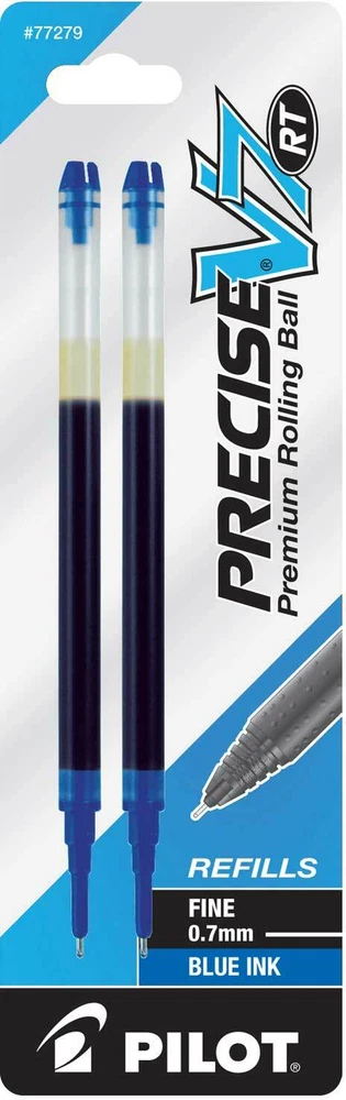 Pilot's high quality refills and accessories extend the life of Pilot products, creating ultimate value; an economic and environmentally-friendly option. Point Type: Fine 0.7mm Smooth and skip-free writing Delivers precise and clean lines 3 colors available for fine point Each pack includes 2 refills. Sold as set of 3 Packs. Refill fits the following pens: Precise V7 RT retractable . About Precise V5/V7/V10 RT Pens There is a fine line between good and great and that line is drawn with Pilot Precise. Precise rolling ball retractable pens are designed to deliver the same kind of premium, precision writing experience as the capped version. Precise combines Pilot's exceptionally smooth writing ink, premium metal accents, and comfortable grip for a go anywhere sophisticated writing experience. Precise is ideal for those who prefer retractable pens and demand superior writing performance. Precision tip delivers a precise, clean line every time Retractable convenience with sophisticated metal clip Patented Precision Point Technology for smooth, skip-free writing Rubber grip with traction pockets Airplane safe system Refillable