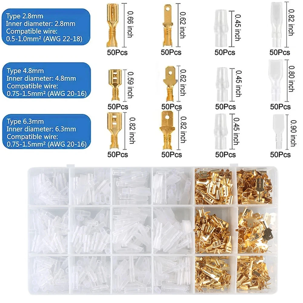 【Adjustable Crimping Tool】With an automatic adjustment ratchet mechanism, an adjustable locking device, and the function of releasing pressure points. crimper tool is designed to crimp 22-13AWG non-insulated open barrel, OEM-style terminals and wire splices. 【 Crimping Pliers Capacity】Crimping tool has a wide range of crimping capacity. It’s capable of crimping 2.8mm, 4.8mm and 6.3mm pitch open barrel terminals. 【Type and Size】The terminal block is made of copper, which has high conductivity, oxidation resistance and durability, enough to meet the needs of most DIY projects. 【Ring Terminal】Brass ring terminals, commonly used for cycling battery connections and ground connections, connecting aftermarket switches, ignition coils, ground wires, and similar items that require screws or bolts. 【Widely Application】The combination of crimping tool and spade bullet connectors can be widely used to home appliances, auto, audio system for battery or rocker switch quick connecting / disconnecting, motorcycle, scooter, auto, car, truck, boat,Arduino, 3D printer, PCB, jumper wire and other electronic DIY projects etc.