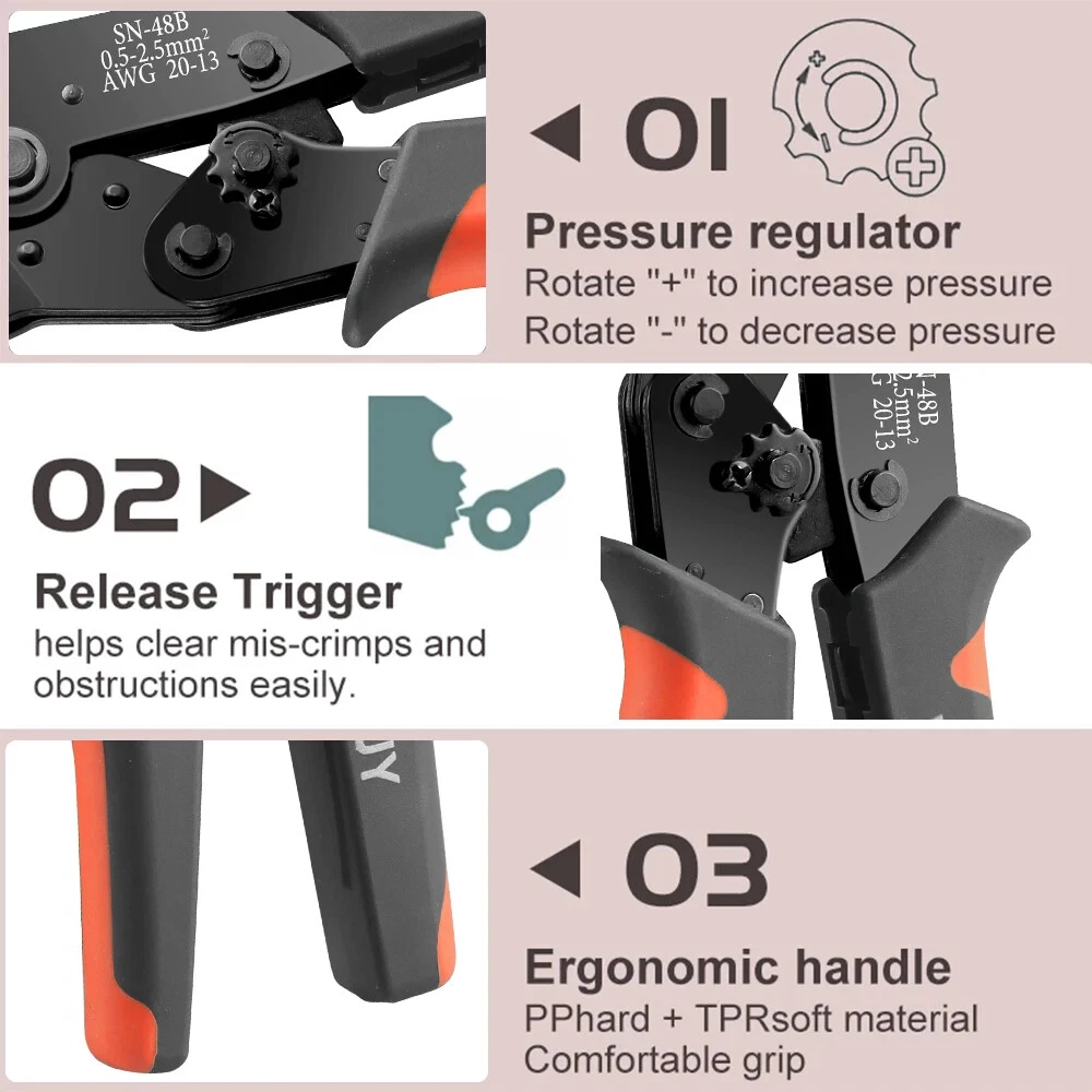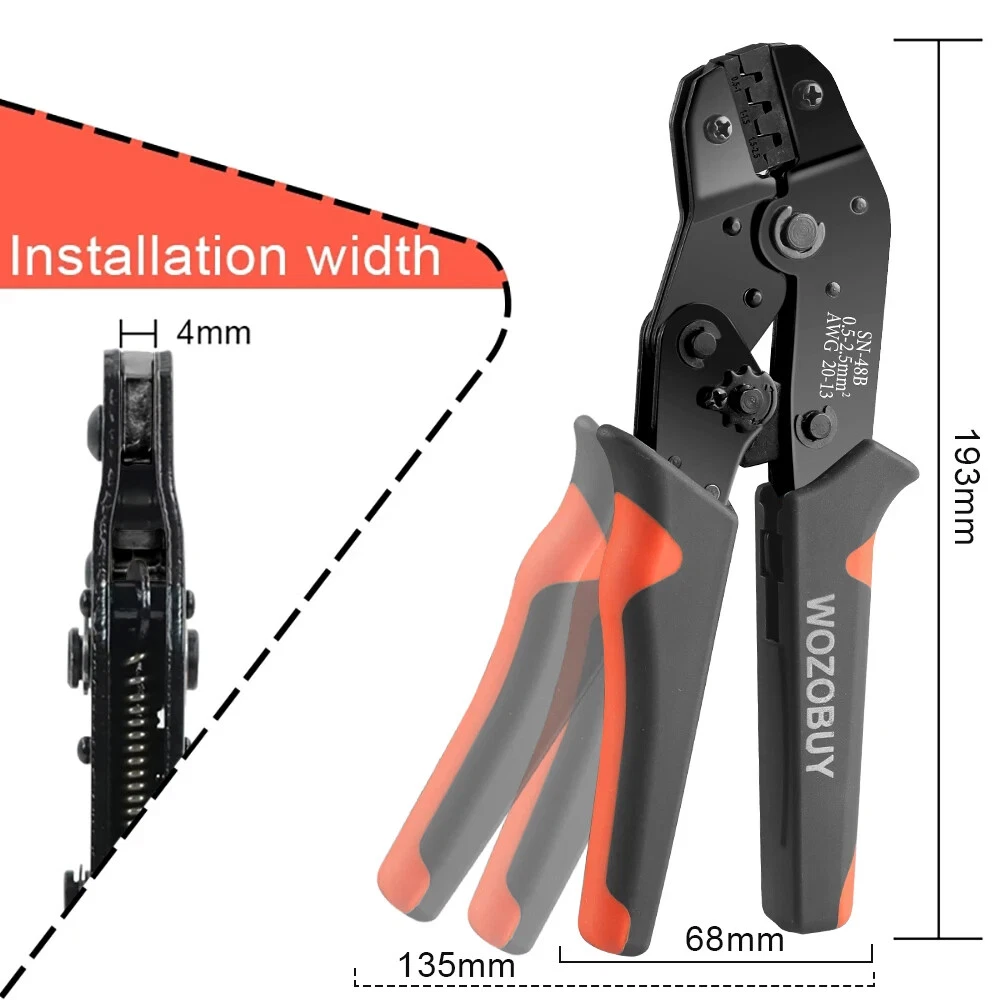 【Adjustable Crimping Tool】With an automatic adjustment ratchet mechanism, an adjustable locking device, and the function of releasing pressure points. crimper tool is designed to crimp 22-13AWG non-insulated open barrel, OEM-style terminals and wire splices. 【 Crimping Pliers Capacity】Crimping tool has a wide range of crimping capacity. It’s capable of crimping 2.8mm, 4.8mm and 6.3mm pitch open barrel terminals. 【Type and Size】The terminal block is made of copper, which has high conductivity, oxidation resistance and durability, enough to meet the needs of most DIY projects. 【Ring Terminal】Brass ring terminals, commonly used for cycling battery connections and ground connections, connecting aftermarket switches, ignition coils, ground wires, and similar items that require screws or bolts. 【Widely Application】The combination of crimping tool and spade bullet connectors can be widely used to home appliances, auto, audio system for battery or rocker switch quick connecting / disconnecting, motorcycle, scooter, auto, car, truck, boat,Arduino, 3D printer, PCB, jumper wire and other electronic DIY projects etc.