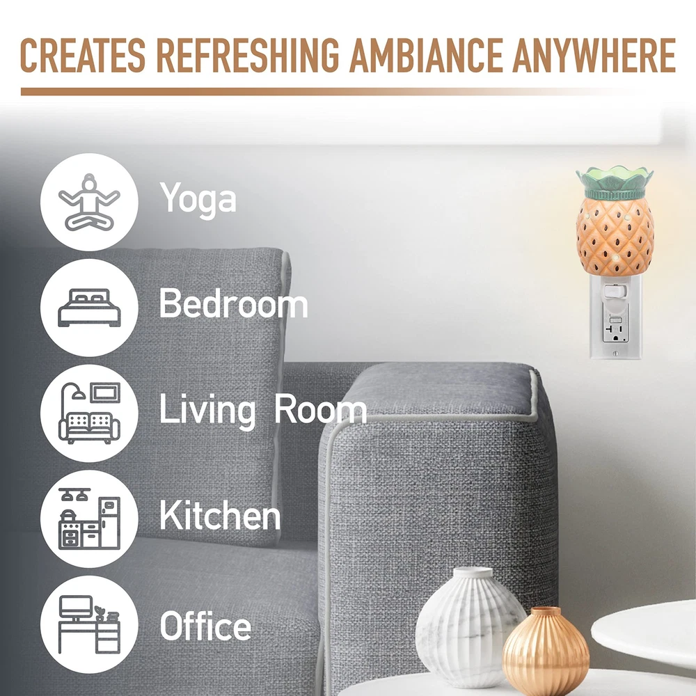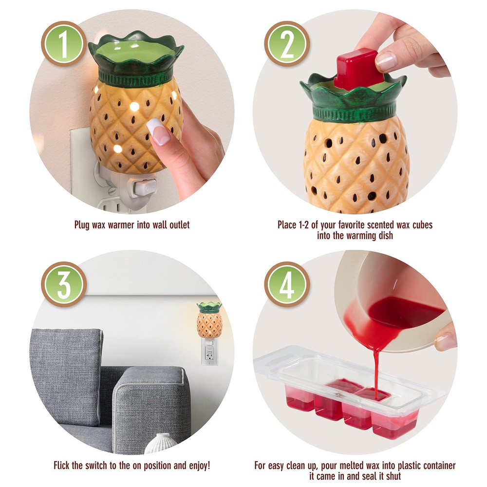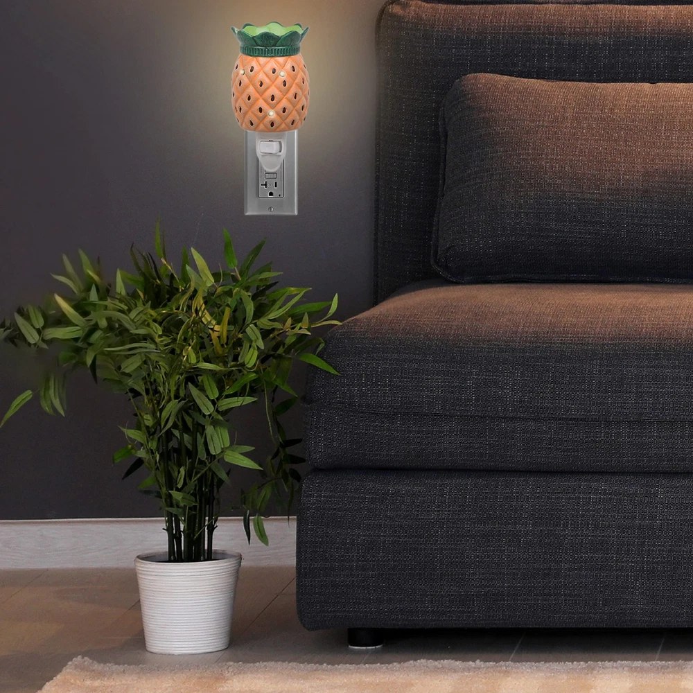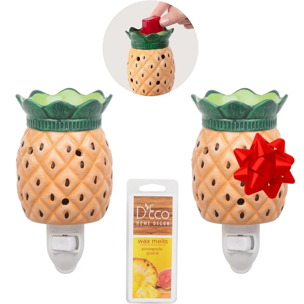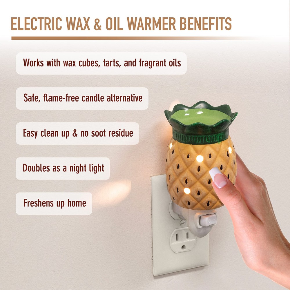 Mini Pineapple Electric Candle Plug In Set of 2, Wax, Tart, & Oil Warmer, includes 4 Guava Pineapple Wax Cubes and Halogen Bulb. No flame - Illuminated soft light provides a gentle and calming glow. Plugs into standard outlet. Quick, safe and clean alternative to candles. Perfect for adding a decorative touch and artistic design to create a relaxing ambiance in any room. Pineapple Electric Candle Plug In Set of 2, Wax, Tart, & Oil Warmer, Includes 4 Guava Pineapple Wax Cubes and Halogen Bulb (5x3") No flame - Illuminated soft light provides a gentle and calming glow. Plugs into standard outlet. Quick, safe and clean alternative to candles Melts 1 cube of wax at a time One bulb included. Replace with 15W, 120v light bulb in warmer Perfect for adding a decorative touch and artistic design to create a relaxing ambiance in any room. Great gift for housewarming parties, Mother's Day, holidays and birthdays!
