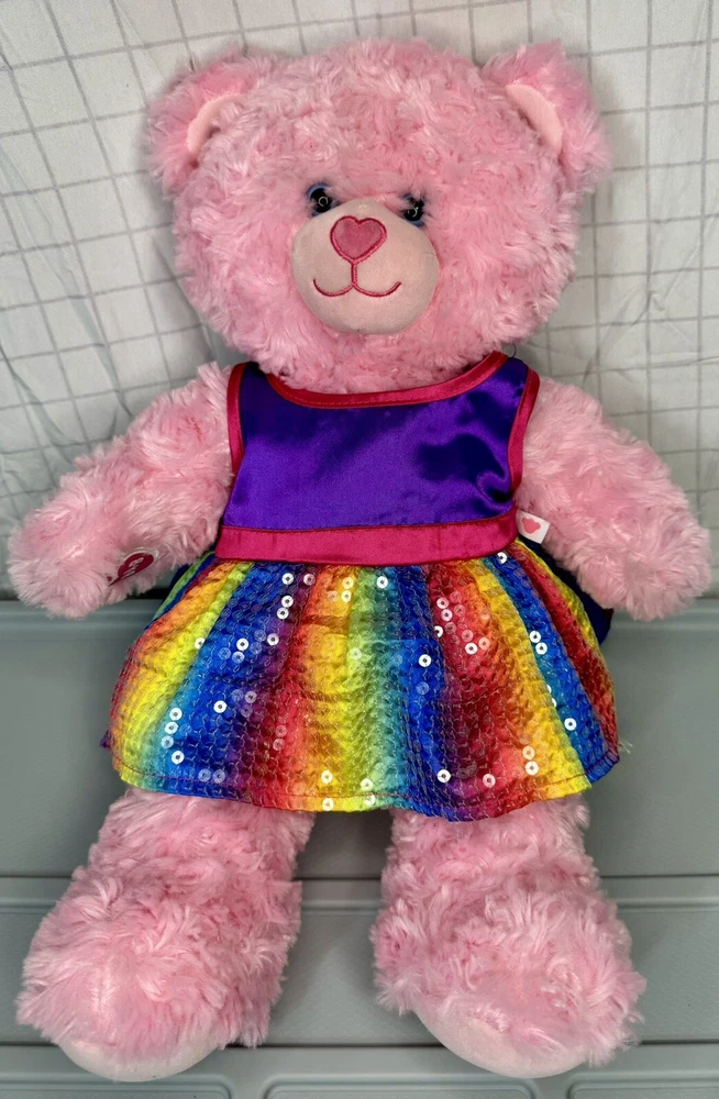 This adorable pink plush bear from Build-A-Bear Workshop is ready to make your heart skip a beat! With its charming blue eyes and colorful rainbow dress, this bear is sure to brighten up any room. Perfect for collectors or as a gift for someone special, this bear is made to be loved. Featuring a cute and cuddly design, this bear is sure to bring joy to anyone who receives it. The plush material and attention to detail make this bear a must-have for fans of the Build-A-Bear franchise. Don't miss out on the chance to add this lovely pink bear to your collection today!