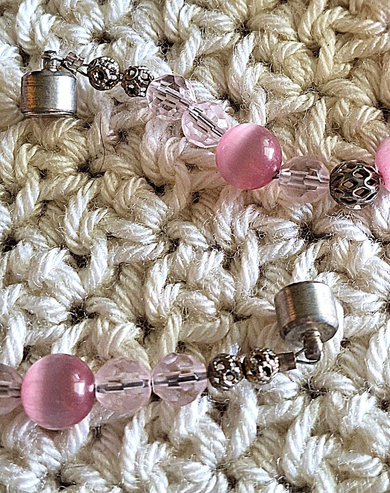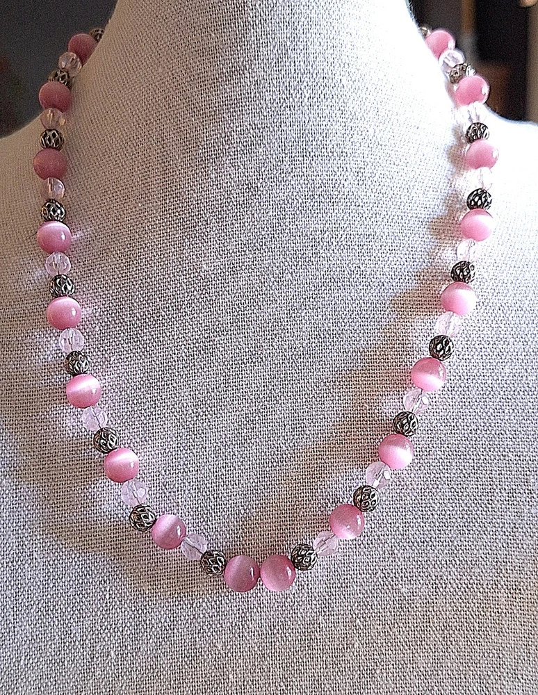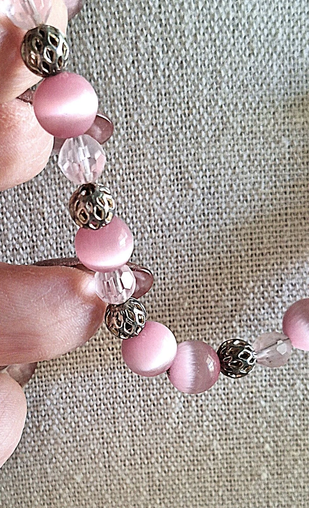 This beautiful necklace features pink Cats Eye stones with glass beads and silver-tone spacers. The magnetic clasp allows for easy closure and the necklace measures approximately 17 inches in length. The round shape of the main stone adds to its elegance and the beaded chain type enhances its beauty. The necklace is handmade and unsigned, with a vintage touch that makes it perfect for any occasion such as Mother's Day, Christmas, Anniversary, Birthday, or Valentine's Day. The necklace is a lovely addition to any jewelry collection and can be worn to enhance any outfit. In Excellent Vintage condition. No chips or cracks. Preowned. Please see photos. Disclaimer : Many of the items I sell are vintage, antique or used, and may not be in perfect condition. They may have age-related wear, imperfections or a minor chip here and there. You may also see air bubbles in crystal items, which are naturally occurring. I will point out any and all of these to the best of my ability. Please review the photos provided carefully, read the description, and judge accordingly. All items are insured for the purchase price in case of damage due to shipping, so please do not throw away any of the original packing materials, the shipping box, or the broken item as these will have to be returned to Memory Lane Treasure in order to file an insurance claim for reimbursement of the item. The buyer is responsible for return shipping costs and reimbursement to the Buyer will not take place until the Seller has received all of the above. Please feel free to contact me with any and all questions you may have before purchasing an item—I am happy to assist. Thank you for visiting Memory Lane Treasure! Shipping and Handling : The misnomer regarding Shipping is that the amount charged only covers what it costs to ship an item by its weight. Shipping covers more than just the weight of an item, it also includes logistics costs such as packing supplies, inventory storage, transportation, and delivery. Due to the rising costs in our economy, Memory Lane Treasure has had to start charging for shipping; however, to keep the total cost as low as possible for our customers, Memory Lane Treasure has not yet started to charge a Handling fee, which is the cost of labor. Also note, that depending on the destination of the purchased item, eBay may calculate a different Shipping from what was listed by Memory Lane Treasure. Should that occur, it is not something done by our facility and Memory Lane Treasure should not be held responsible. 100% Customer Satisfaction is Memory Lane Treasure’s ultimate standard. Should a customer have any questions or concerns, they are always encouraged to contact Memory Lane Treasure before purchasing an item—I am happy to assist.