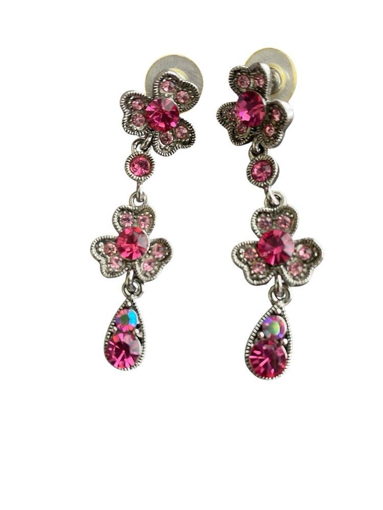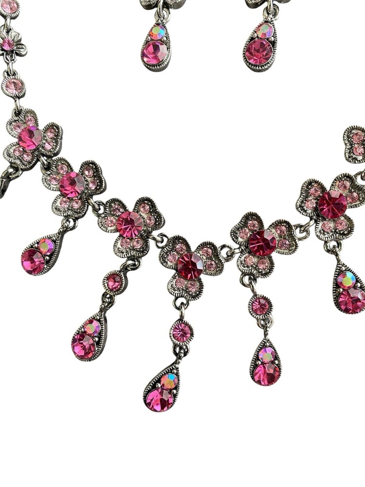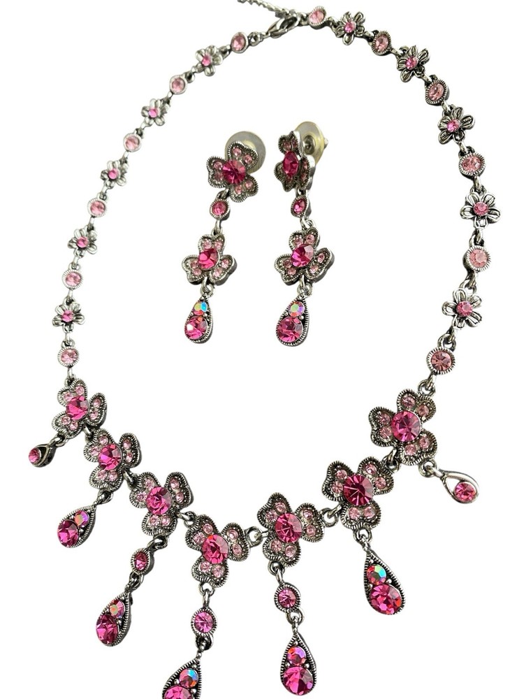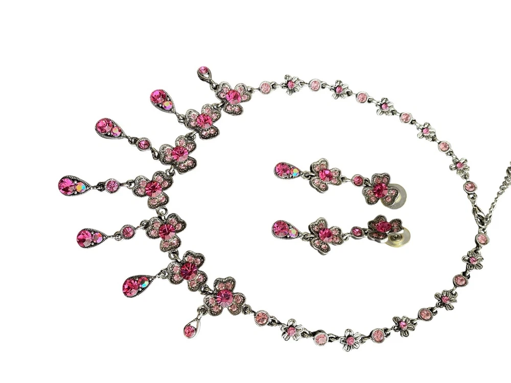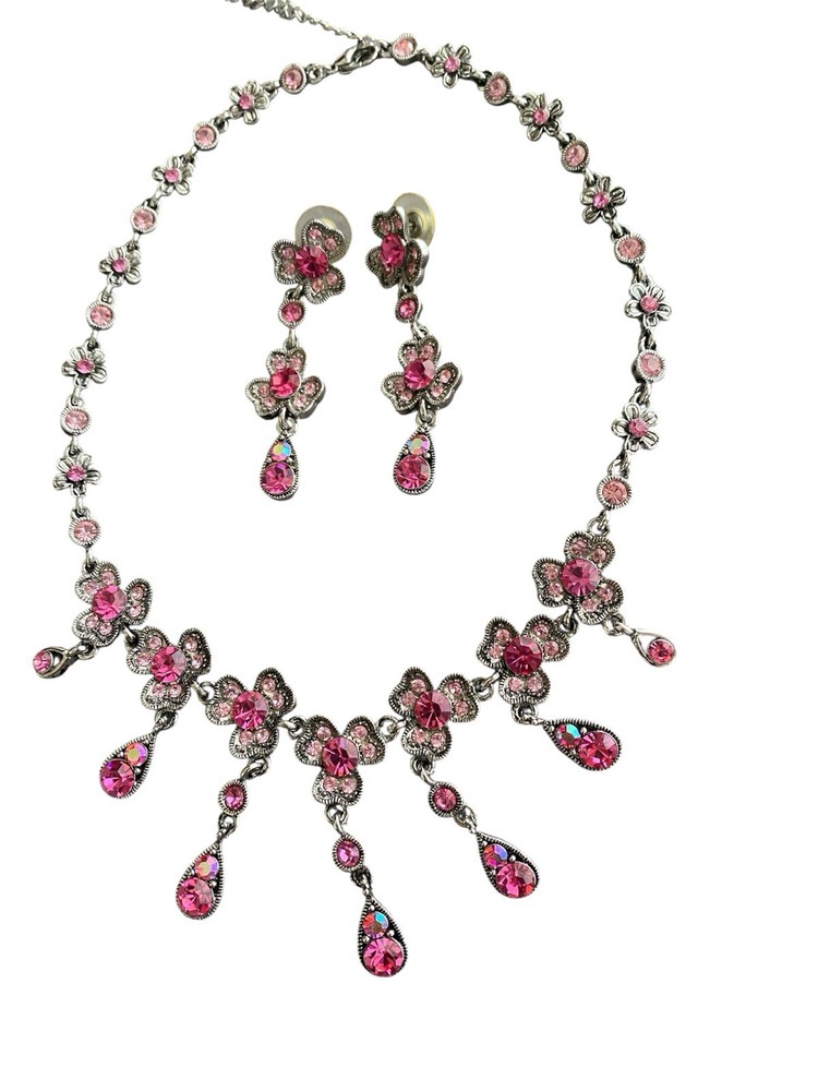 Pink Clover Three Leaf Dogwood? W Aurora Borealis Crystal Necklace &Earring Set. Condition is Pre-owned. Shipped with USPS Ground Advantage.