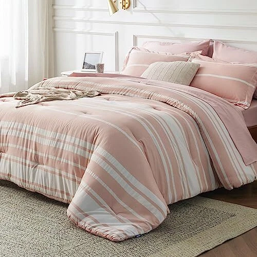 Return Policy Fast Delivery Trusted seller Pink Comforter Set Full 7 Pieces, Light Pink White Striped Bedding Sets All Season Bed Set, 2 Pillow Shams, Flat Sheet, Fitted Sheet and 2 Pillowcases Product Description OEKO-TEX Certified: This full Bedding Set is Standard 100 by OEKO-TEX certified for meeting high safety standards and is free from harmful materials, providing sleepers with assured quality. Easy Care: The double stripe full size comforter set is easy to clean. Simply machine wash cold without chlorine based bleach and tumble dry low to make it fresh and new again. High-Quality Fill: Our all-season bedding set is filled with a fluffy 240 GSM fiber fill that is extra airy and fluffy, providing a cloud-like sleeping experience to cozy sleepers. Elegant Design: The stripe pattern on this bed-in-a-bag set conveys a modern minimalist appeal that coordinates with various home decor styles, adding more aesthetic and coziness to your bedroom. What You Get: The Bed in a bag full size complete set includes 1 Comforter (82" x 86"), 2 Pillowcases (20" x 30"), 2 Pillow Shams (20" x 26"+2"), 1 Fitted Sheet (54" x 75" + 14"), 1 Flat Sheet (81" x 96") Shipping Returns Payment Shipping Shipping is FREE to all addresses other than APO/PO boxes in the lower 48 states. All our stock ships from US-based warehouses. Shipped via USPS or UPS (depending on location and package weight) Unless stated otherwise, all orders will ship within 24-72 hours of your payment being processed. Check our feedback to see the great reviews of FAST shipping we offer. Returns Seller does not accept returns Payment We currently accept payment via eBay managed payments only. Once payment is cleared, we will dispatch your shipment within 1-3 business days. Please refer to the "Shipping" tab for more information regarding shipping speed to your destination.