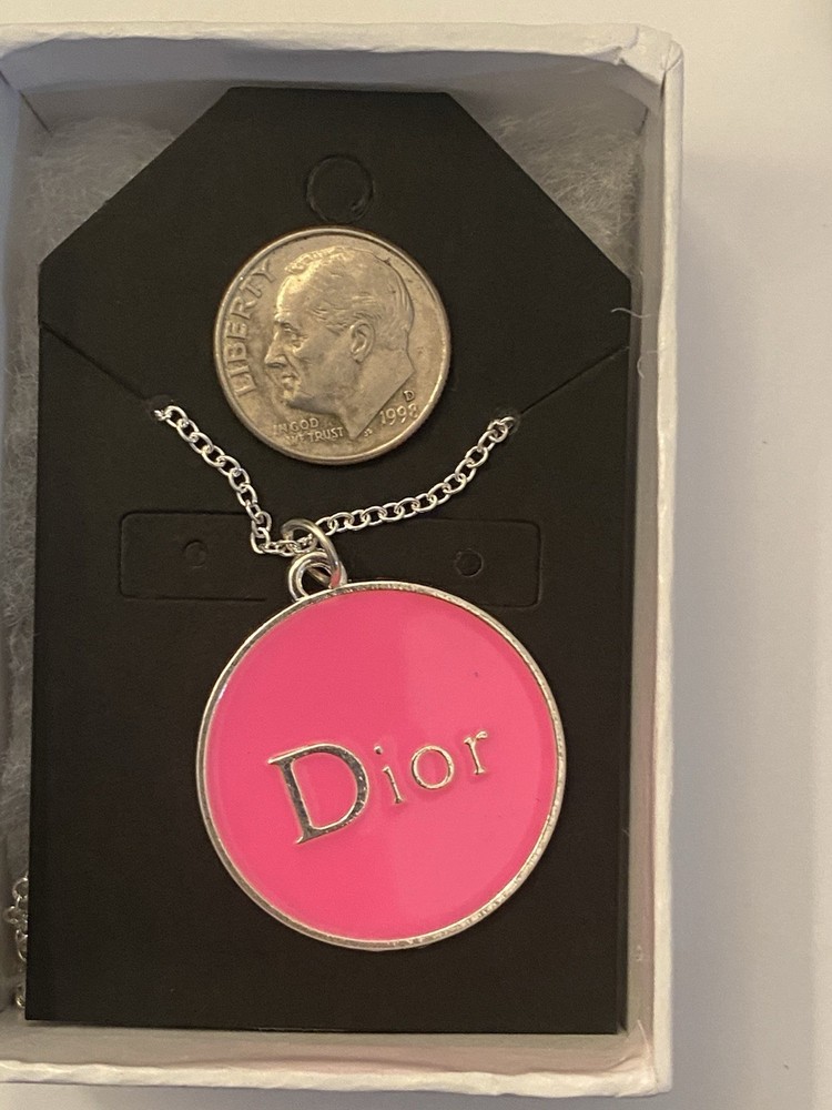 The Pink Dior Charm Necklace is a stylish accessory featuring a silver charm on an 18-inch chain. Made from metal alloy and manufactured in China, this necklace is a fashionable choice for adding a touch of luxury to any outfit. The charm adds a touch of glamour, making it a chic and elegant piece for any jewelry collection.