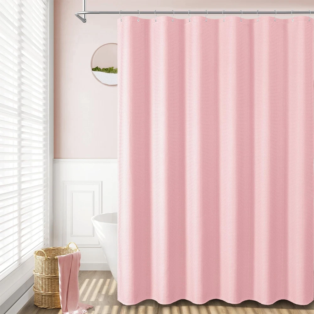 Elegant and Durable Fabric Shower Curtain with Waffle Weave ► PREMIUM QUALITY: 256 GSM heavy duty fabric shower curtain with waffle-weave pattern brighten up your bathroom with elegance and luxury. Simple design and fashionable appearance beautify your home decor. ► WATER REPELLENT: Hospitality standard and treatment for water repellent allows water to bead on the surface of the shower curtain. ► DURABLE: Extra Heavy duty fabric and tight hem keep the curtain from being torn up. Equipped with 12 rust-resistant metal grommets, this curtain enjoys lasting use. ► STANDARD MEASUREMENT: 72"x72" 72 x 72 72 inch wide shower curtain fits for your standard size. ► CARE INSTRUCTIONS: Machine wash cold; Gentle cycle; Don't bleach; Hang dry; No shrinkage, No deformation. 🚿【Dimensions】72W * 72H inch; 256GSM (Gram Per Square Meter), about 1.1 pounds heavier than normal 90GSM fabric shower curtains; 12 rust-resistant grommets that fit most standard shower hooks or rings. Package includes 1 Pink Waffle Shower Curtain and 12 Plastic Hooks. 🚿【Weighted Thick "Cotton" Fabric Shower Curtain】Made from expertly chosen and tested Heavyweight Polyester Fabric, touches like a cotton feel. Honeycomb waffle weave pattern adds elegance to your bathroom. 🚿【Hotel Luxury Spa 】"Three-proof" fabric, lotus leaf water-repellent, oil-repellent, and stain-repellent. Environmentally friendly and no smell. Heavy duty with weighted hem, keep it from billowing, extremely good at light transmission and providing privacy. 🚿【Elegant & Neutral Style】This waffle shower curtain will complement any bathroom - use at home, apartment, condo, hotel, camper, RV, dorm, shower, college dorm room, athletic club, gym and everywhere else you need a reliable shower curtain. Cloth fabric, machine washable and easy care. 🚿【Services】We are industry and trade integration, dedicating to offer stylish, quality products for our customers. If your arrives damaged in any way, we will send you a . If you have any problem about our products, please feel to .