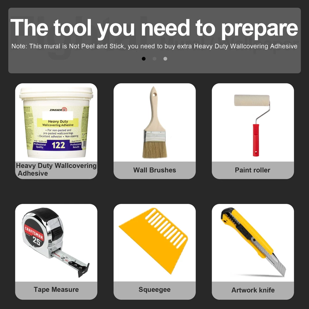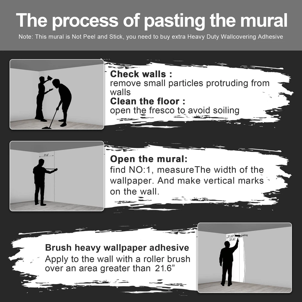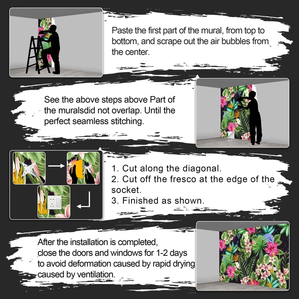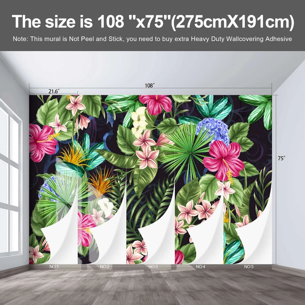 Why choose murals? individuality wallpaper VS traditional wallpaper 1.Our murals are different from ordinary wallpapers, we them individuality murals. individuality mural patterns can be colorful, traditional wallpaper patterns are very monotonous 2.He is the same as the traditional wallpaper construction method. 3.The traditional wallpaper will be broken as soon as it is torn, and the individuality wallpaper is made of good raw materials, and it will not be damaged no matter how it is torn. individuality wallpaper VS self-adhesive wallpaper Self-adhesive, he does have an advantage, that is, construction does not require auxiliary materials, just peel and paste. However, he also has many shortcomings. 1.He falls off easily, as fast as a few days. After all, self-adhesive glue is no match for heavy-duty wallpaper glue. There is no doubt about this. 2. Wrinkles appear in the installation of self-adhesive wallpaper, and it is directly scrapped. individuality wallpaper installation wrinkles, just scrape them off. 3.The so-called "removable wallpaper" of stickers is actually a lie. Any wallpaper, as long as it is attached to the wall, is impossible to tear off and continue to use. 4.The picture texture and color saturation of self-adhesive wallpapers are not as good as those of individuality wallpaper materials. Customers who have bought should know. Currently we have many style wallpapers. For example: forests, sandy beaches, cities, flowers, banana leaves, jungles, landscapes, cartoons, 3d murals, each series has many pictures for everyone to choose from. At the same time, More style wallpapers are being updated, so stay tuned. Thanks! It has to be said here that the effect of many customers after construction is very good and perfect. You get what you want and you are the best. murals love you. Size:the mural measures W108"xH75" divided into 21.6"x75"x5 parts Material:the raw material for our murals is fabric Features:high toughness, not easy to damage. waterproof and stain resistant, easy to take care of. Style:flowers,black,floral,tropical,botanical,banana leaf,plant, Whether self-adhesive:not peel and stick. recommended use heavy duty wallpaper adhesive Applicable scenarios:home,bedroom,living room,meditation room,office,interior decor. Installation instructions:there is a serial number under the mural, you can match it directly.