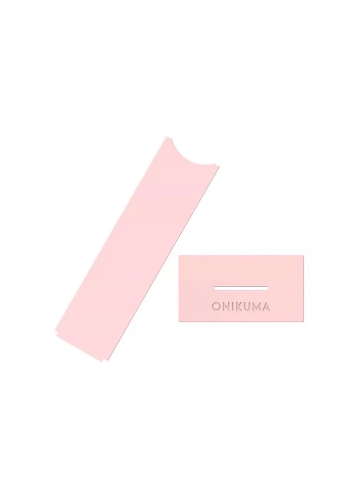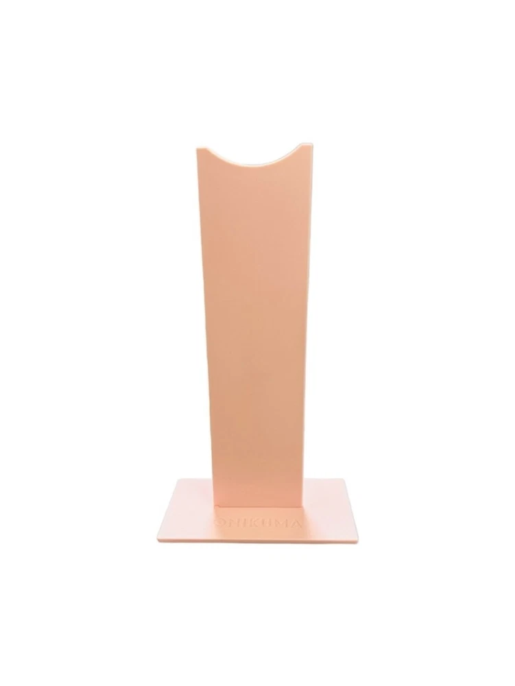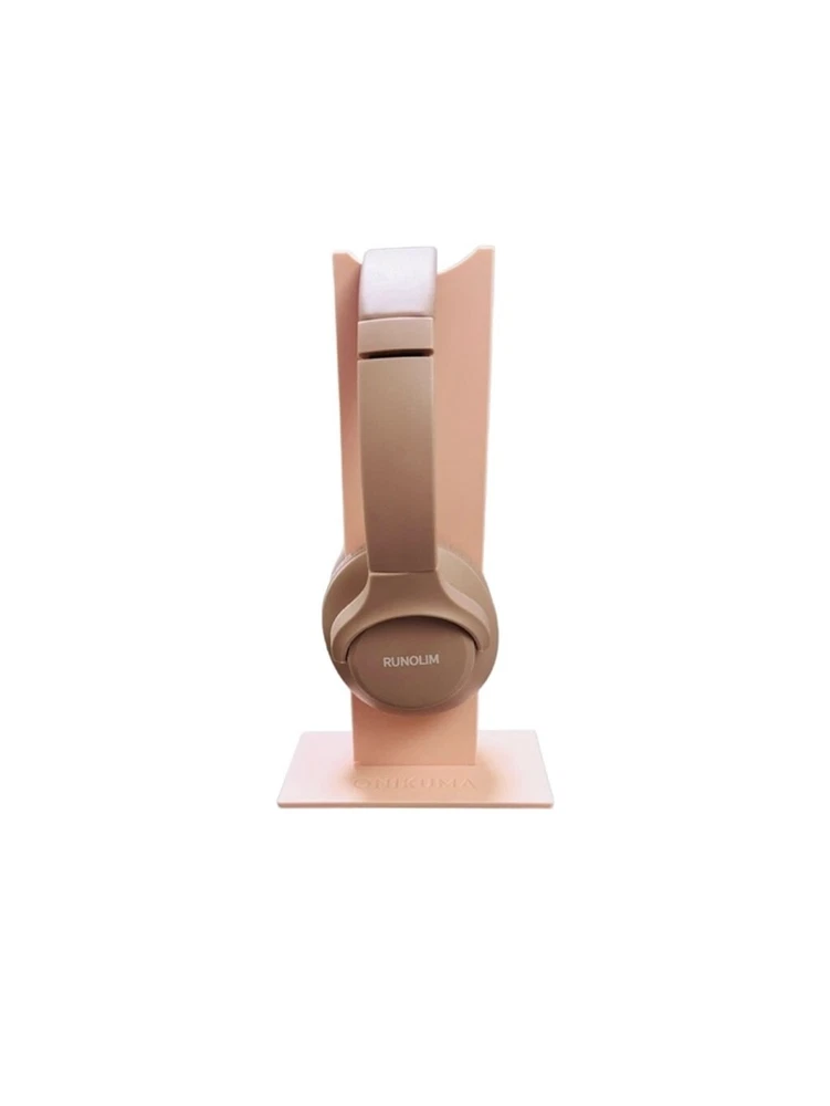 Pre-owned/in good condition - pink headphone stand made by Okinuma. It is made of a sturdy plastic material with a rectangular base and a curved top to hold the headphones in place. Headset has some marks due to use but still works great.