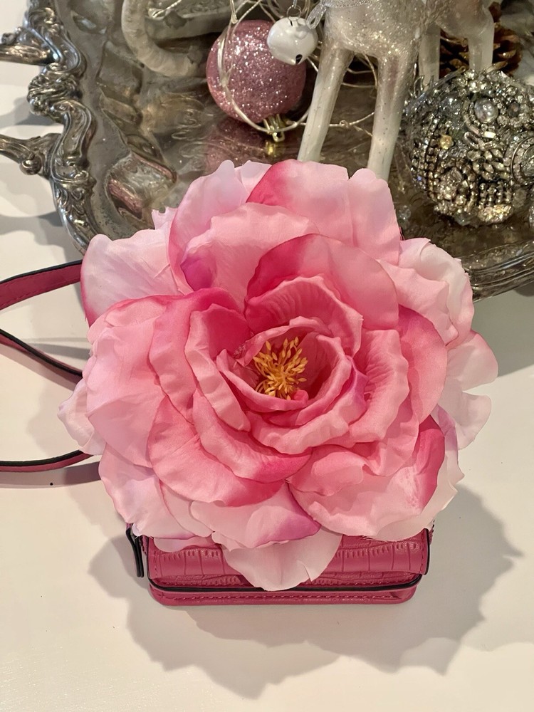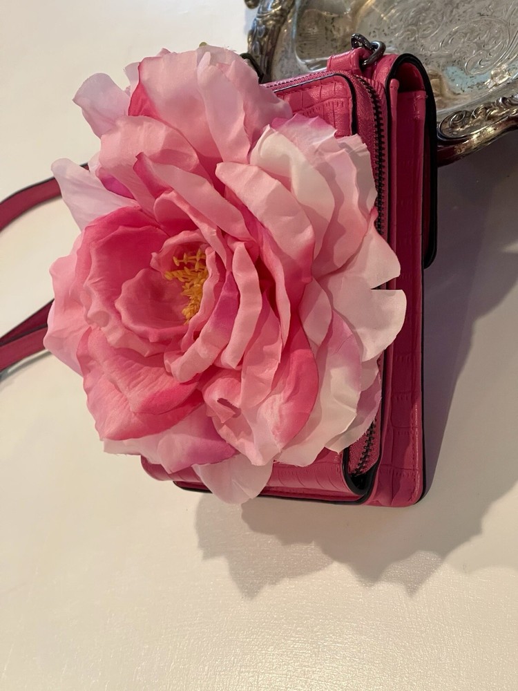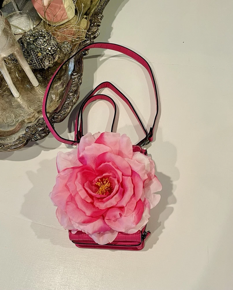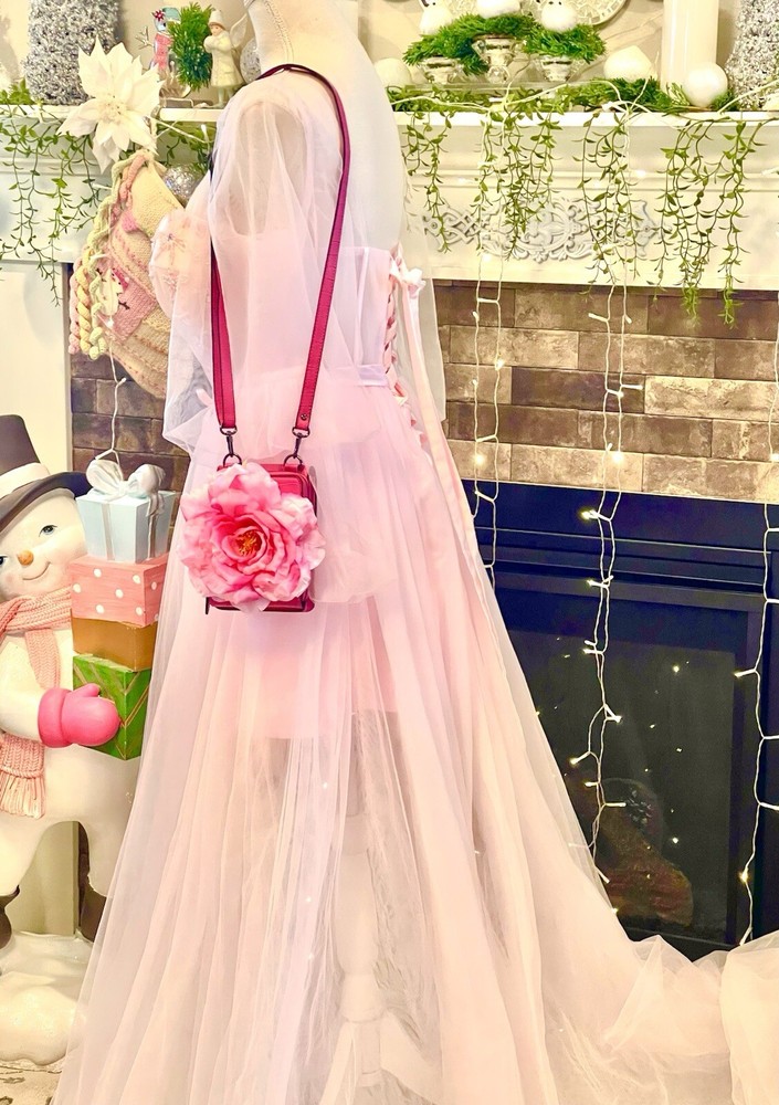 Elevate Your Style with this delightful Pink Rose Crossbody Purse! Carry your essentials in elegance with our Handmade Large Pink Rose Cell Phone Accessory Crossbody Purse. Perfect for those who love combining functionality with beauty, this stunning piece features: Exquisite Handmade Design: A unique, intricately crafted large pink rose embellishment. Perfect Size for Essentials: Designed to securely hold your cell phone and small must-haves. Convenient Crossbody Style: Stay hands-free while adding a chic touch to your outfit. Versatile & Stylish: The perfect accessory for brunch, shopping, or casual outings. Only one available—order now and bloom with confidence! Measurements: Length 7” Width 4” Depth 2” Rose measures 7” W 7” W Adjustable/removable strap 25” Pink Tulle Dress available for purchase. Please see posts or message us.