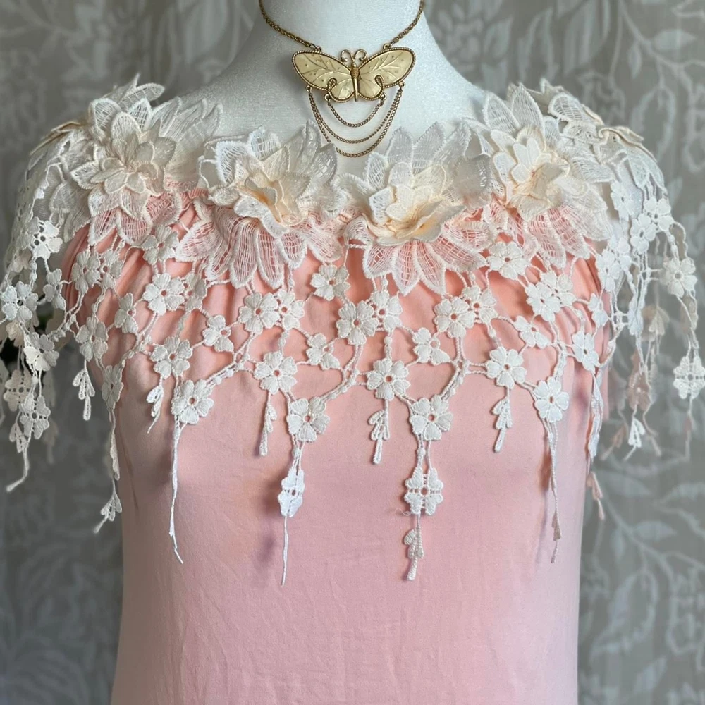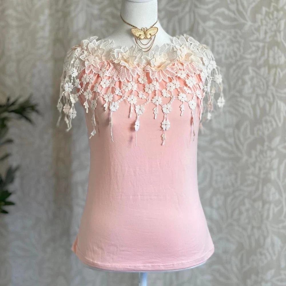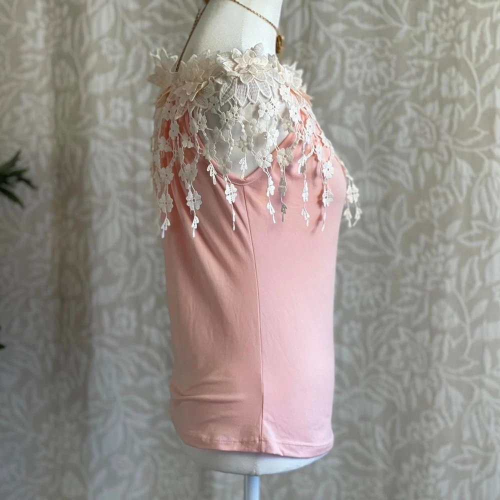Pink & Cream Flower Crochet Top Description: pink stretchy tank top with cream colored 3 dimensional flower crochet detail in US women’s size S/M (please refer to measurements listed below). Condition: excellent condition. One very small discoloration on part of the crochet flower detail (pictured). Missing brand, size, and care tags. Lay flat measurements: - pit to pit: 17 inches - shoulder to shoulder: 11 inches - waist: 15 inches - hips: 17.5 inches - shoulder to hem: 20 inches Mannequin measurements: - bust: 32 inches - hips: 24.5 inches - waist: 34 inches #Fairycore #CrochetTop #Barbiecore #Boho #Ballerinacore