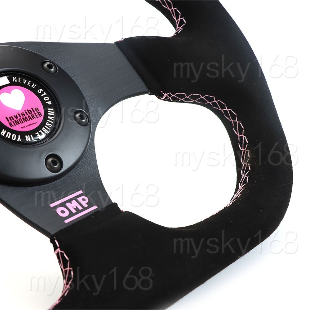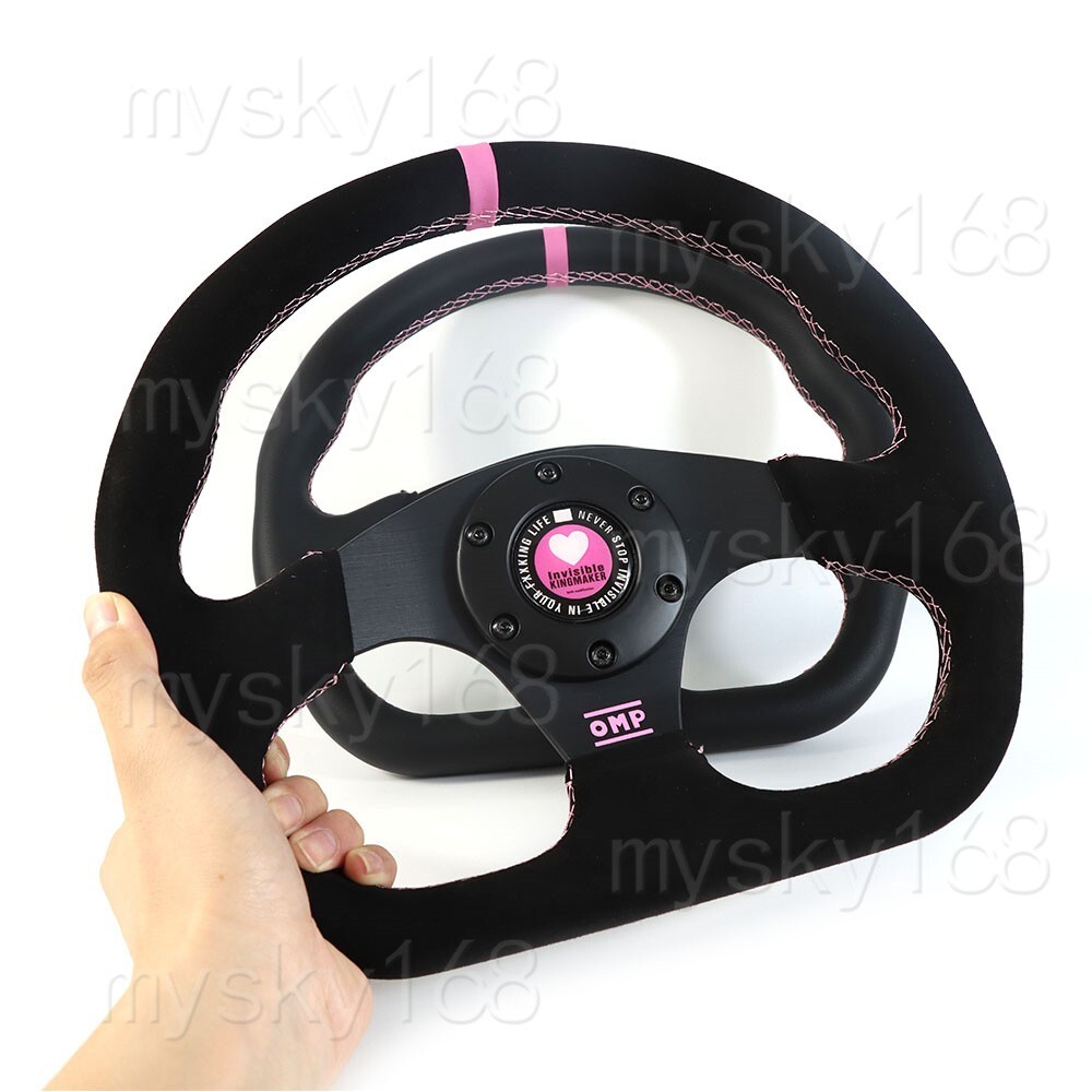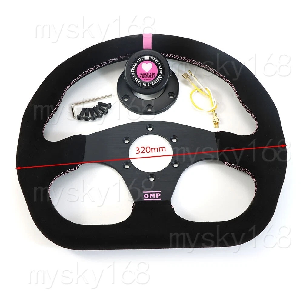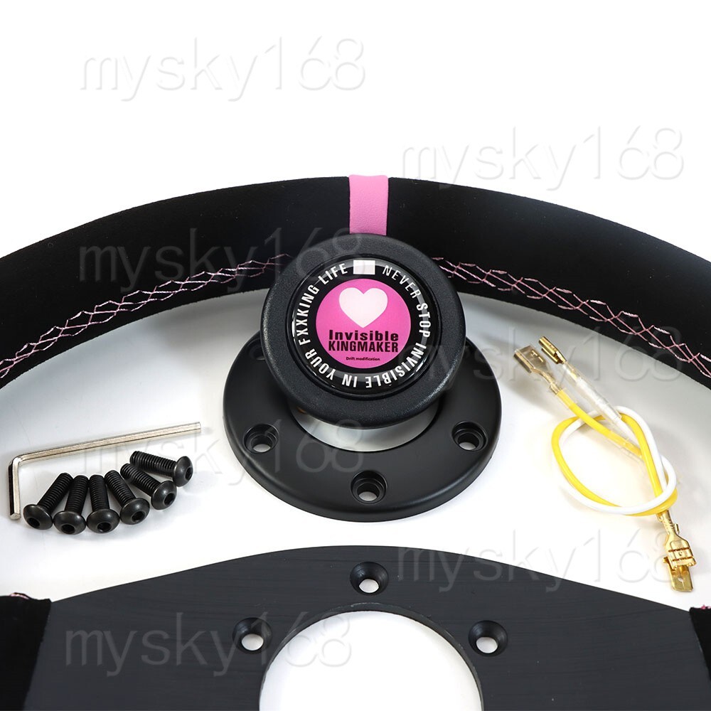Material: Aluminum Alloy + Perforated Leather Color:Black Spoke,pink Stitching Diameter: Approx. 320mm/12.5inch Standard 6 Bolt Fitment, Universal fit for most Aftermarket Boss kit (Boss kit / Adapter Hub is required but not include) Packing list 1 x Steering Wheel 1 x Horn Button 2 x Horn Connecting Cables 6 x Screw 1 x L Wrench