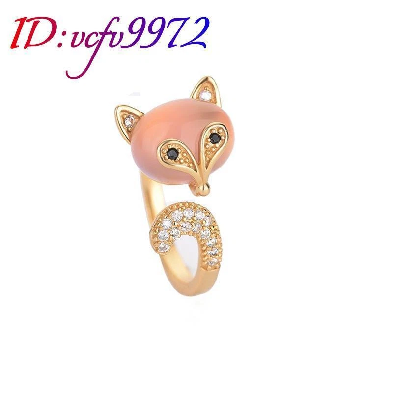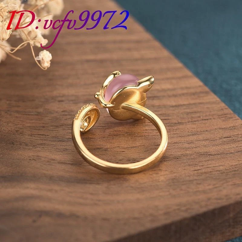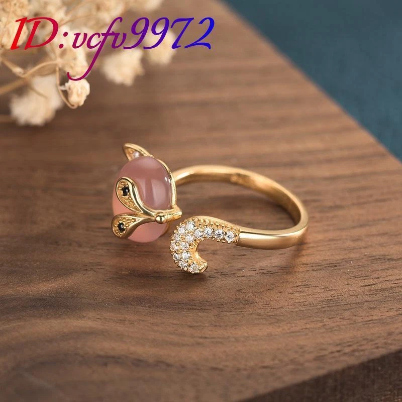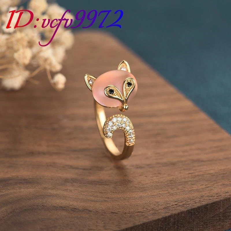 Pink Natural Jade Fox Rings Stone 18K Gold Plated Amulet Real Jewelry