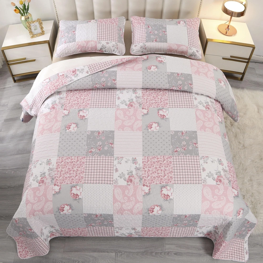 【Material】Shell:100% microfiber | Fill:100% microfiber. Using soft light fabric, comfortable and lightweight bedspread set, good choice for all year round. This quilt set is reversible, both sides could be used individually. Coverlet set Includes: 1 Bedspread + 2 Pillow Cases. 【Full/Queen Size】Quilt: 87" x 95", 2 Pillowcase: 20" x 28". It can be used as the quilt, bedspread and coverlet all season to keep warm, good choice for travel and gift.It can stand alone on your bed or act as a great layering piece creating a lively atmosphere for your room. 【Floral Patchwork Design】A combination of floral and paisley prints further embellish the vintage washed patchwork design making it more beautiful. Charming and elegant, the vintage washed patchwork quilt set makes a good centerpiece for your bedroom décor. 【Four Seasons & Functional Quilt】 It is can be directly covered as a quilt or blanket in Spring & Summer,also can be used as thick bed sheets / bedspreads in Autumn & Winter. Enjoy it in the bedroom, guest room, room, RV, vacation home,etc.. 【Easy Care】The quilted bedspread set which makes the stitching smooth, fine, and compact, which prevents it from falling apart over time and ensures it washes well. Machine wash, tumble-dry low or sun dry. No Chlorine bleach or any additives.