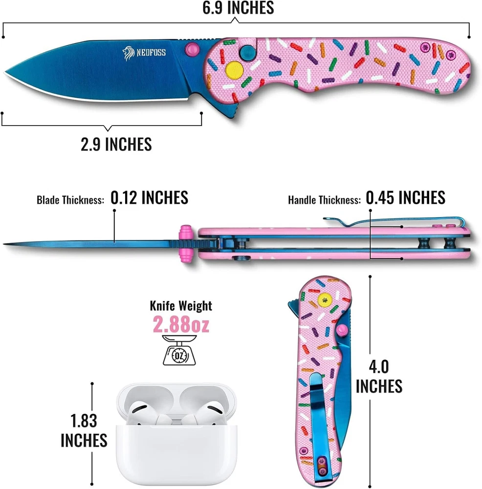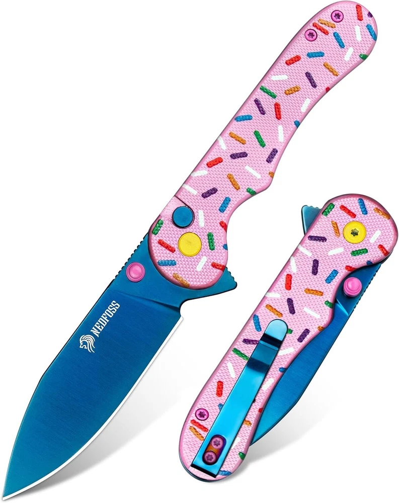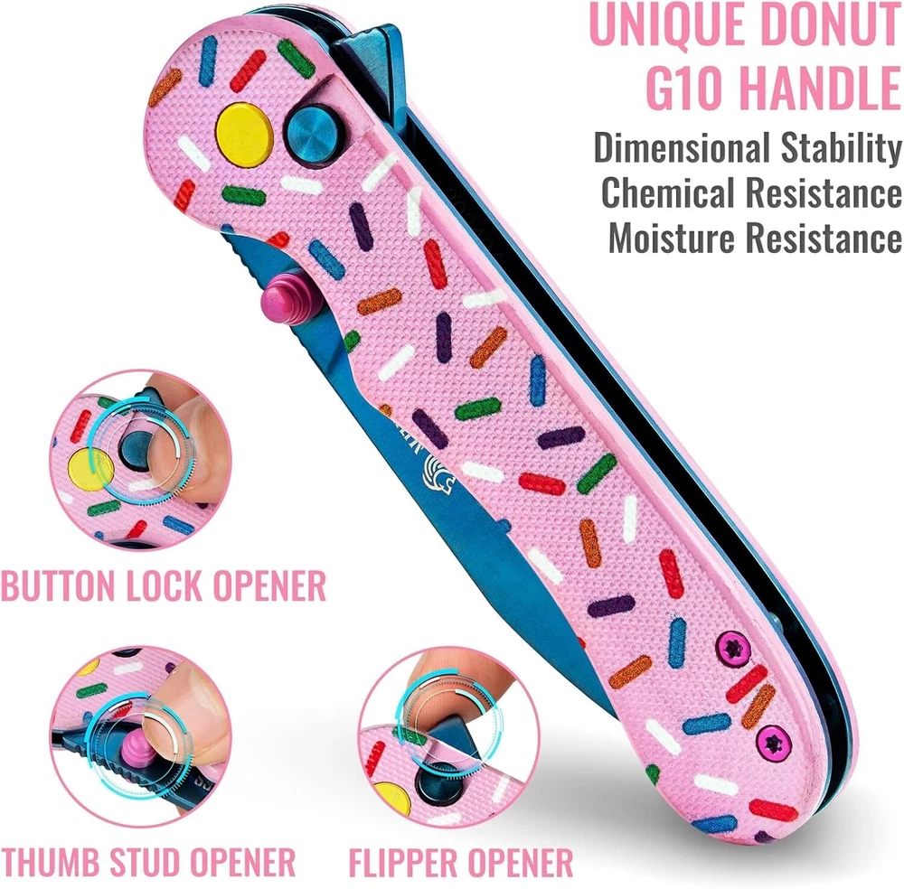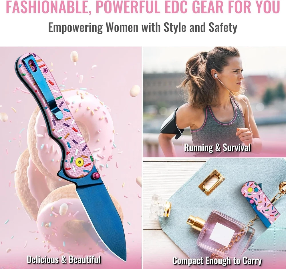 Pink Pocket Knife for Women Men, " Blade Small EDC Knife, 14C28N Steel Button Lock Knife, Unique Design G10 Handle Folding Utility Knife HIGH-PERFORMANCE 14C28N BLADE: The blade of this cute pocket knife is coated with blue titanium and crafted from 14C28N steel, renowned for its exceptional resistance to corrosion, edge retention, and effortless cutting ability. EYE-CATCHING DESIGN G10 HANDLE: With its playful combination of pink and blue handle colors, the pink pocket knife is as fun as a sprinkle-coated . It's sure to turn heads wherever you go. Crafted with precision and practicality in mind, this ergonomic folding utility knife has a lightweight design that fits comfortably in your hand. THREE WAYS TO OPEN BUTTON LOCK KNIFE: Combined with a thumb stud opener and a flipper, this pink folding knife allows for quick and effortless one-handed deployment, providing a secure and easy-to-use locking system for safe operation. DISAPPEARS IN YOUR POCKET: Designed with functionality and convenience in mind, this deep-carry tip-up pocket clip allows for discreet and secure placement in your pocket. Whether you need a reliable urban knife for running, going out alone, or handling other daily challenges, this mini EDC knife is up to the task. PERFECT GIFT FOR EVERY WOMAN AND MAN: Searching for survival gear for women men? Look no further! These small pocket knives & folding knives are ideal gifts for your wife, mother, grandmother, daughter, granddaughter, sister, or girlfriend, partner, groomsman,or anyone else special in your life. Imagine the joy on your loved one's face as she opens her gift on Christmas morning, Mother's Day, birthday, Graduation or even Valentine's Day.