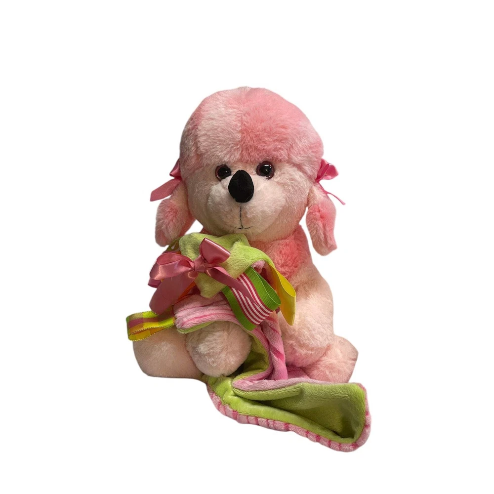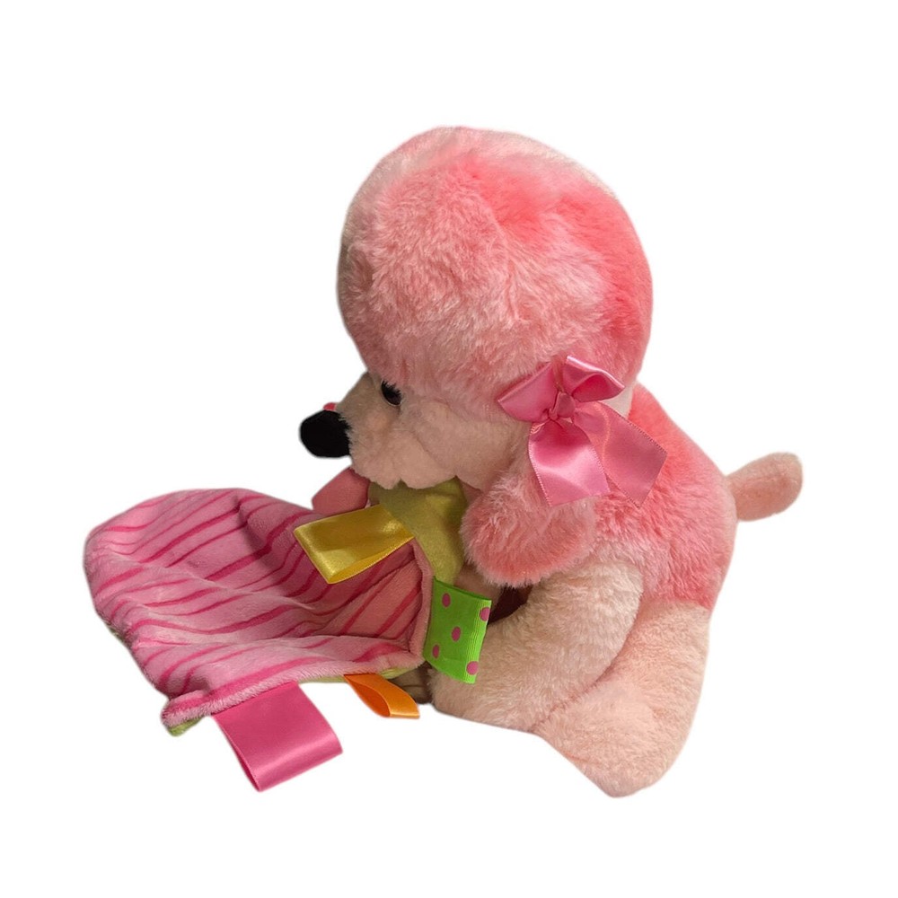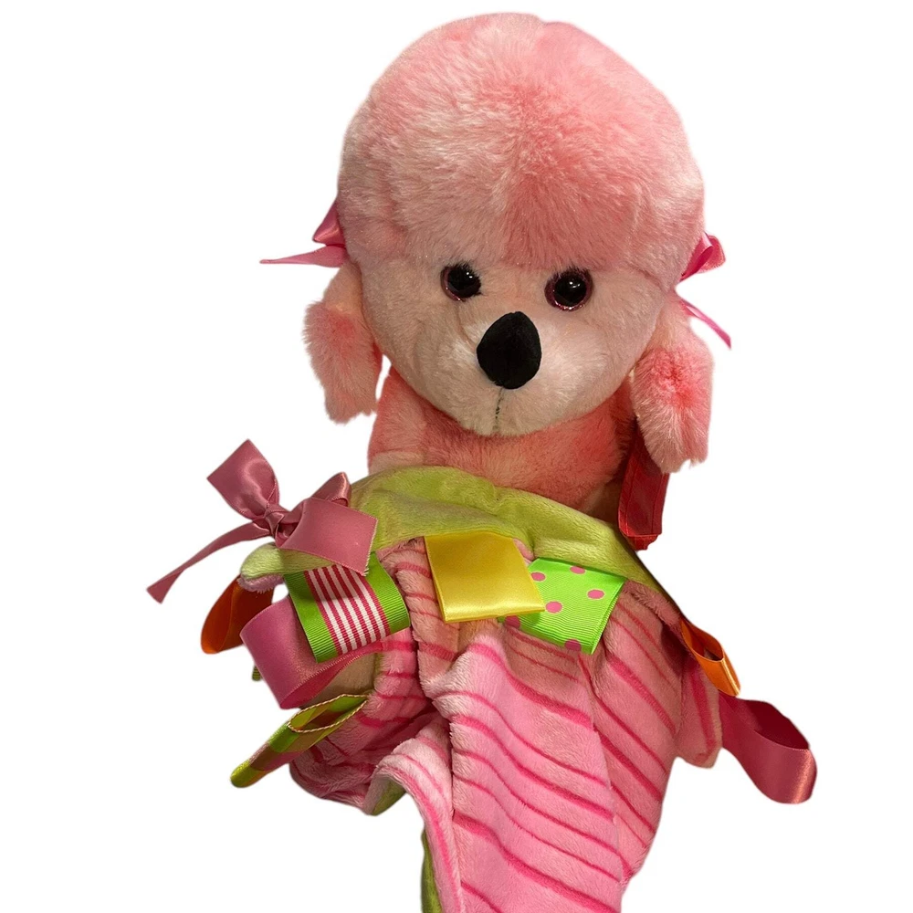 Pink Poodle Plush Toy with Minky Ribbon Tag Lovey Security Blanket