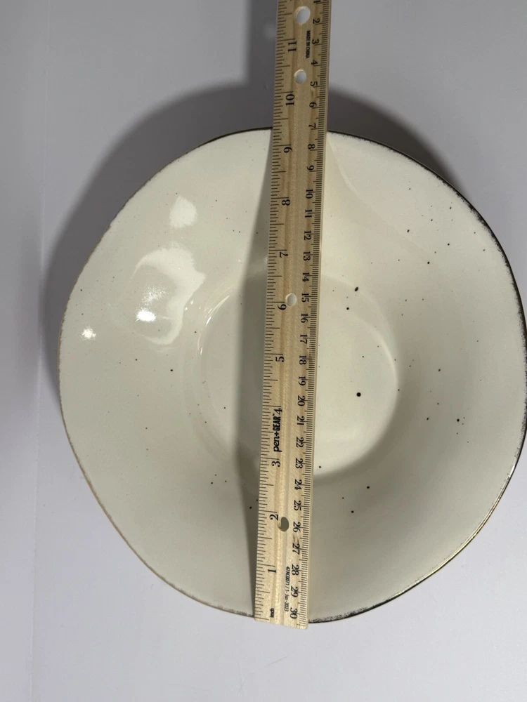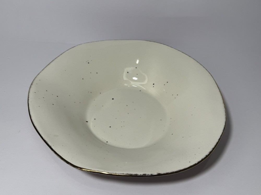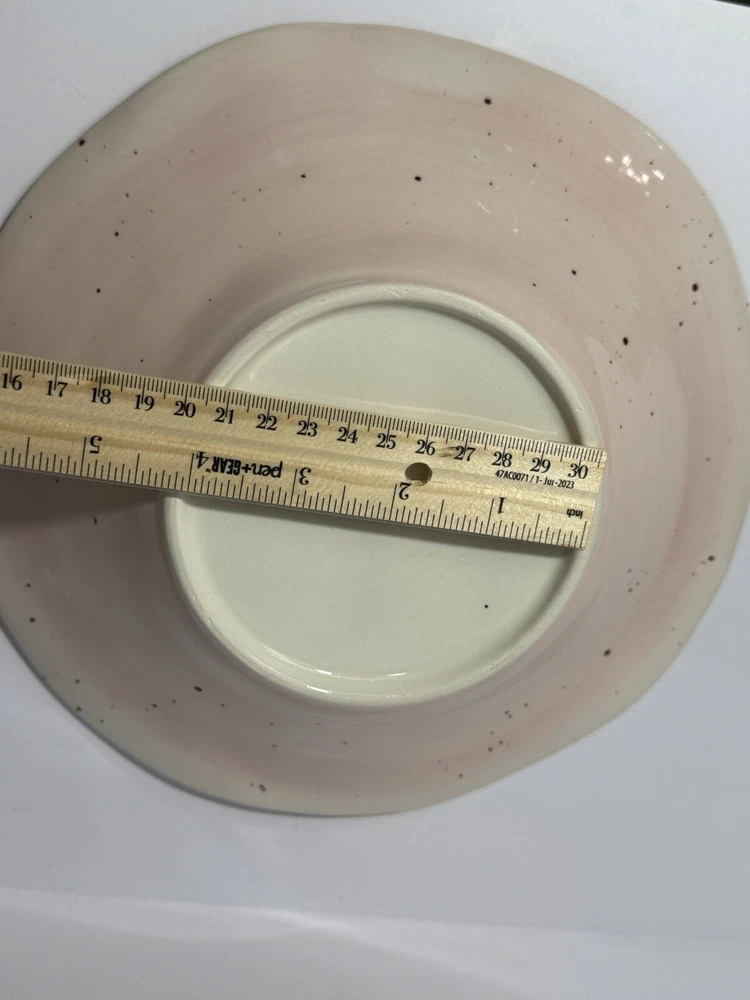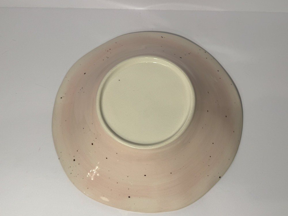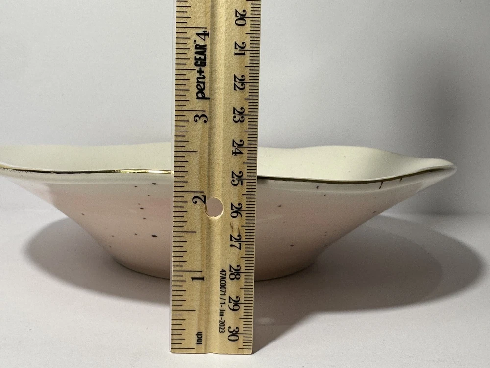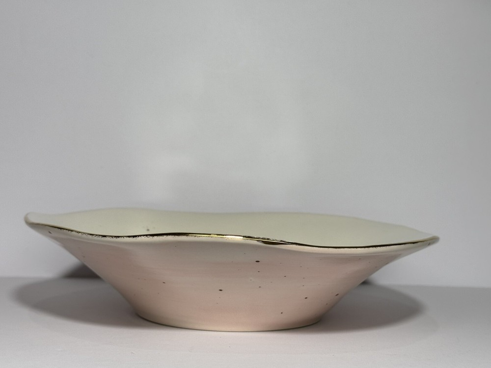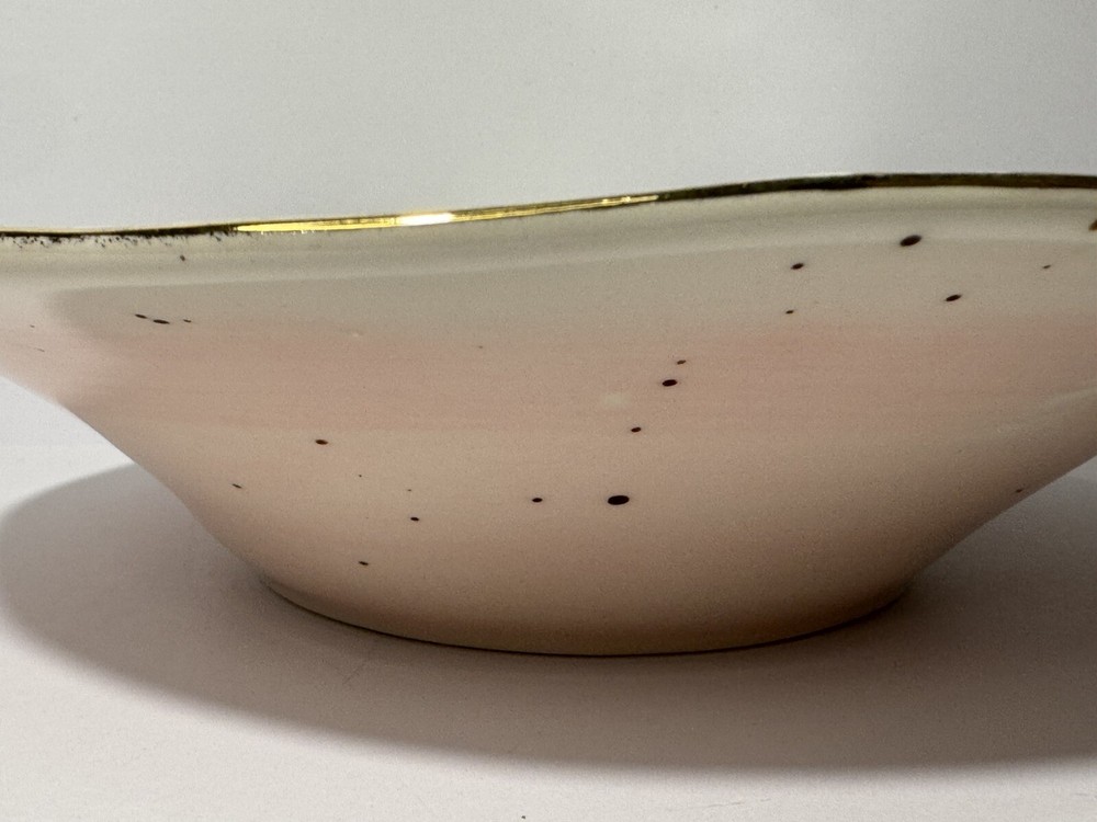 Pretty bowl with pink outside and white inside. Both sides are speckled. The wavy edges are trimmed in gold. Bowl measures 9.5” wide and about 2.25” high.