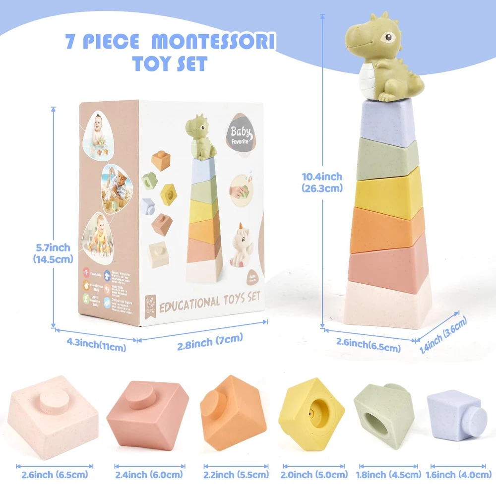 Pink ToToo Stacking & Nesting Baby Toys: Squeeze Teething Baby Toys and Building Blocks with Dinosaur Figure - Newborn Essentials for 6 12 18 Months Baby Toddler Boys 7 Pcs Unique Stacking Toy: The stacking teething toy has six circles of various sizes and a very cute dinosaur on top. The colored appearance, funny sounds can attract baby's attention, and the uneven patterns and patterns on the surface help kids develop their sense of touch. A newborn essentials toy for baby girl and boy! A Variety of Ways to Play: The cute stacking blocks can be built according to the child's ideas, or they can be stacked according to the size, so that the baby can learn to sort by size. In addition, it can also be used as teether for babies, which is soft and durable. When you press the circle, the toy will squeak, which promotes your baby's hearing development. Early Learning Toys: Richly colored stacking blocks with embossed designs help kids identify colors and learn shapes, also stimulate brain development. Kids can improve their hands-on skills and creativity while stacking. As a teether toy, it can release the teething discomfort and exercise the grasping power of the hand. Safe Material & Suitable Size: The stacking toy is made of food-grade silicone material, which is safe and non-toxic, soft and easy to chew. The ring is light in weight and just the right size, suitable for the baby to grasp and prevent accidental ingestion, accompany with the baby girls and boys to grow up. Cute gift for baby & toddler: This 7 in 1 baby toy is a perfect choice for 6-12-18 months baby, 1-3 year old toddler birthday gifts. Unique Stacking Toy: The stacking teething toy has six circles of various sizes and a very cute dinosaur on top. The colored appearance, funny sounds can attract baby's attention, and the uneven patterns and patterns on the surface help kids develop their sense of touch. A newborn essentials toy for baby girl and boy! A Variety of Ways to Play: The cute stacking blocks can be built according to the child's ideas, or they can be stacked according to the size, so that the baby can learn to sort by size. In addition, it can also be used as teether for babies, which is soft and durable. When you press the circle, the toy will squeak, which promotes your baby's hearing development. Early Learning Toys: Richly colored stacking blocks with embossed designs help kids identify colors and learn shapes, also stimulate brain development. Kids can improve their hands-on skills and creativity while stacking. As a teether toy, it can release the teething discomfort and exercise the grasping power of the hand. Safe Material & Suitable Size: The stacking toy is made of food-grade silicone material, which is safe and non-toxic, soft and easy to chew. The ring is light in weight and just the right size, suitable for the baby to grasp and prevent accidental ingestion, accompany with the baby girls and boys to grow up. Cute gift for baby & toddler: This 7 in 1 baby toy is a perfect choice for 6-12-18 months baby, 1-3 year old toddler birthday gifts. Shipping from the USA All of our products are shipped from the USA, ensuring quick delivery to your destination. Payment We offer the following payment methods: PayPal, credit card, bank transfer, and eBay's secure payment system. Free Shipping & Free Returns Shipping within the USA is FREE. Additionally, any return is absolutely free for you. Risk-Free Purchase You have the option to return an item within 30 days without any justification. We cover the return shipping costs! Fast Shipping We ship immediately upon receipt of payment. Generally, the package is delivered within 2-3 days in the USA. If it takes longer, we will contact you. Quality and Costs Made in Europe, USA, China No customs fees or additional charges Total satisfaction guarantee Invoice with declared VAT available upon request in .pdf format Feedback Your feedback is very important to us. After you pay for your purchase, you will automatically receive positive feedback from us.