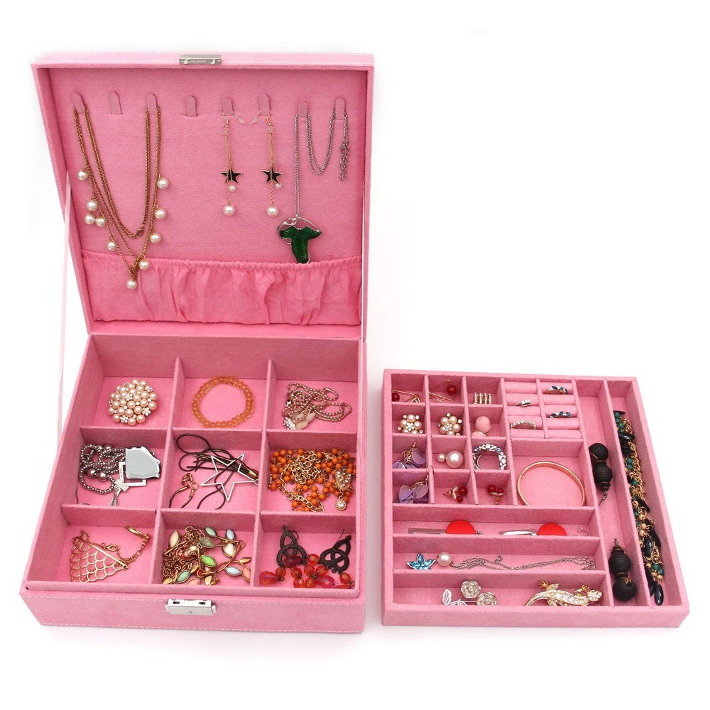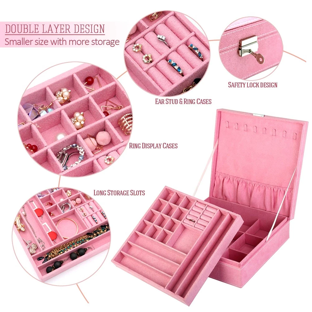 Two-Layer Jewelry Box Organizer Display Storage case with Lock (Pink) Product Details Color: Pink Brand: KLOUD City MPN: KC004 UPC: Does not apply EAN: Does not apply Color: Pink Brand: KLOUD City Material: metal, aluminium, aluminium Engineered Wood Style: Elegant Special Feature: Removable Recommended Uses For Product: Necklace, Ring, Earring Product Dimensions: 10.2"D x 10.2"W x 3.2"H Target Audience: Women, Girls Shape: Square Occasion: Mother's Day, Christmas, Wedding, Anniversary, Birthday, Valentine's Day Color: Pink Brand: KLOUD City Material: metal, aluminium, aluminium Engineered Wood Style: Elegant Special Feature: Removable Recommended Uses For Product: Necklace, Ring, Earring Product Dimensions: 10.2"D x 10.2"W x 3.2"H Target Audience: Women, Girls Shape: Square Occasion: Mother's Day, Christmas, Wedding, Anniversary, Birthday, Valentine's Day Mounting Type: Table Top Finish Type: Polished Inner Material: Metal, Aluminium, Engineered Wood Closure Type: Snap Number of Compartments: 28 Jewelry Storage Type: Jewelry Case Number of Items: 1 Manufacturer: KLOUD City Item Weight: 2.6 pounds Item model number: KC004 Is Discontinued By Manufacturer: No Finish types: Polished Batteries required: No Dimensions (L x W x H): 10.2" x 10.2" x 3.2". Highest quality materials and craftsmanship were used to create this box Two-layers and removable design provides more space.Earrings, rings, brackets, necklaces can be held. Perfect for storing small items such as earrings, rings, beads, etc. There are 9 removable slots under the tray for storing larger bracelets or other infrequently worn jewelry. With elegant appearance and considerate design this display box for jewelry is pefect gift for birthday ,Christmas ,wedding day, Valentine's Day ,Mother's day, Anniversary Day