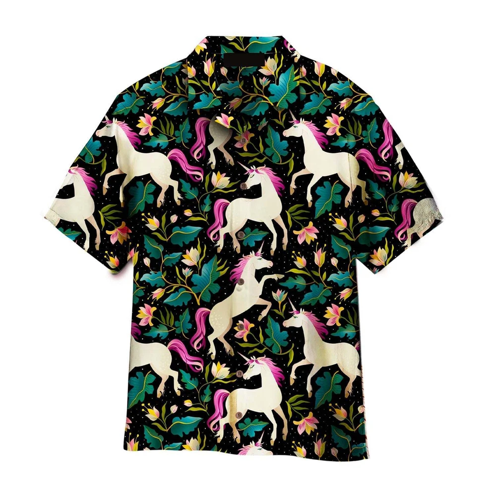 Pink Unicorn Floral Tropical Black Aloha Hawaiian Shirts For Men Women