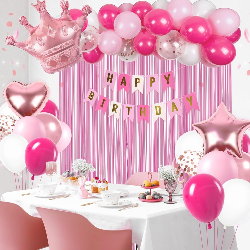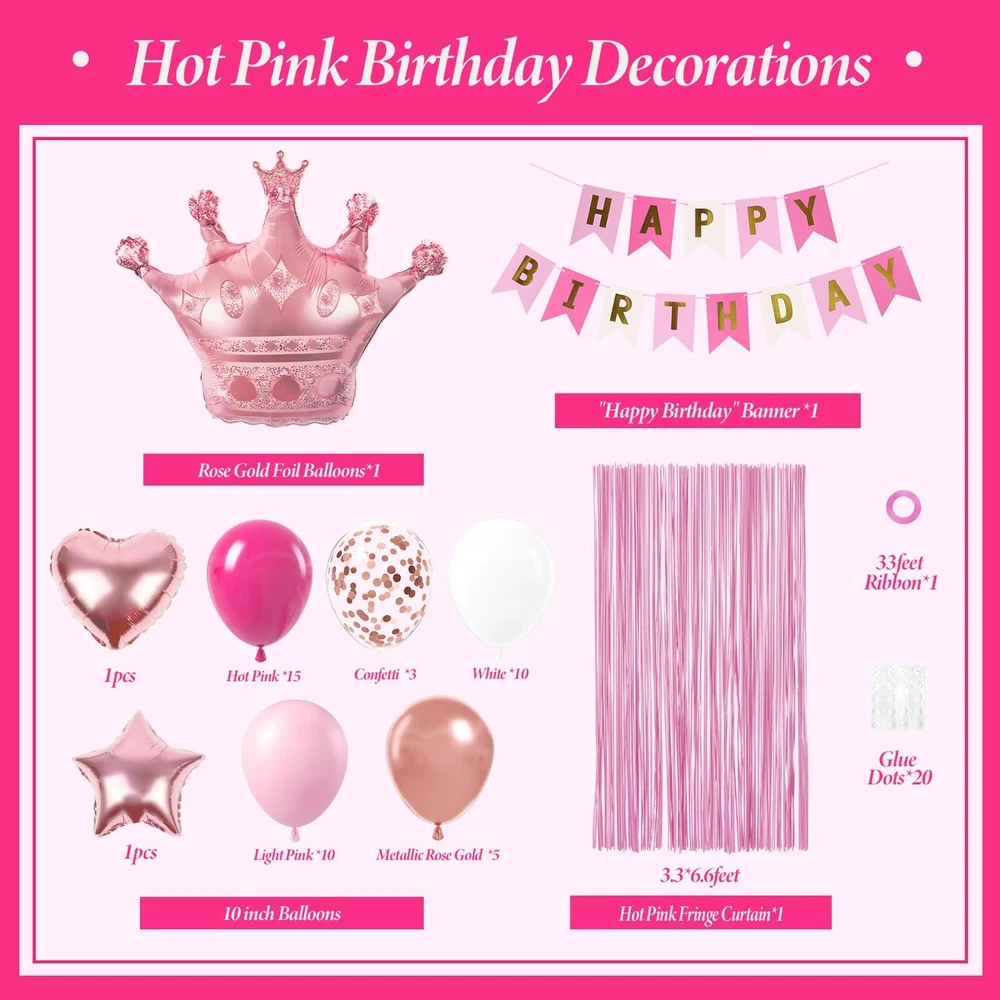 Package Included: The pink happy birthday decorations kit include 10inch hot pink balloons x15, 10inch light pink balloons x10, 10inch white balloons x10, 10inch metallic rose gold balloons x5, 12inch rose gold confetti balloons x3, hot pink happy birthday banner x1, foil balloon x3, hot pink fringe curtains x1, glue dots x60, pink ribbon x1 Full Birthday Decoration Set: The all-inclusive hot pink party decorations set includes a Happy Birthday banner, fringe curtains, and balloons. Great for creating a backdrop or photo booth for celebrations Easy to Use: The pink birthday party decorations bring charm to your party, creating unforgettable memories. The hot pink birthday decorations for women includes glue dots and ribbons for easy balloon arch setup. Hang banners and balloons on walls, windows, or any indoor or outdoor space you like Suitable Occasion: The pink happy birthday decorations kit is great for many happy birthday decorations, that include pink birthday decorations for adults and women, can be used as 16th, 18th, 21st, 25th, 30th, 40th, 50th, 60th, 70th birthday party decorations Warm Tips: If there are any issue with the women birthday decorations set, we will work hard to solve them until you are satisfied