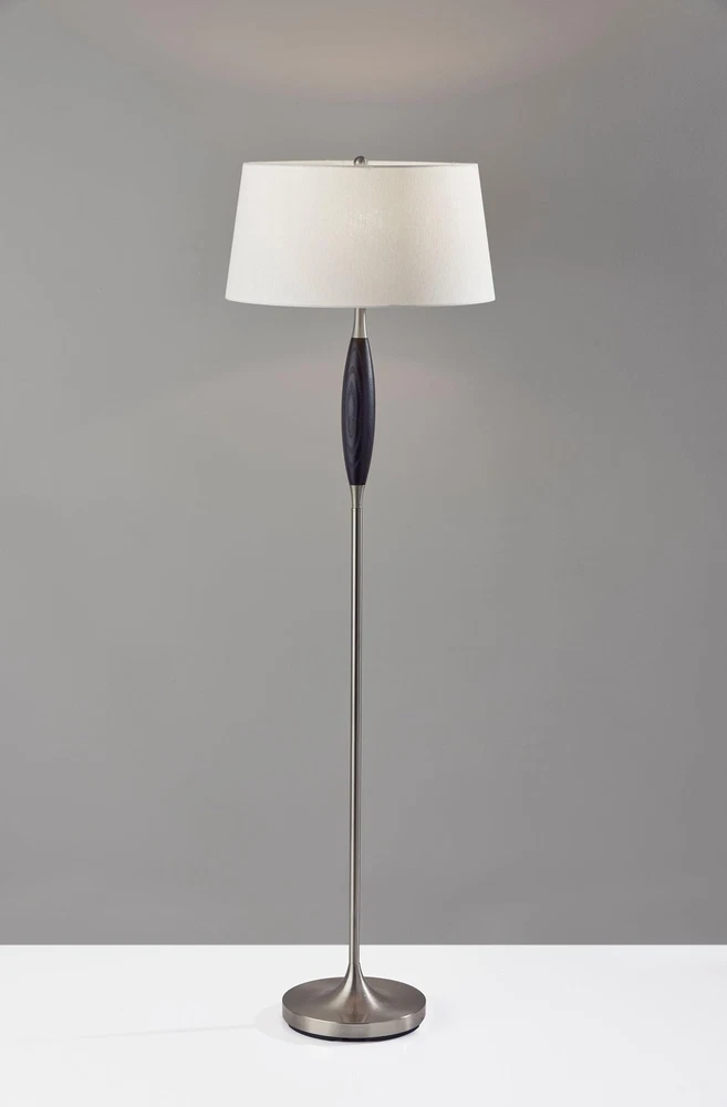 Brighten your room with the elegant style of the 59.25" tall Pinn floor lamp. With a classic silhouette, brushed steel and black rubberwood construction, and fabric drum shade, this lamp brings a contemporary spin to traditional styling. The lean brushed steel stem features a black rubberwood accent piece and leads to a 10" diameter brushed steel round base, while the dark lamp is offset by a white textured fabric shade to softly diffuse light from a 150W bulb (not included). Operated by a 3-way rotary switch to easily adjust the lighting level between high, medium, low, and off, you can always select the ideal lighting for your needs. This floor lamp is also available in a walnut wood and antique brass finish for a more natural look. Complete your home's decor with the coordinating Pinn table lamp. With a classic silhouette, black rubberwood and brushed steel construction, this lamp brings a contemporary spin to traditional styling A soft, white fabric shade diffuses the light and casts a warm glow. 59.25" height is ideal for living rooms, bedrooms, or offices. Complete your decor with the coordinating Pinn table lamp. This lighting product is either UL or ETL listed, meaning that it has been tested and approved to meet the government-regulated safety standards for the USA.