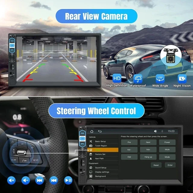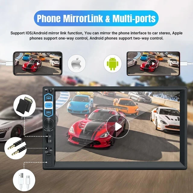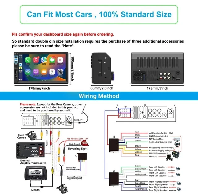 More Features: ◆ 7inch HD Touchscreen Stereo: The double din radio is designed with a pixels 1024x600 HD display, you can enjoy responsive touch feeling with your fingers. Support 1080P video playback on the stereo monitor. ◆ Support with Apple Carplay: Connect with your phone via USB cable that make phone calls,access your music,send and receive messages,get directions. Also can be done through Siri. ◆ Support Android Auto: After connecting through the original mobile phone data cable, you can access Google Maps navigation, play music, make calls, view information. ◆ Phone Mirror Link: Our car audio receivers mp5 player adopts advanced mobile mirroring technology, via USB cable connection, you are able to access high quality pictures, gps navigation, messages, video and music in the car. ◆ Bluetooth 5.1: The car stereo double din uses the latest version 5.1, fast transmission speed, higher stability, answering/making calls, hands-free without interference. ◆ Rear View Camera : Package includes a rear backup camera. The double din car stereo with backup camera takes safety to another level by shut down other apps every time you put your car in reverse to see the rear surroundings on your screen. ◆ FM Radio: Users can automatically and manually search for channels, there are 18 preset stations, and you can save your favourite stations. ◆ 5 Modes Input: Phonelink, USB device, TF card, Aux insert, Front camera. If you have a DVD player in your car, just connect your DVD to the video input interface of this apple carplay radio head unit, the unit will serve as a display screen. ◆ Stylish LED Buttons: 7 colors which switch automatically with the possibility to set a unique one of your choice, and a stylish design for this multimedia system LED buttons!(Blue/Green/Cyan/Red/Magenta /Yellow/White/Auto) ◆ Time Setting: Set your time freely, the time format as 12-hour or 24-hour. ◆ SWC: Car radio bluetooth supports steering wheel control, answer/make calls with no distractions. ◆ Online GPS/Navigation: Has specific hardware solution to integrate IOS CarPlay or Android Auto into its system so that you can run iOS Maps or Google Maps/Waze on the 7 in HD touchscreen, as long as they are available on your phone. ◆ Note: The carplay stereo player is not the GPS unit. It obtains the GPS navigation function by connecting to the cellphone. Support with Apple Carplay: ◆ The current Carplay system supports the latest version of the system IOS. With Carplay, you can use online map navigation, play music, listen to the radio, make hands-free phone calls, listen to text messages and use the voice assistant "SIRI".Hey Siri - support intelligent voice assistant, while keeping your hands free for totally safe driving maneuvers! Support with Android Auto: ◆ Connect your phone to your car display and walla your Android apps show up onscreen, simple and easy. you can make phone calls, play music, GPS navigation etc, you can also use voice control through "Google". Help you eliminate distractions that cause you to lose focus on the road ahead of you. ◆ Note: Please use the original USB data cable for the connection. Otherwise, the phone may not connect normally or may not be recognized. Many of the USB cables currently on the market only have the function of charging and not the function of data transfer. Support MirrorLink for IOS & Android Phone: ◆ Let your family enjoy their favorite movie when you’re on a road trip. This car stereo with bluetooth is compatible with MirrorLink which makes it possible for you to cast movies, TV shows, and photos from your supported device and onto the bigger 7inch touch screen. Upgraded Bluetooth 5.1: ◆ 7inch double din car stereo with bluetooth support answer / make calls and be hands-free with no distractions. Listen to your favorite music services and apps with the Bluetooth wireless stream for audio. Built-in microphone, making your call more clear. Stable FM Radio: ◆ FM Radio Receiver: Tuning range: 87.5-108MHz ◆ You can choose FM1, FM2, FM3 channel band, to save 18 stations preset. ◆ Radio reception is not affected even in bad weather. Support FM Radio Function with Memory Stations. High sensitivity, the sound is very clear. EQ Setting: ◆ With its built-in 10 bands EQ adjustment, this car radio mp5 player lets you enjoy crisp and clear sounds while you drive. ◆ It also offers a wide range of multimedia input. The built-in Preset EQ allows you to choose from preset EQ curves for a variety of music styles such as Classic, Rock, Jazz, Pop, Flat, User. Steering Wheel Control: ◆ Support the built-in steering wheel control function of your car. Connect the SWC cable reserved in you car to the brown cable from the stereo hareness. Conveniently switch your songs/ volumes/ calls by the steering wheel that greatly enhances driving safety. Car Stereo with Backup Camera ◆ The double din car radio supports the rear view and will display the image automatically when the vehicle shifts into reverse. HD night vision rear view camera is included, ultra-wide viewing angle of 170 ° and a fully waterproof design, helps to park more safely and easily. We provide detailed backup camera wiring steps, very easy to install. Important Tips: Our radio size: 178mm*100mm. ①Please read our car stereo size carefully in the picture, confirming that your dash size, factory wiring harness and radio antenna adapter are suitable before ordering, if not, you need to buy a special harness, dash kit, antenna adapter extra according to your car model. ②Please read the instructions before installation and contact us with any questions about the installation. ③The unit is not android system. 【100% Customer Satisfaction Service】 - The wiring of the car stereo with apple carplay is a bit complicated, each color is connected with different functions, please compare with our picture or installation manual. If you have any questions about the bluetooth car rad