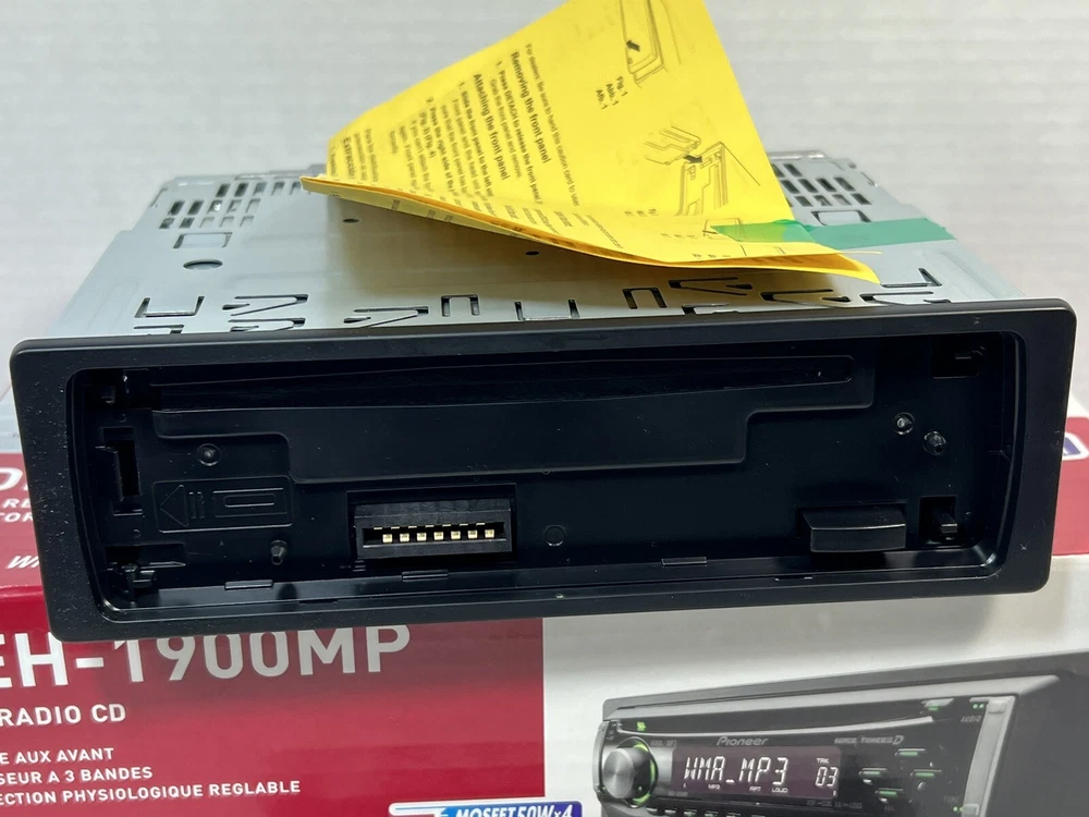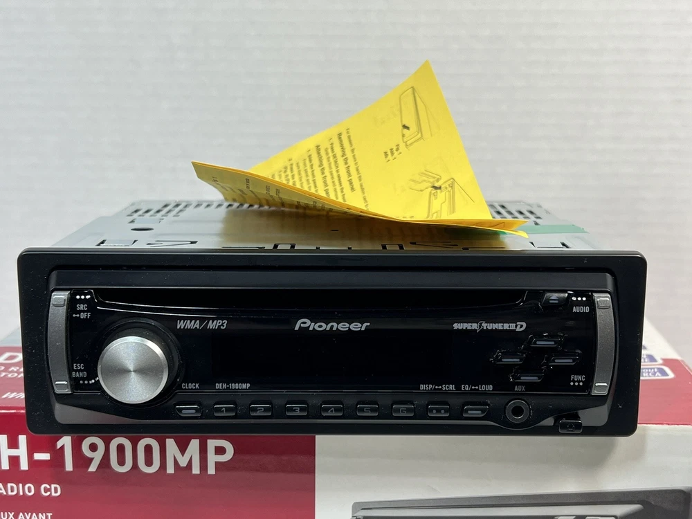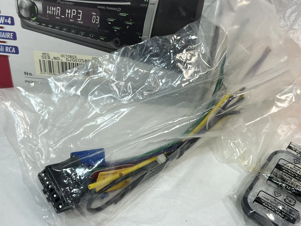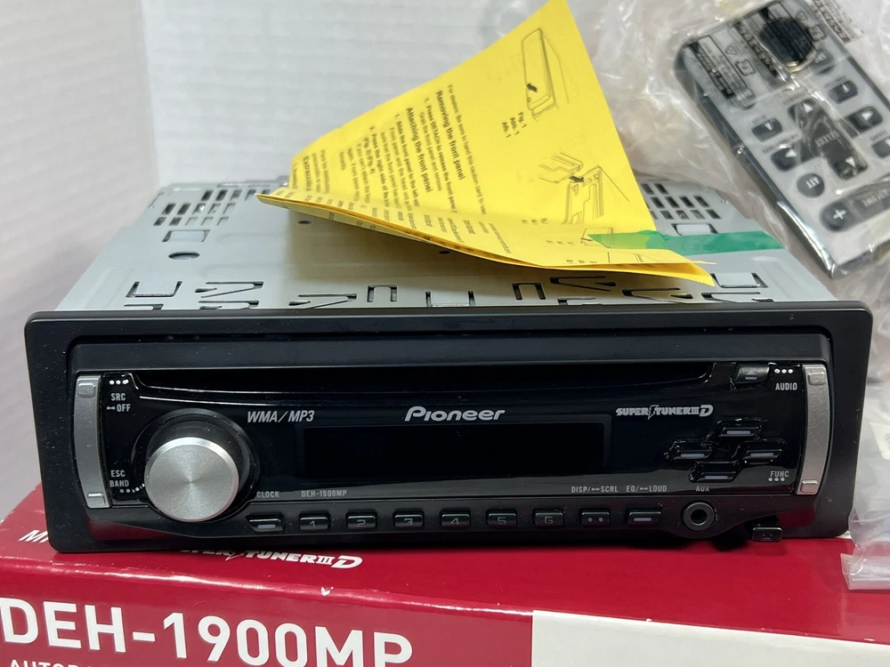 Pioneer DEH-1900MP CD Player In Dash Receiver w/Remote - NEW - UNTESTED I am not the original owner and I am unaware what its working status is. It looks to never have been used. The remote is included, the battery has never been installed. It comes with the one wire harness that plugs into the rear port. Also included is a sealed bag of screws/parts. Comes with the manual and install instructions. The box does not have the foam insert. Please review all the pictures for what is included. If there are parts missing I am unaware of what they are. This unit is being untested and as is. Please let me know if you have any questions.