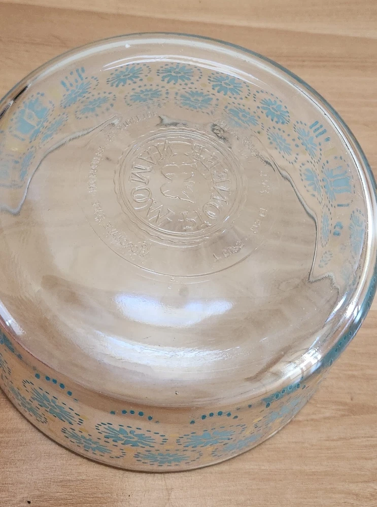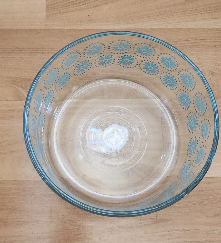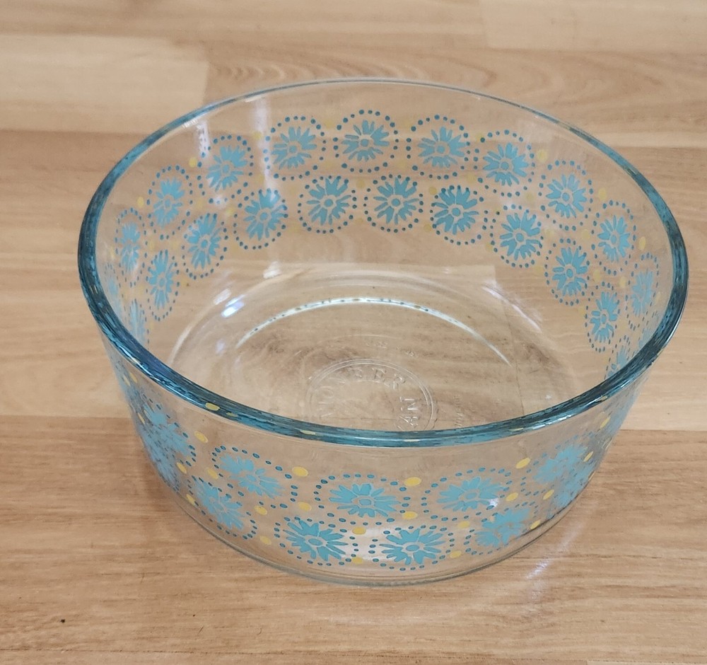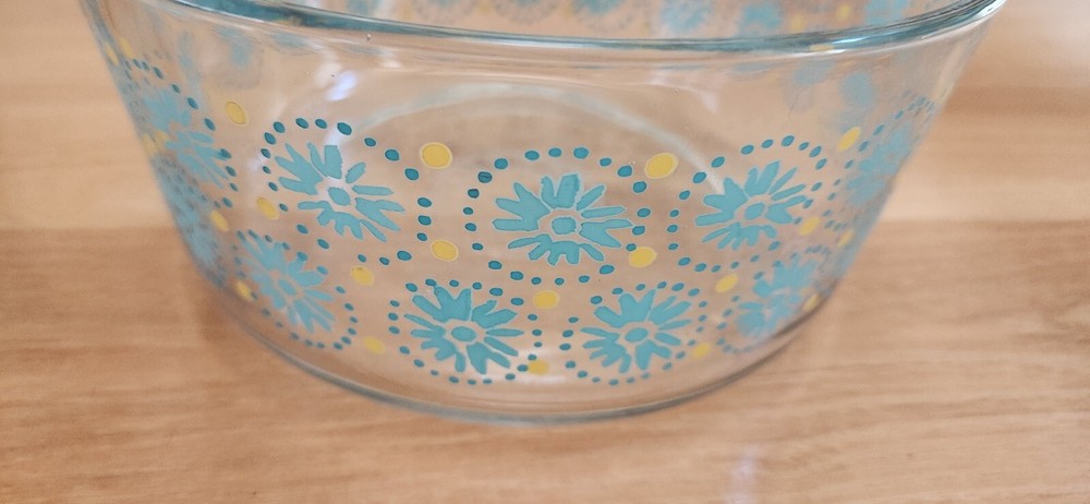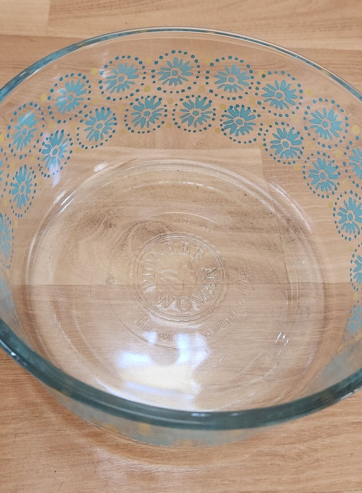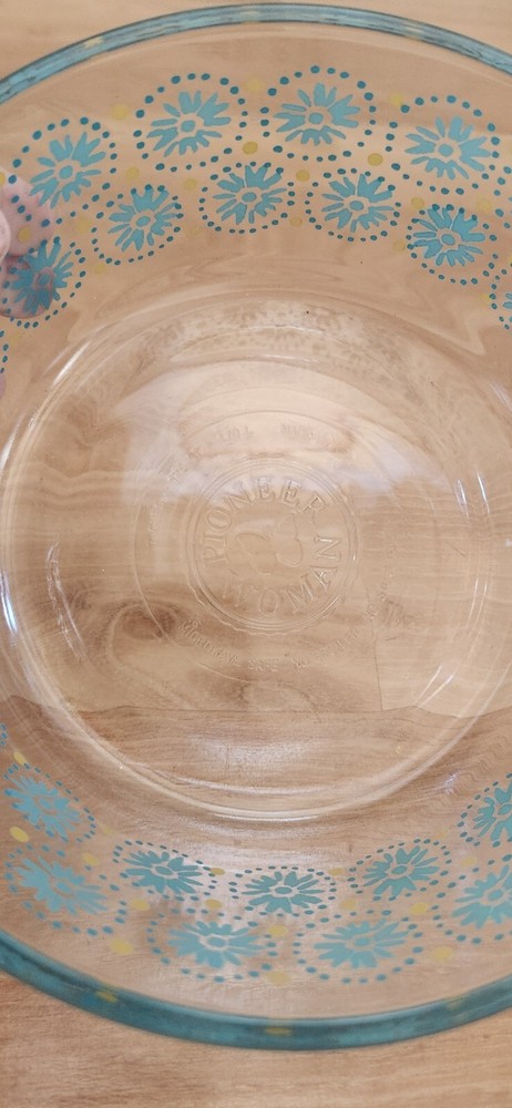 Pioneer Woman 7 Cup Glass Serving Mixing Bowl Dandelion Aqua & Gold. No Chips or scratches Made in USA Microwave safe