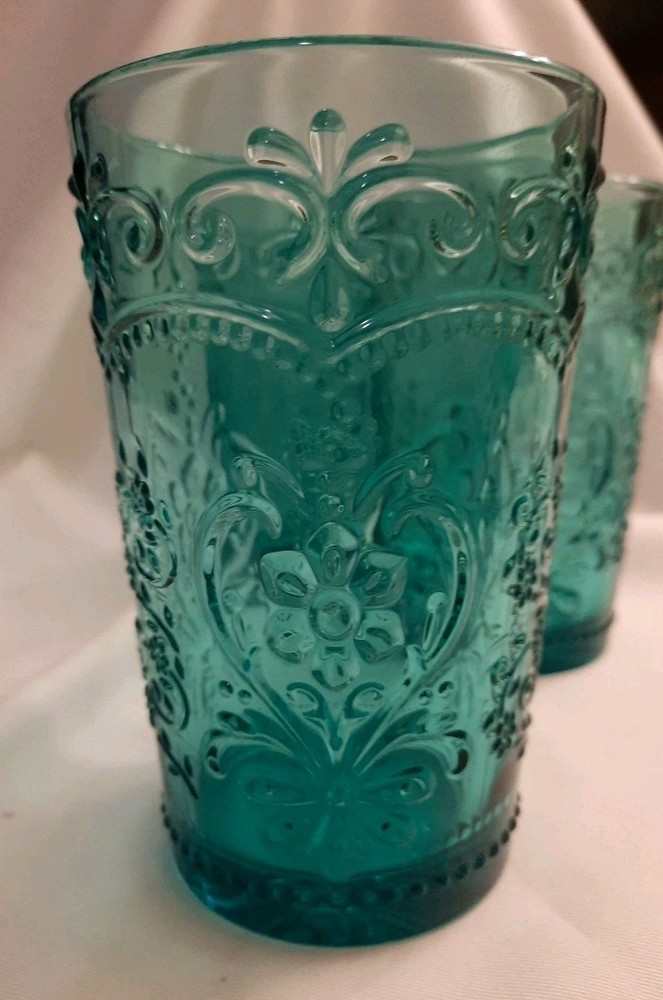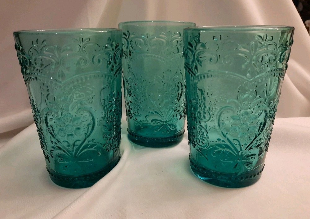 This set of 3 Pioneer Woman Amelia Glass Tumblers in Teal is perfect for any farmhouse-inspired kitchen or dining area. The round, 16oz tumblers feature a beautiful blue color and are made of glass, making them ideal for all occasions. Each tumbler stands at 5.25" tall and has a 3 3/8" diameter, providing ample space for your favorite beverages. The set includes three tumblers, making it convenient for serving drinks to a small group of guests. Made in China, these drinking glasses are a stylish addition to your home.