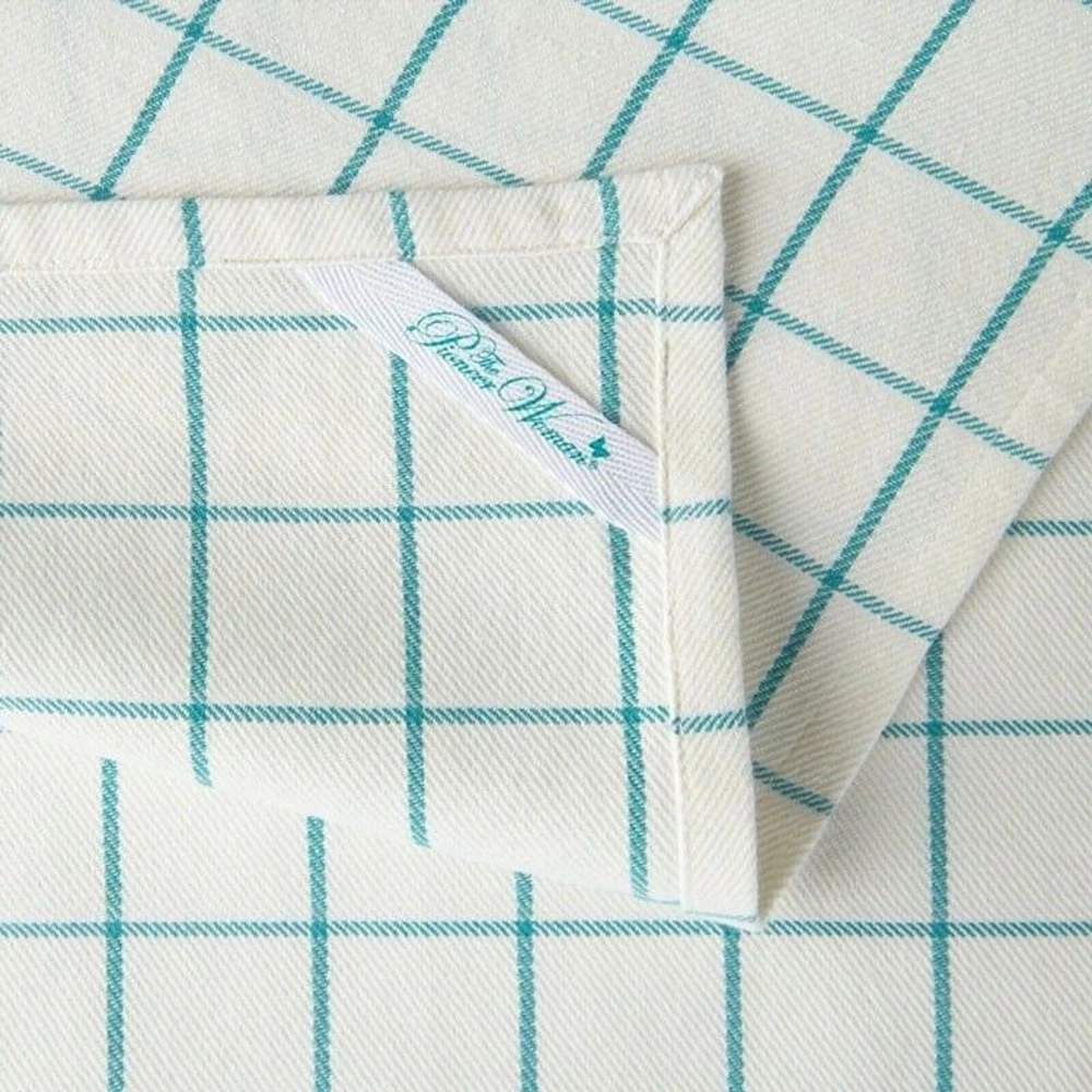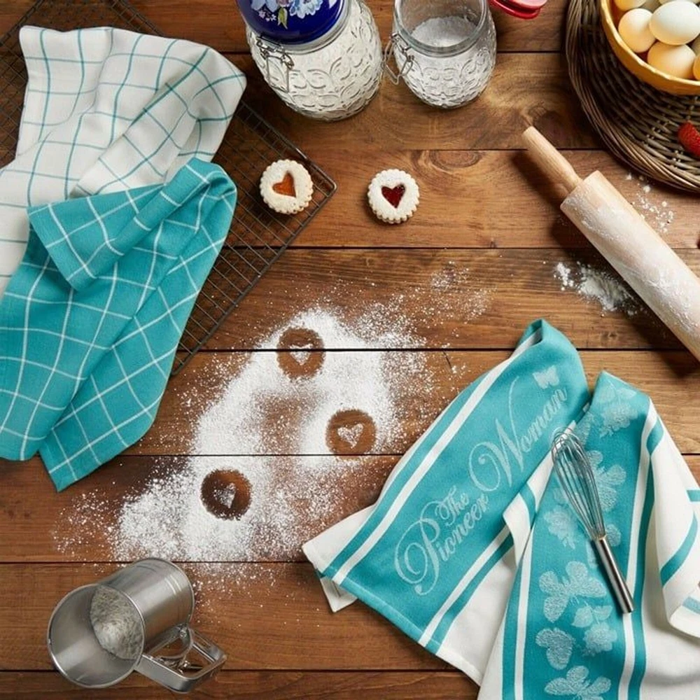 This set of 4 coordinating kitchen towels will add style and function to your farmhouse kitchen decor. Each towel features a different design in the matching colors of teal and white. A mixture of The Pioneer Woman logo, butterflies, grid, and stripe patterns complete this set of kitchen towels. These towels are sturdy enough to dry dishes and handle everyday messes yet pretty enough to display with your kitchen décor. The Pioneer Woman Butterfly Kitchen Towels are made of 100% cotton, making them machine washable for ease care. Each towel measures 16"W x 28"L. We stand behind all our merchandise. Shelf O-3