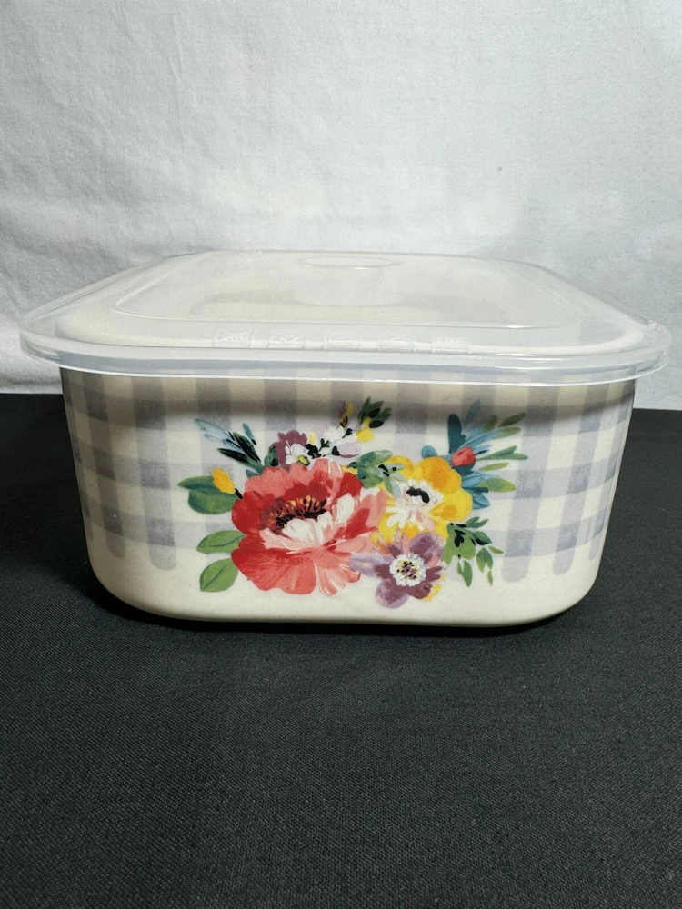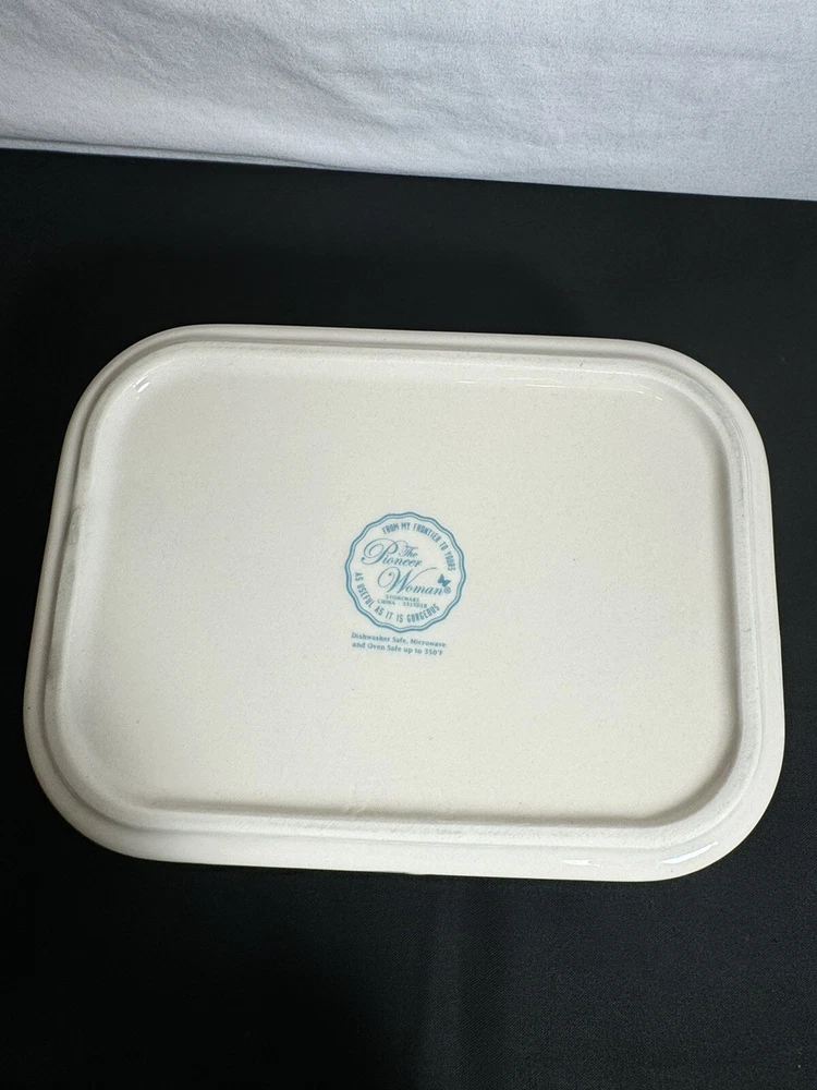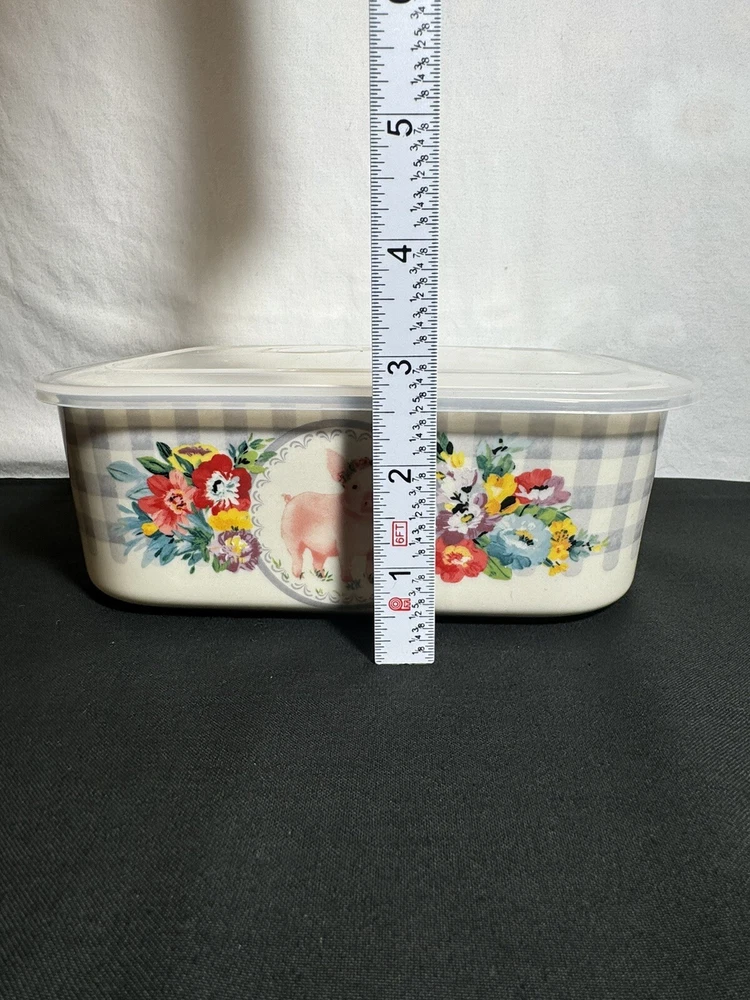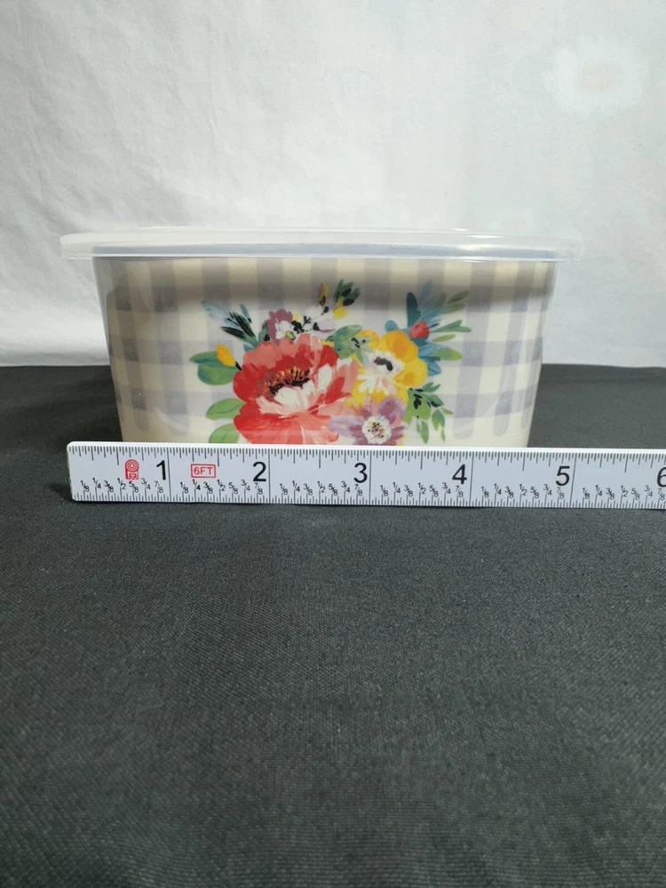 The Pioneer Woman Ceramic Food Storage Container in the Sweet Romance pattern is perfect for keeping your kitchen organized and stylish. This rectangular container measures 7.25 inches in width, 5 inches in length, and 2.75 inches in height, making it ideal for storing a range of food items. It features air vents, easy-to-clean surfaces, and is dishwasher safe, ensuring that your food stays fresh. *lid has small crack, not broken off, lid still works perfect. See pictures.