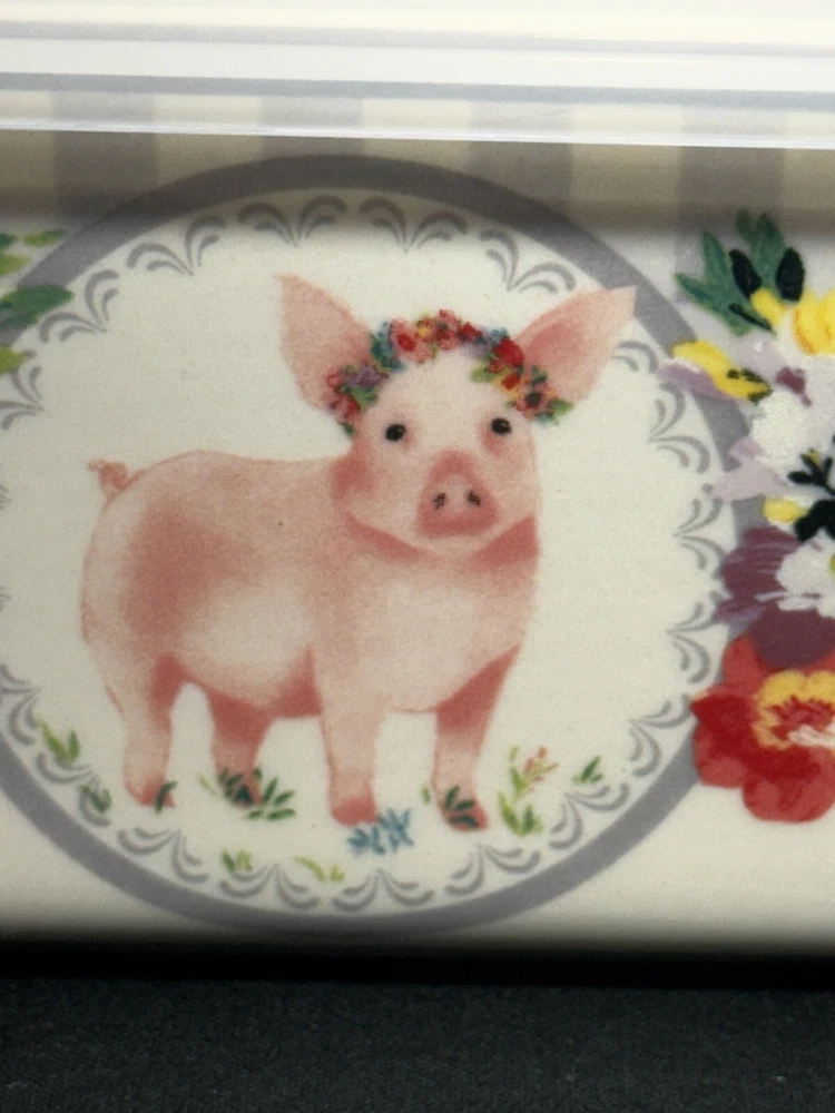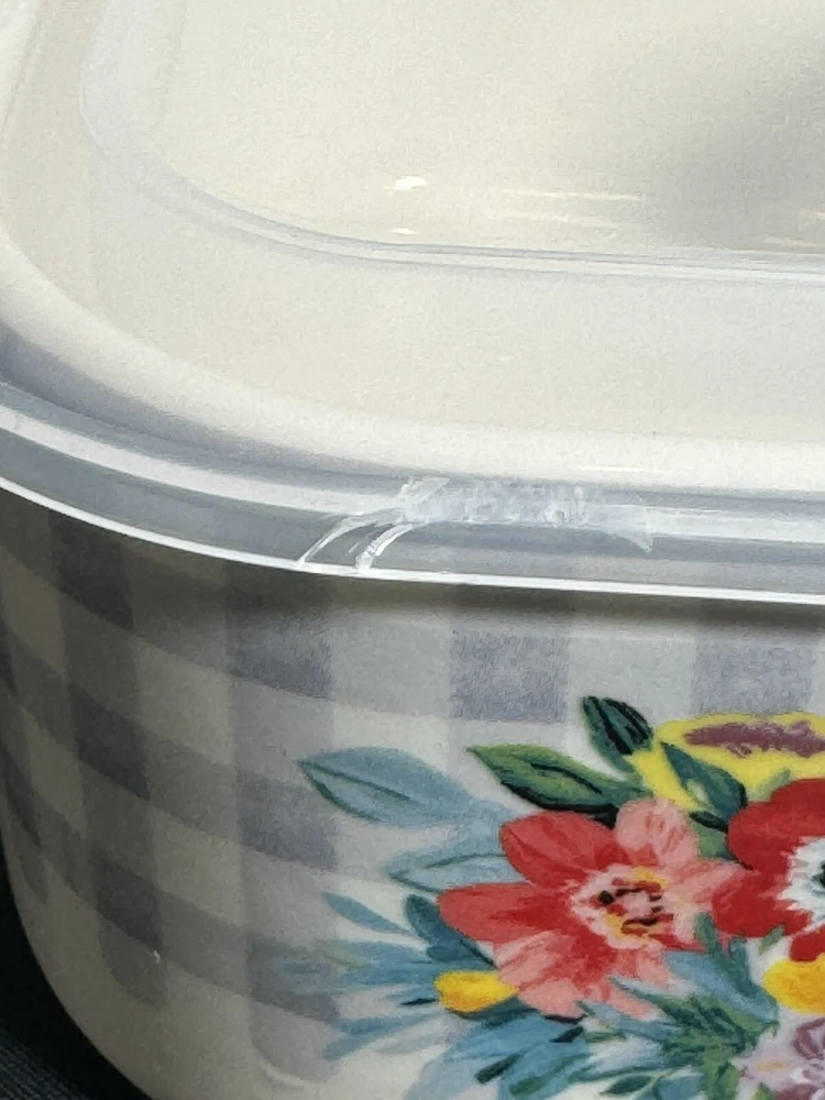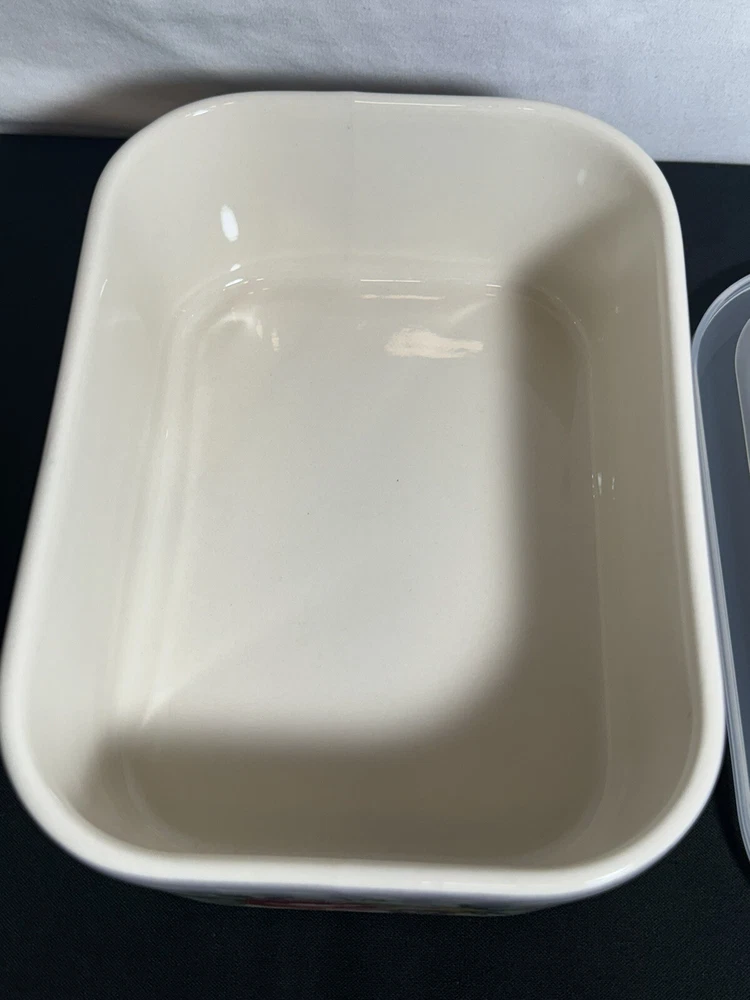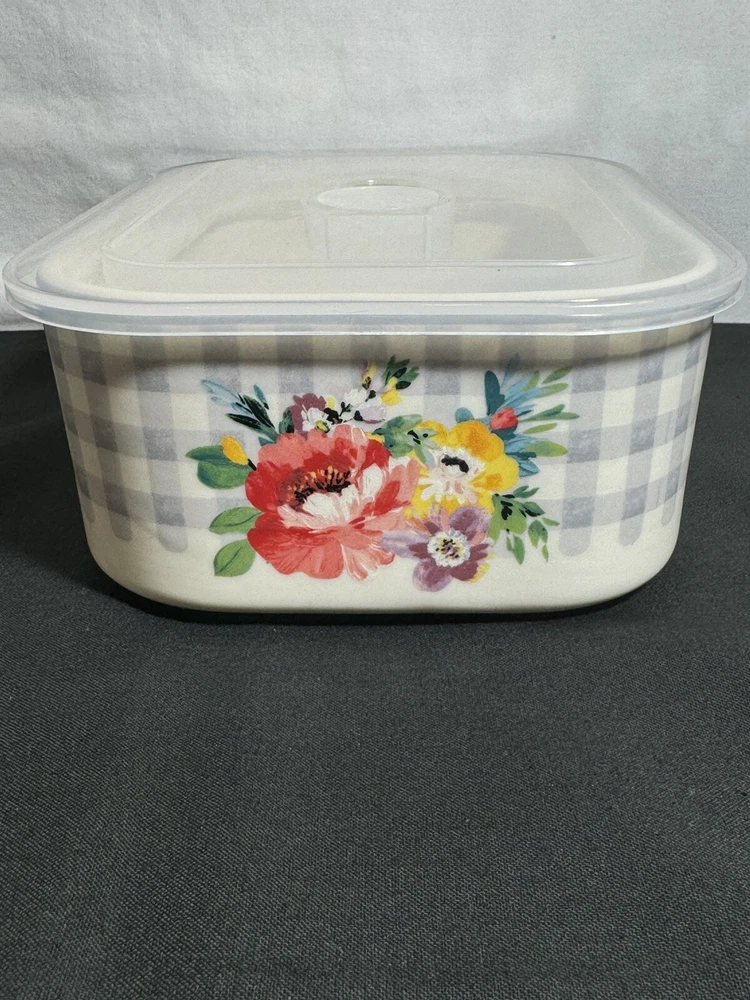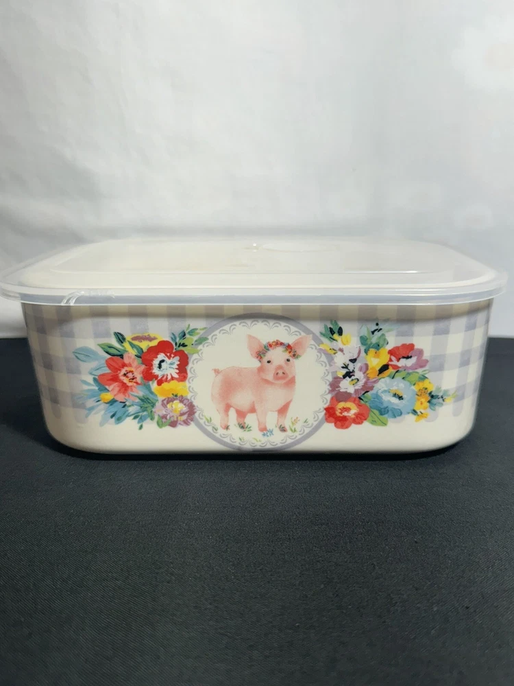 The Pioneer Woman Ceramic Food Storage Container in the Sweet Romance pattern is perfect for keeping your kitchen organized and stylish. This rectangular container measures 7.25 inches in width, 5 inches in length, and 2.75 inches in height, making it ideal for storing a range of food items. It features air vents, easy-to-clean surfaces, and is dishwasher safe, ensuring that your food stays fresh. *lid has small crack, not broken off, lid still works perfect. See pictures.