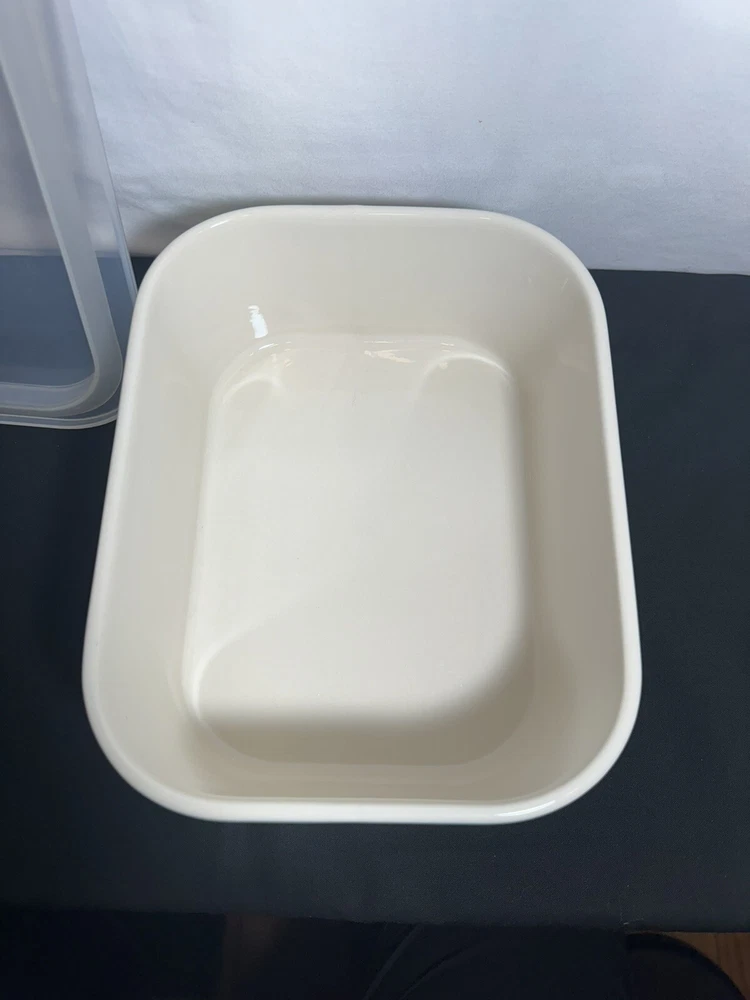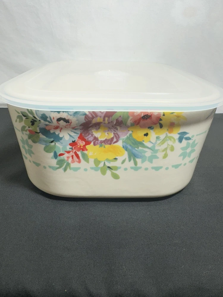 Keep your kitchen fresh and organized with this beautiful Pioneer Woman ceramic food storage container, featuring the Sweet Romance pattern. The container has a rectangular shape and measures 8.5 x 6.75 x 3.5 inches in capacity. It comes with a plastic push-on lid and has air vents for easy cleaning. *lid has scratches. Works perfect.