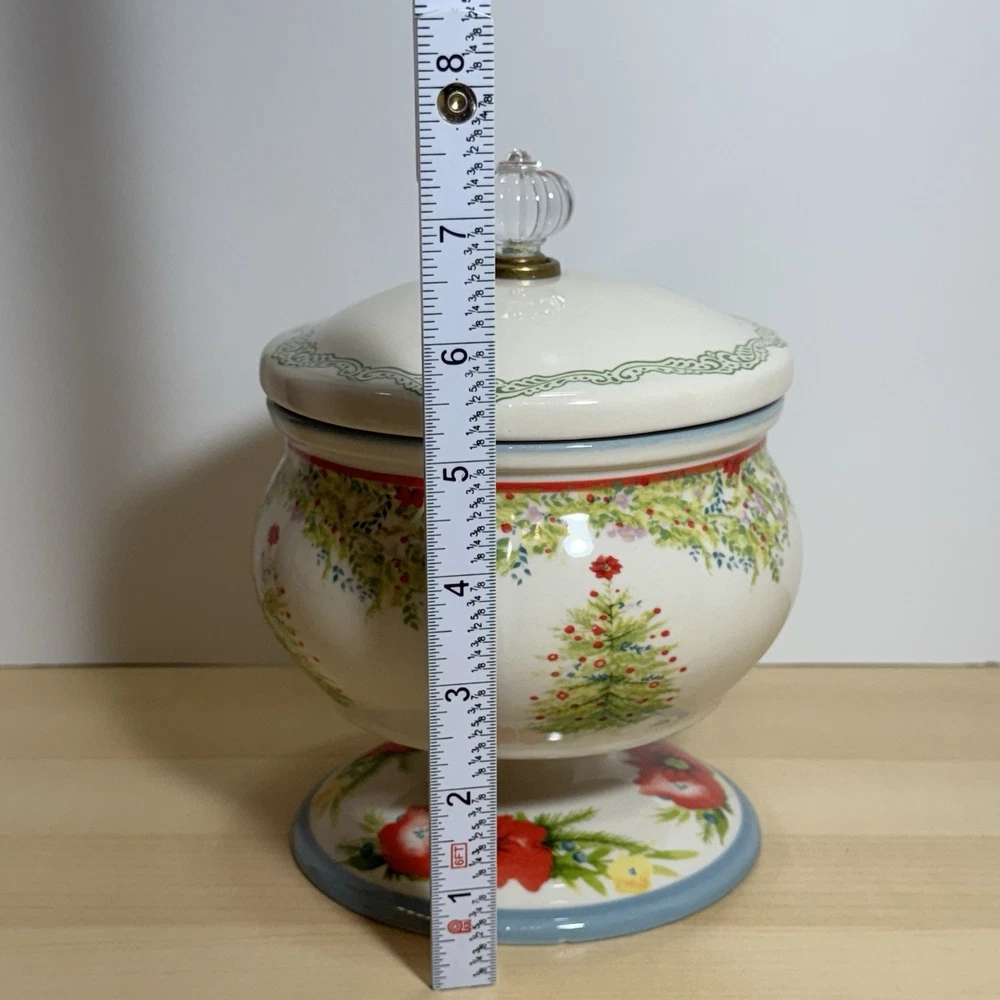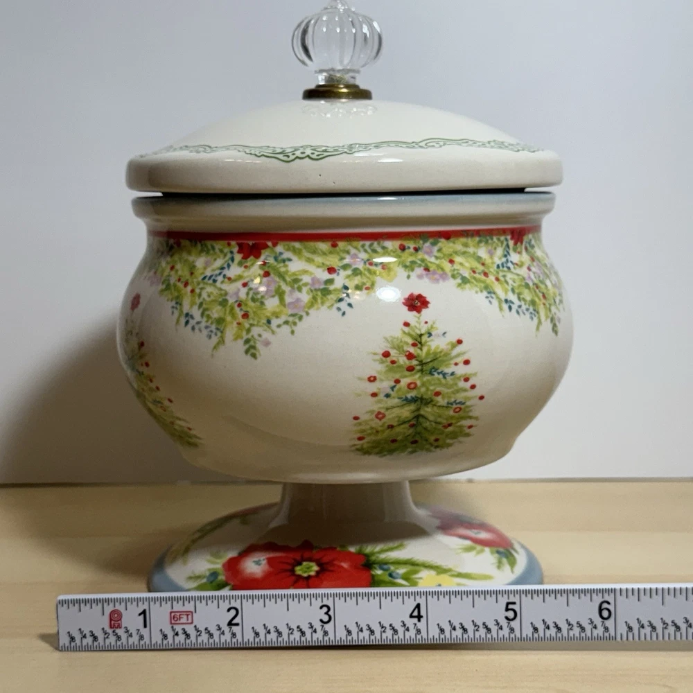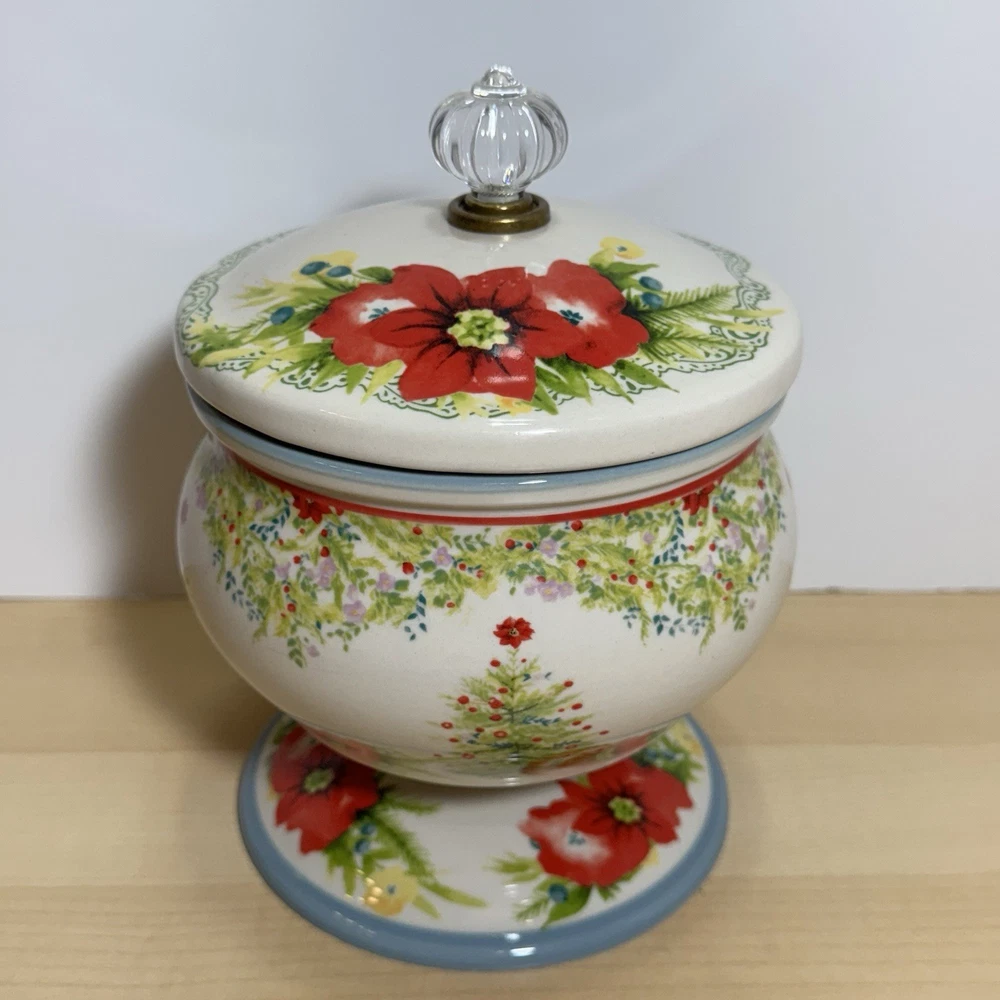 The Pioneer Woman Holiday Cheer Covered Candy Dish and Christmas Tree Storage Container is a festive addition to your holiday decor. Made of stoneware with a glossy finish, this candy dish features a multicolor design with a poinsettia and Christmas tree theme. With dimensions of 5 inches in diameter at the base and 7 1/2 inches in height with the lid, this candy dish is both functional and decorative. Perfect for any room in your home, this covered dish adds a touch of country style to your Christmas celebrations. Care instructions recommend hand washing only to maintain its beautiful design.