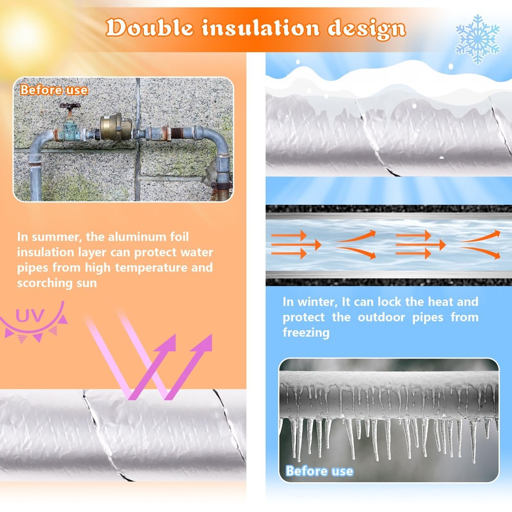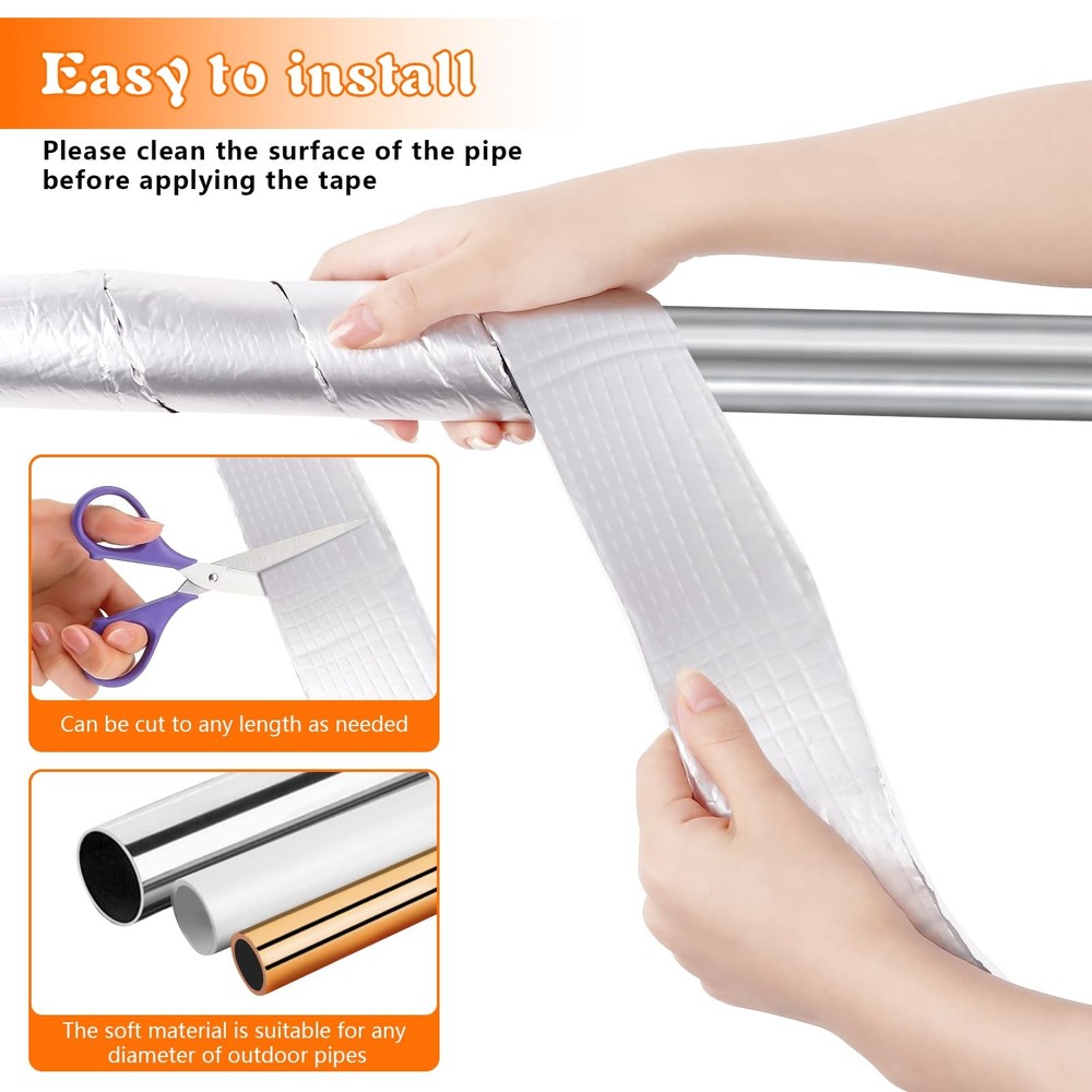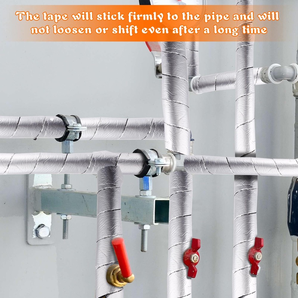 Pipe Insulation Tape Roll 2 Wide 32.8 Ft Foam and Foil Pipe Wrap Cold Hot Water EXCELLENT HEAT PRESERVATION EFFECT:The outdoor pipe insulation wrap roll is made of 0.2-inch thick rubber and plastic cotton,Excellent insulation;waterproofing;fire resistance;weather resistance,preventing pipes from freezing ALUMINUM FOIL LAYER: There is a layer of aluminum foil on the surface of the water pipe insulation wrap sleeve. Fireproof;thermal insulation;effectively extending service life. Excellent quality,will not shift or fall off STRONG SELF-ADHESIVE DESIGN: The back of the foam and foil pipe wrap insulation tape has a strong adhesive.Just peel off the film backing and stick it on.The adhesive is firm and will not loosen or move after prolonged use EASY TO REMOVE: The pipe wrap insulation tape is very easy to install and remove.No residue;cutting;tearing;peeling.It can provide fire protection for pipelines,offering excellent waterproof and antifreeze effects PRODUCT SIZE: The outdoor pipe insulation tape for winter freeze protection Size: 2 inches wide * 0.2 inches thick * 32.8 feet long,Extended size is suitable for any diameter pipe such as 3/4,1 1/4,1/2 inch.You can cut it freely Feature: Pipe insulation tape has good thermal insulation, waterproof, fireproof and weather resistance properties. It can lock the heat in winter and protect the outdoor pipes from freezing. In summer, the aluminum foil insulation layer can protect the water pipes from high temperature and scorching sun. Heat tape for water pipes can provide fire protection for pipelines, improve waterproof and antifreeze effects, and effectively extend the service life of pipelines. The flame retardant performance of aluminum foil can play a good fire prevention effect. It also has the function of heat preservation and heat insulation, which improves the effect of waterproof and antifreeze, and effectively prolongs the service life of the pipeline. The aluminum foil layer is closely attached to the rubber and plastic cotton, and will not shift or fall off. Foam and foil tube wrapped insulation tape has a strong adhesive on the back. Simply peel off the film backing and tape to the outer tube. Pipe insulation foam tube is very easy to install and remove. The extra long size can provide all-round protection for more outdoor pipes. You can bend it into any shape or cut it into desired length according to your needs, to fit more different occasions. Specification: Material: aluminum foil + foam Color: silver Unit Dimensions: 2 inches wide * 0.2 inches thick * 32.8 feet long Package includes: Item 1: 1 * pipe insulation wrap roll Item 2: 2 * pipe insulation wrap rolls Shipping We offer FREE shipping on all orders! We ship within Three business days of payment, usually sooner. We use a selection of shipping services such as UPS, FedEx, USPS etc. We only ship to the lower 48 states, no APO/FPO addresses or PO Boxes allowed. Local pickups and combined shipping options are not provided at this time. Return You can return a product for up to 30 days from the date you purchased it. Any product you return must be in the same condition you received it and in the original packaging. Please keep the receipt. Payment We accept payment by any of the following methods: PayPal Please pay as soon as possible after winning an auction, as that will allow us to post your item to you sooner! Feedback Customer satisfaction is very important to us. If you have any problem with your order, please contact us and we will do our best to make you satisfied. Contact Us If you have any queries, please contact us via ebay. We usually respond within 24 hours on weekdays. Please visit our eBay store to check out other items for sale! Thank you for shopping at our store.