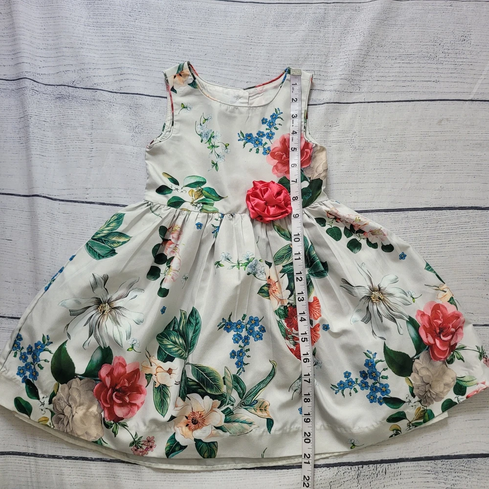 Girls White Floral Dress with Pink Rosette A blooming, twirl-worthy dress for special occasions or springtime celebrations. Allover floral print Satin finish with sheen Waist rosette detail Sleeveless fit and flare cut Excellent, pre-owned condition. No visible stains, flaws or tears. No to minimal signs of previous wear. Measurements included in photos All offers considered - make one today! Style Profile: Romantic, Spring, Floral, Easter, Garden Party, Feminine, Whimsical, Dressy, Special Occasion, Princess, Dainty, Vintage Inspired