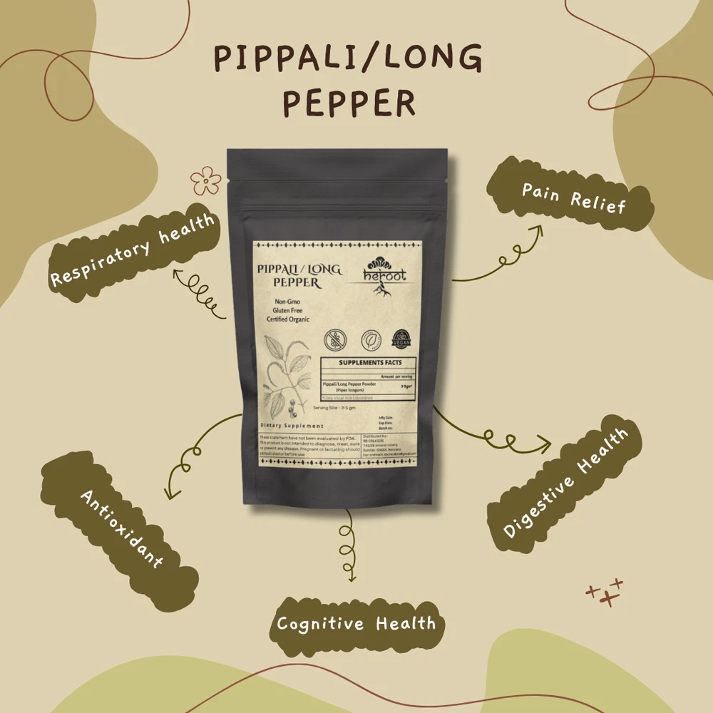 Item Weight: 50 gm Formulation: Powder Dosage: 3000mg Custom Bundle: No Features: Natural, Organic Type of Diet: Ayurvedic, Herbal, Natural Ingredients: Pepper (Piper) MPN: RB0038 Brand: Heroot Active Ingredients: Long Pepper Administration: Oral Department: Adult Body Area: Body Country/Region of Manufacture: India Expiration Date: 30-10-2027 When to Take: After Meal Type: Herb Scent: Herbal Main Purpose: Respiratory Wellness, Weight Management