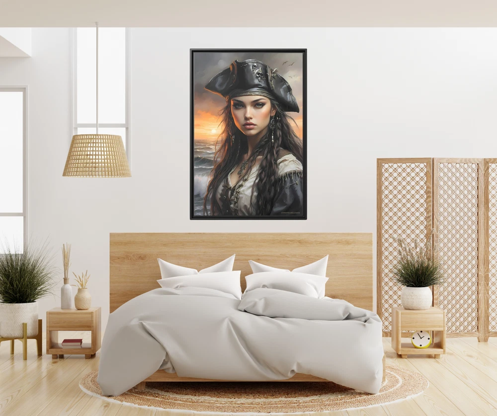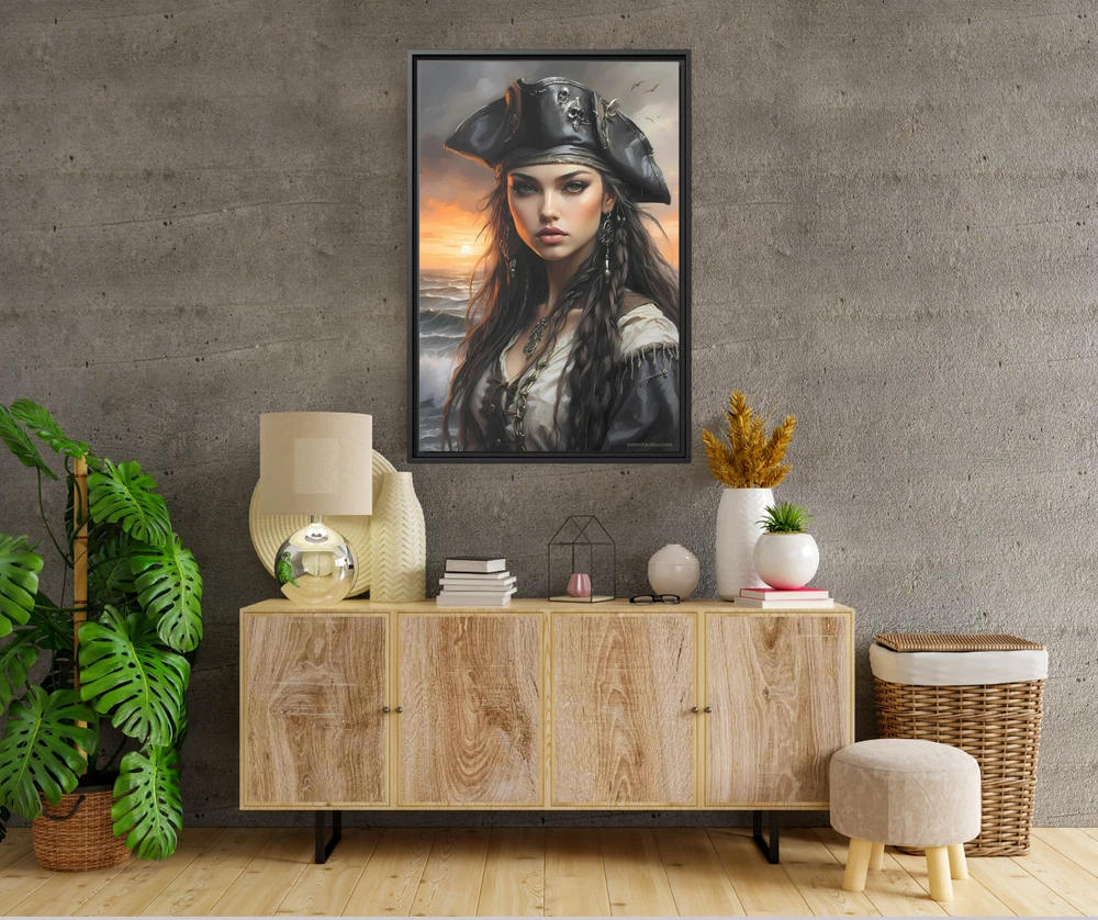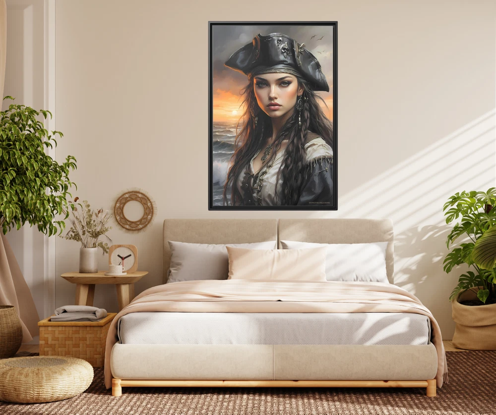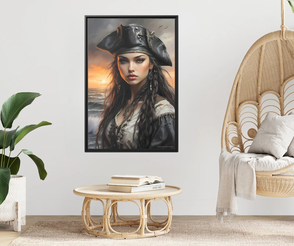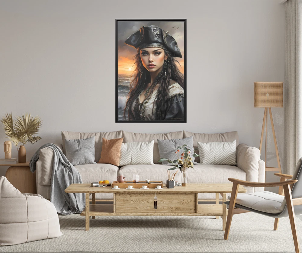 Cinematic Pirate Girl Oil Painting | Coastal Sunset Scene | Framed Gallery Wrapped Canvas Transform your space with the dramatic allure of this Cinematic Oil Painting featuring a stunning pirate girl set against a breathtaking seaside backdrop. The painting captures the golden hues of a coastal sunset, with two historic tall ships gracefully anchored in the distance. This evocative artwork blends the bold spirit of adventure with the timeless elegance of cinematic artistry, creating a visual masterpiece that feels both powerful and serene. Printed on a museum-quality cotton-polyester blend canvas, the piece is gallery-wrapped and framed with eco-friendly pine wood for a polished, sophisticated look. Its vibrant colors and intricate details make it an eye-catching centerpiece, while the ready-to-hang design ensures easy installation for immediate enjoyment. Key Features: Design: A cinematic oil painting-inspired depiction of a beautiful pirate girl, coastal sunset, and historic tall ships, evoking a sense of adventure and romance. Premium Material: Printed on a durable cotton-polyester blend canvas for sharp details and vibrant color reproduction. Eco-Friendly Frame: Encased in a sustainable pine wood frame for durability and environmental consciousness. Gallery Wrapped: The artwork seamlessly wraps around the edges, providing a modern, frameless aesthetic. Ready to Hang: Pre-installed hanging hardware allows for effortless display. Fade-Resistant: Printed with high-quality inks that maintain their vibrancy over time. Size Options: 20x30 and 24x36 Perfect for lovers of nautical themes, historical aesthetics, or bold feminine artistry, this Pirate Girl Oil Painting adds an adventurous yet elegant touch to any home or office. Whether displayed in a living room, study, or coastal retreat, it’s a striking piece that tells a captivating story of the sea. * Shipping to Alaska, Hawaii, and unincorporated territories of the United States can take additional 7 ? 12 business days, weather permitting.